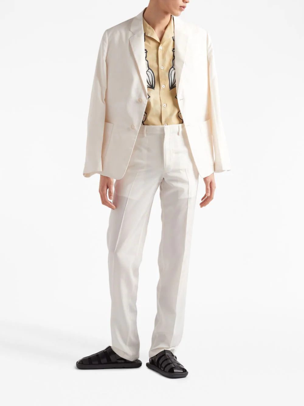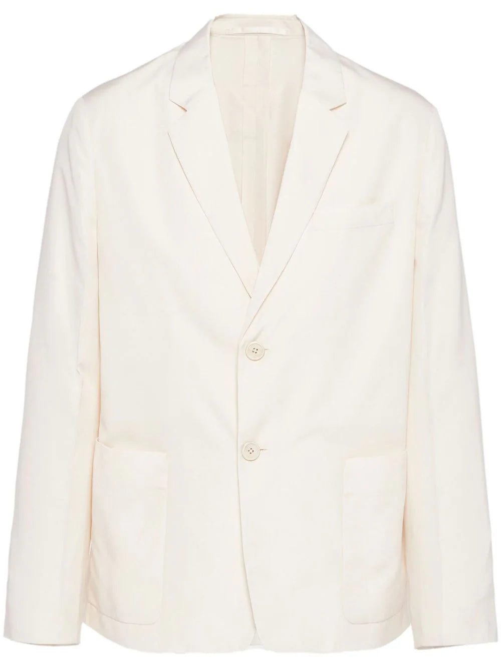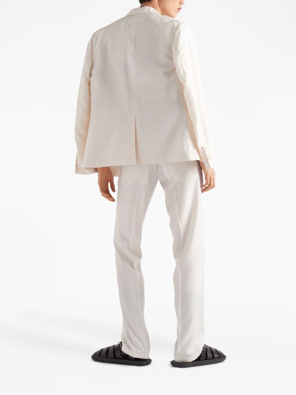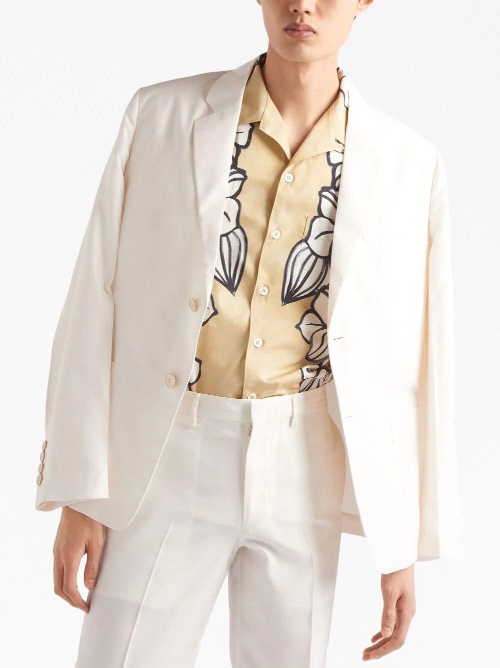 This single-breasted jacket exemplifies Prada's love of traditional craftsmanship accented with contemporary elements. Made in Italy from off-white silk, this garment's basic design is accented with the triangle logo, which has been simplified and reinterpreted in a tonal fabric at the rear.