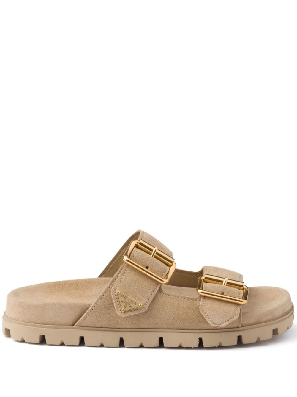 These Prada's slides are crafted from suede in a beige hue. Completed by rubber soles with a lug tread, they're adorned with the brand's enamel triangle logo plaque, referencing archival codes.
