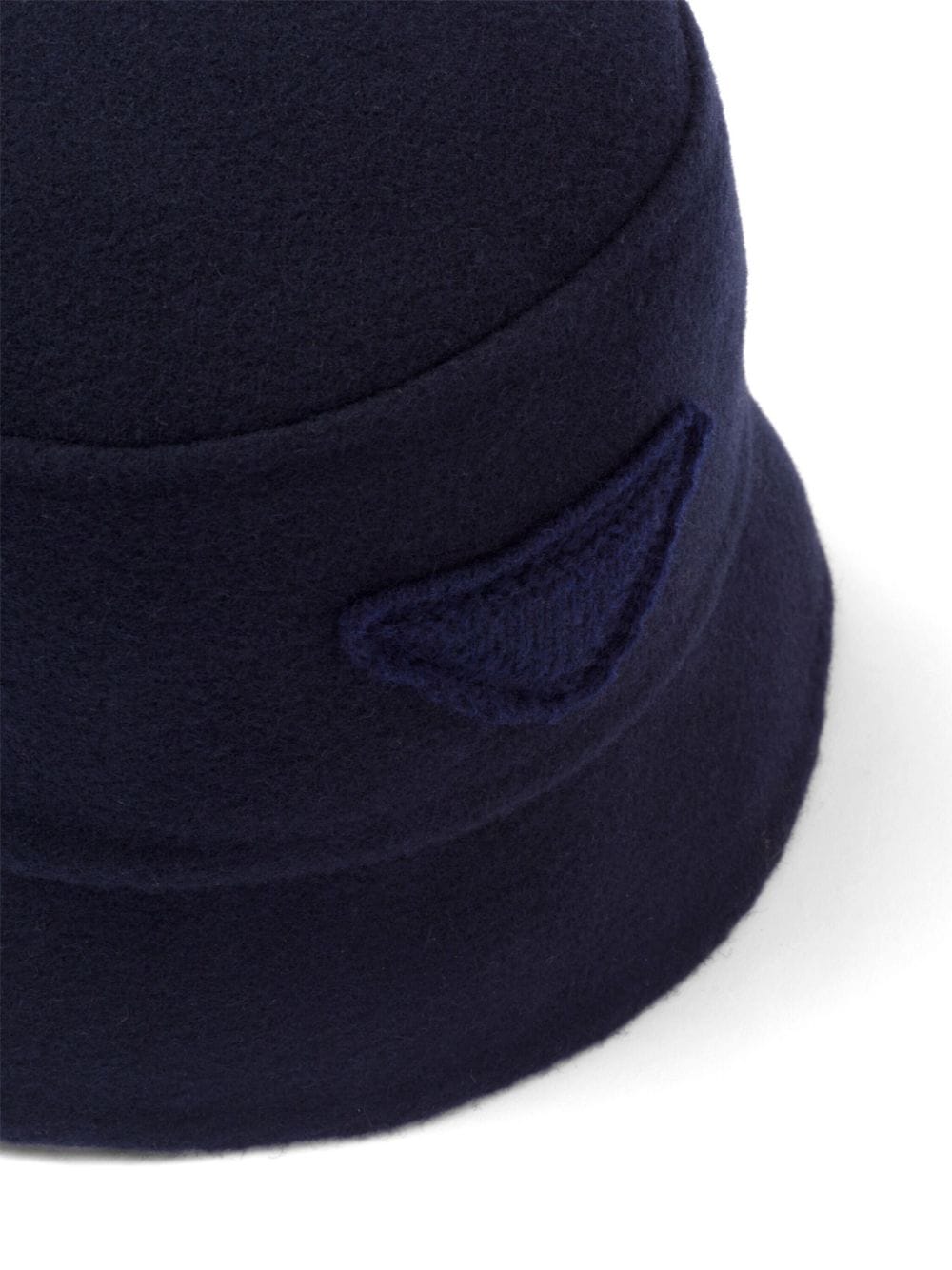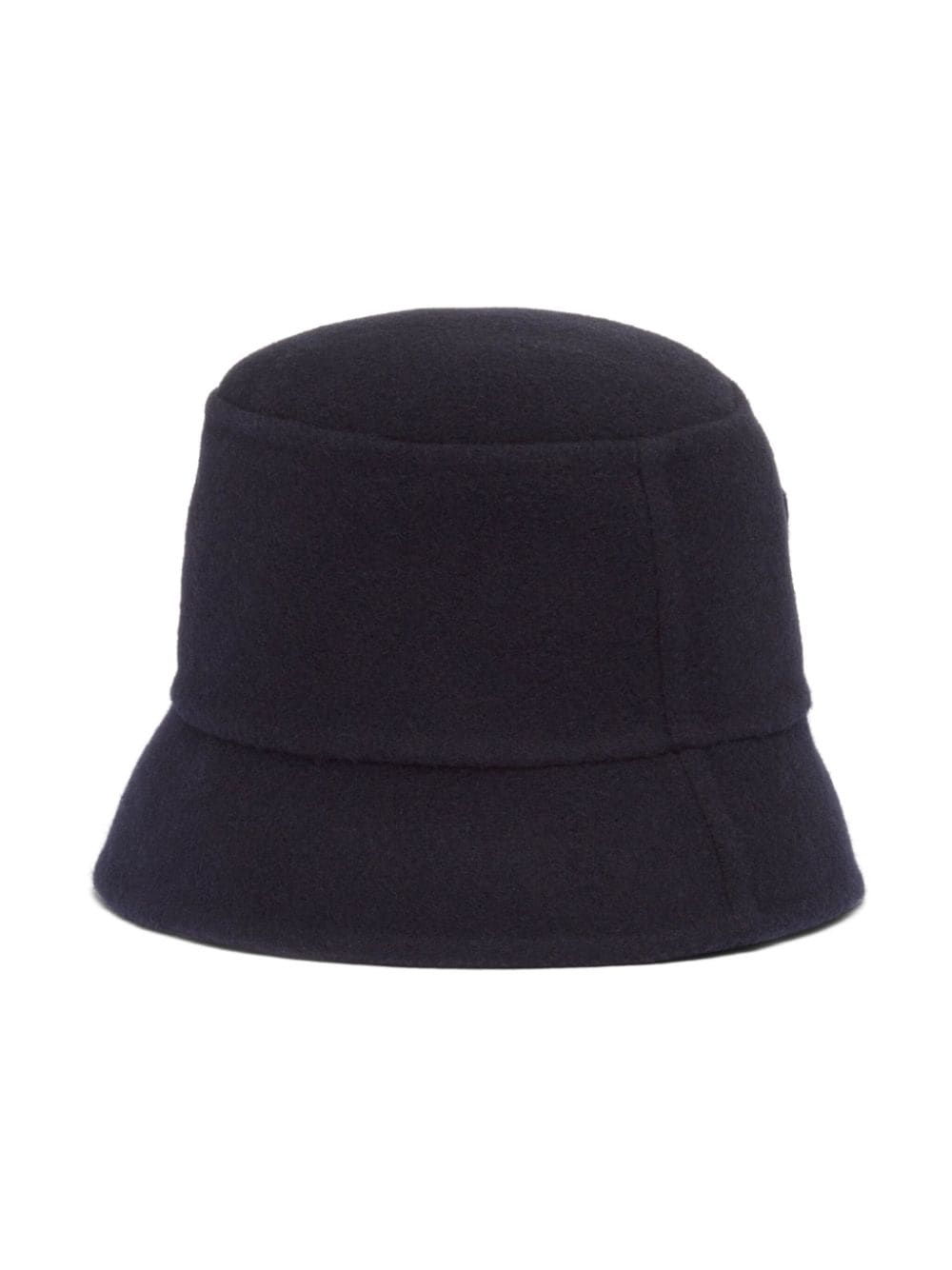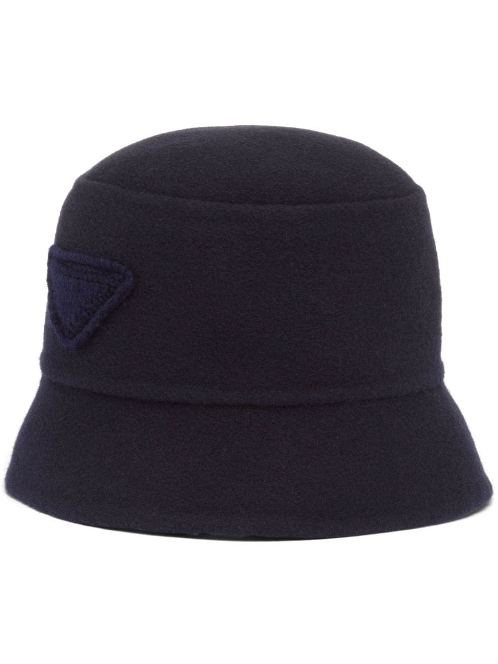 Crafted in Italy from velour cloth for added warmth, this navy bucket hat from Prada draws inspiration from retro styles. It is fitted with a dropped narrow brim and tonal triangle patch for a recognisable flair.