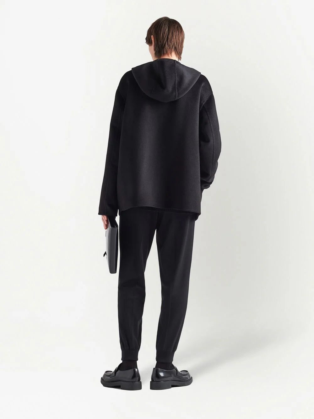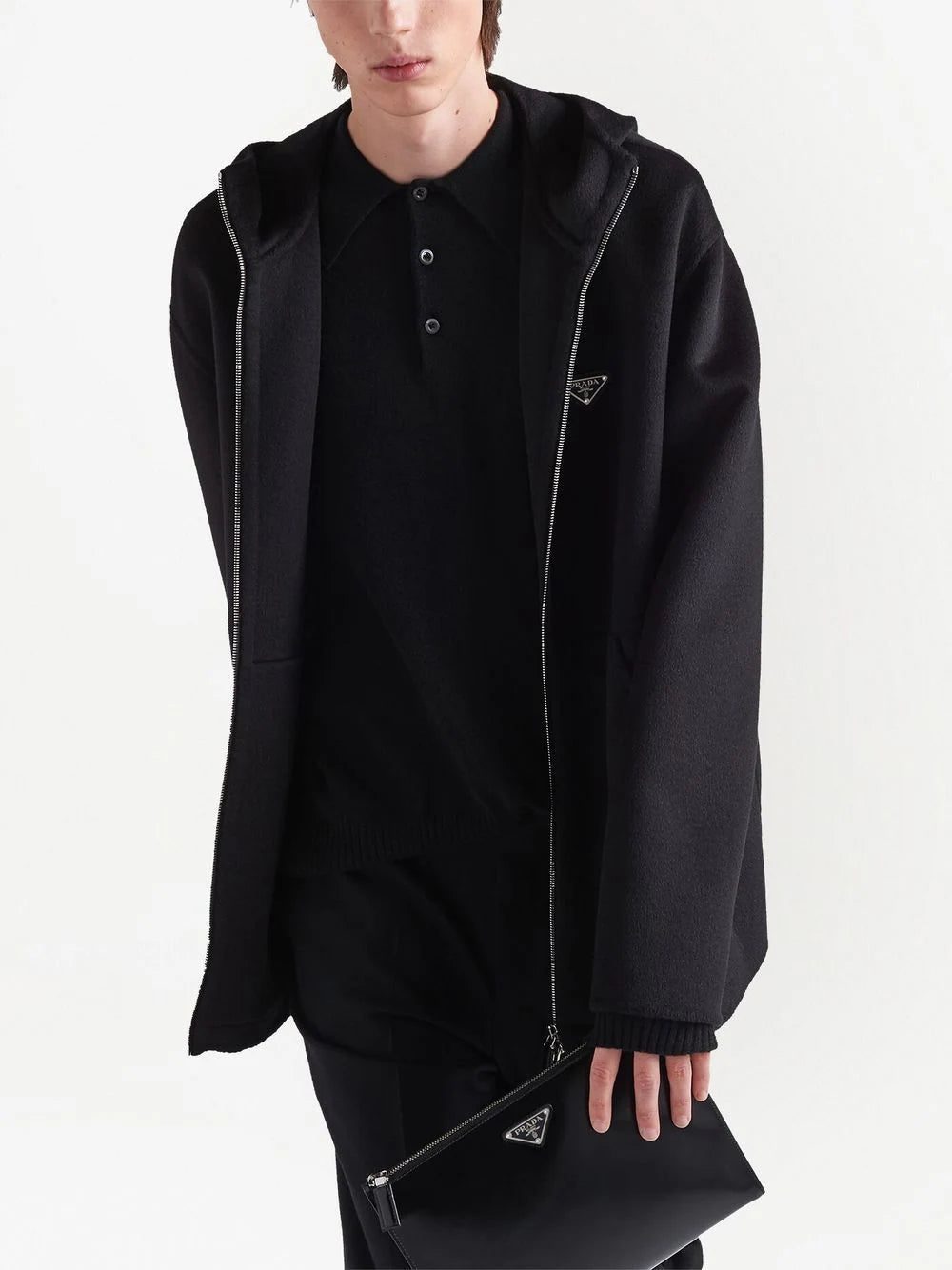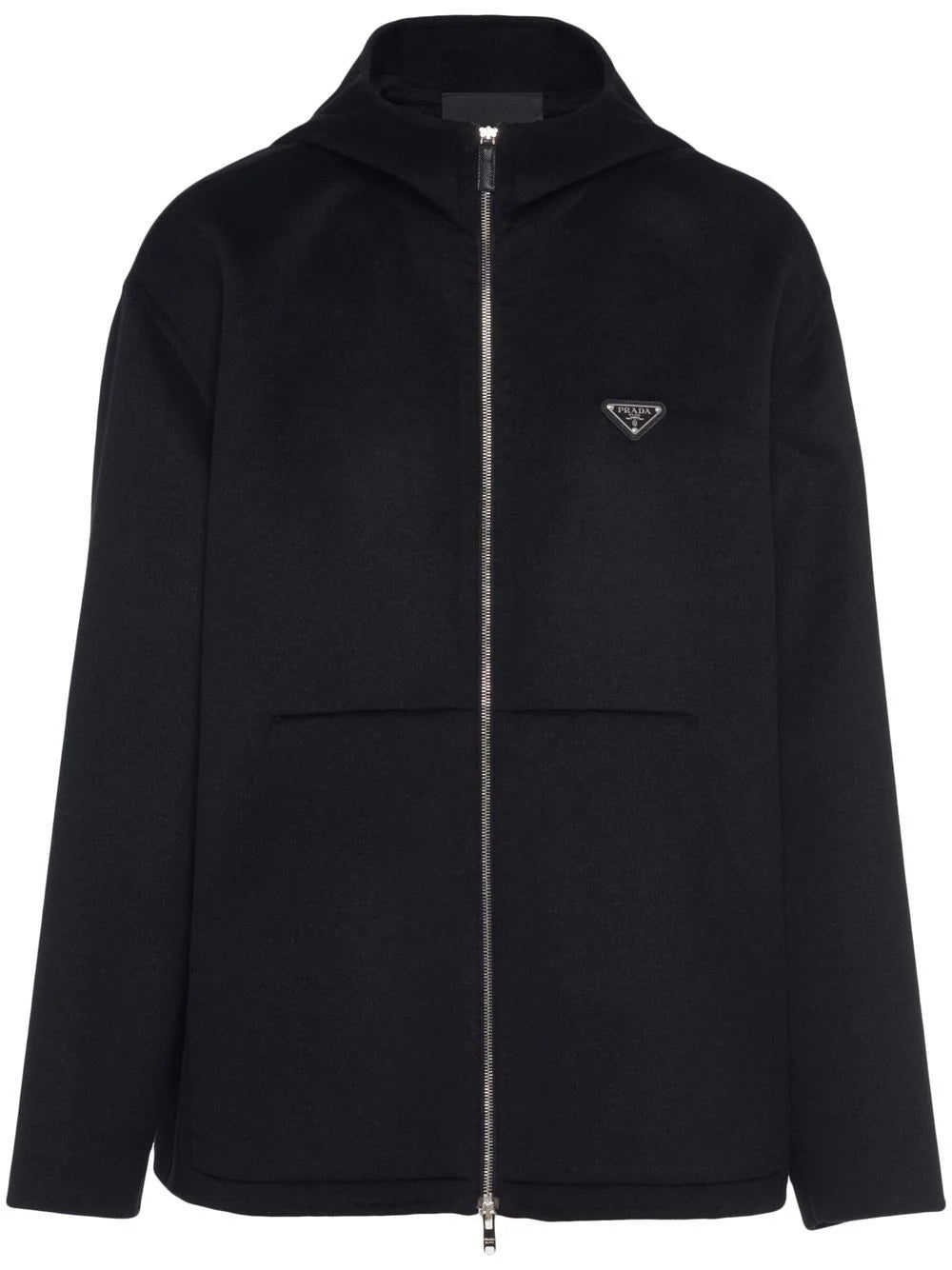 black wool triangle logo front two-way zip fastening two front pouch pockets classic hood long sleeves long length