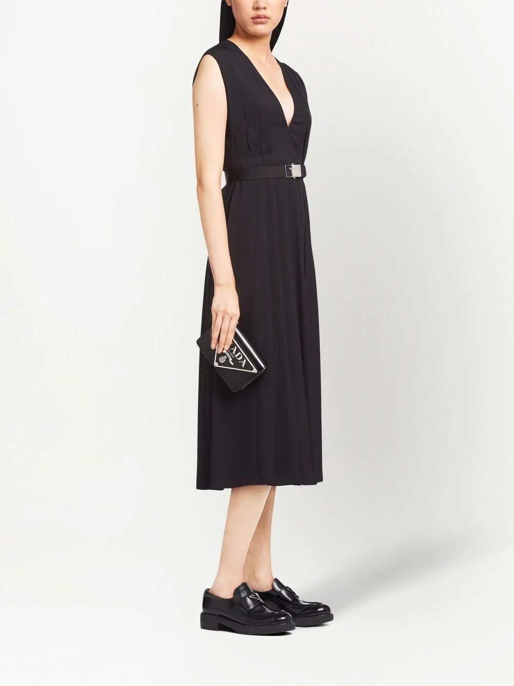 Prada's shoulder bag spotlights the brand's iconic triangular logo. Here, the emblem decorates the foldover flap and the sliding drawstring on the detachable shoulder strap.