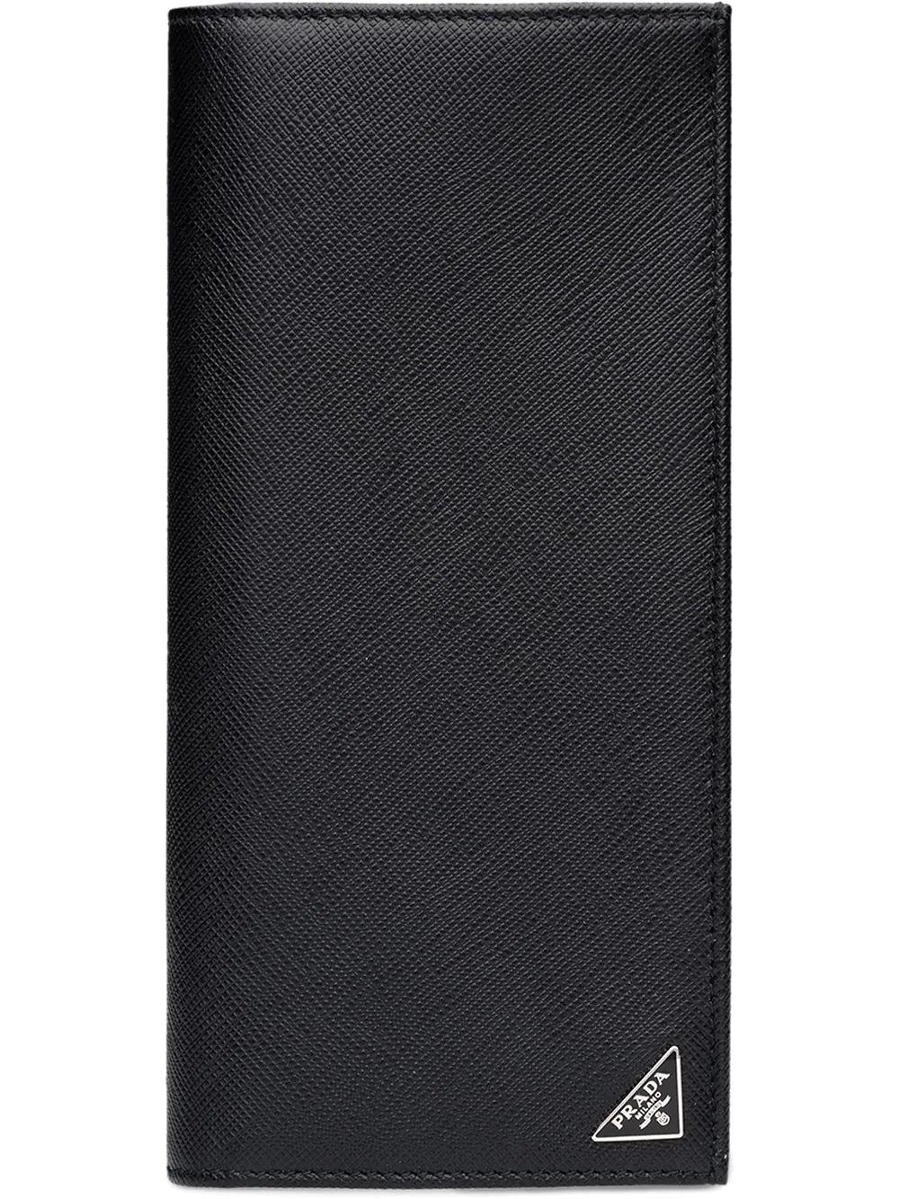 Black leather vertical bi-fold wallet from Prada featuring a main internal compartment, an interior zipped compartment and multiple interior card slots.