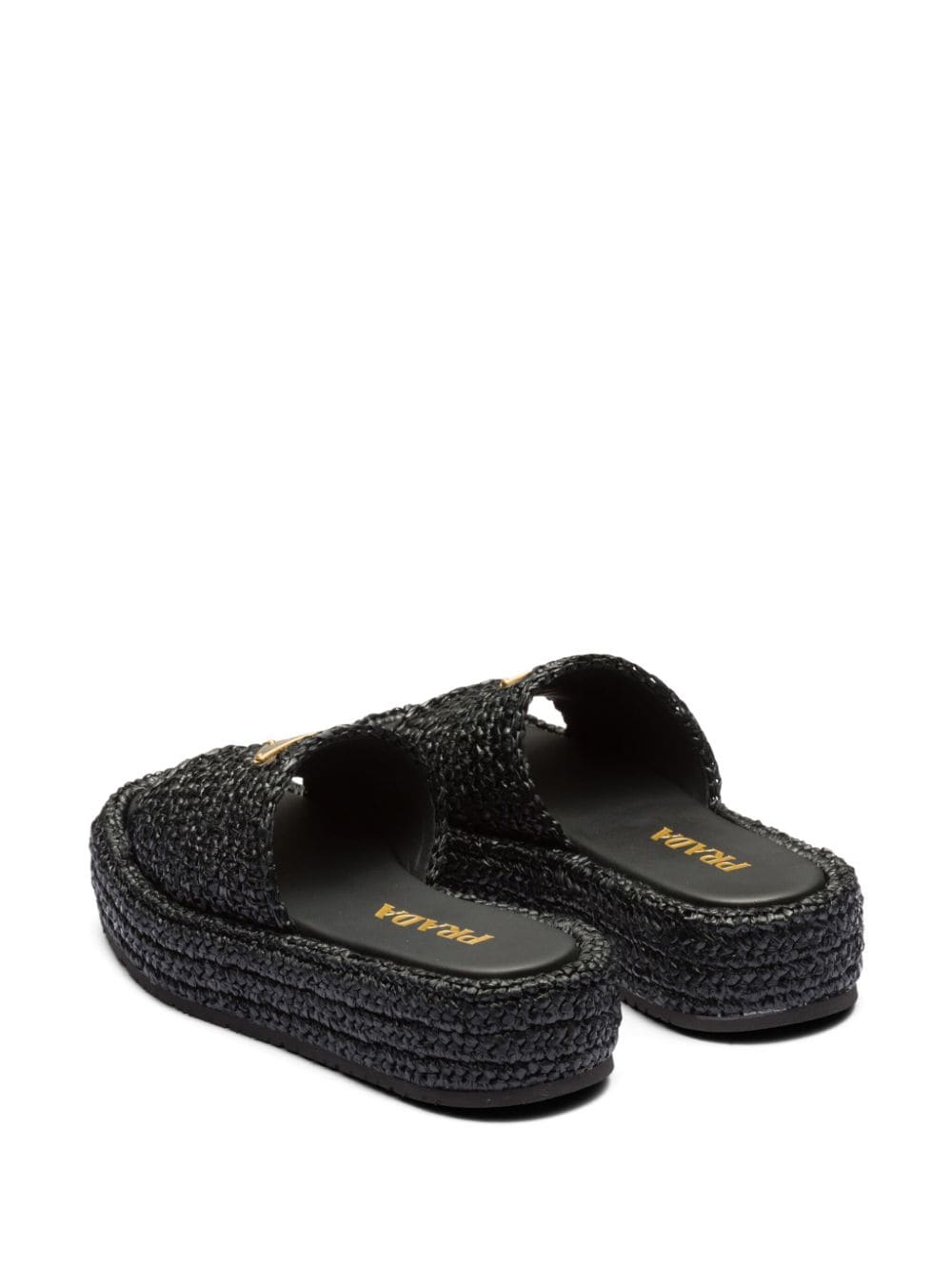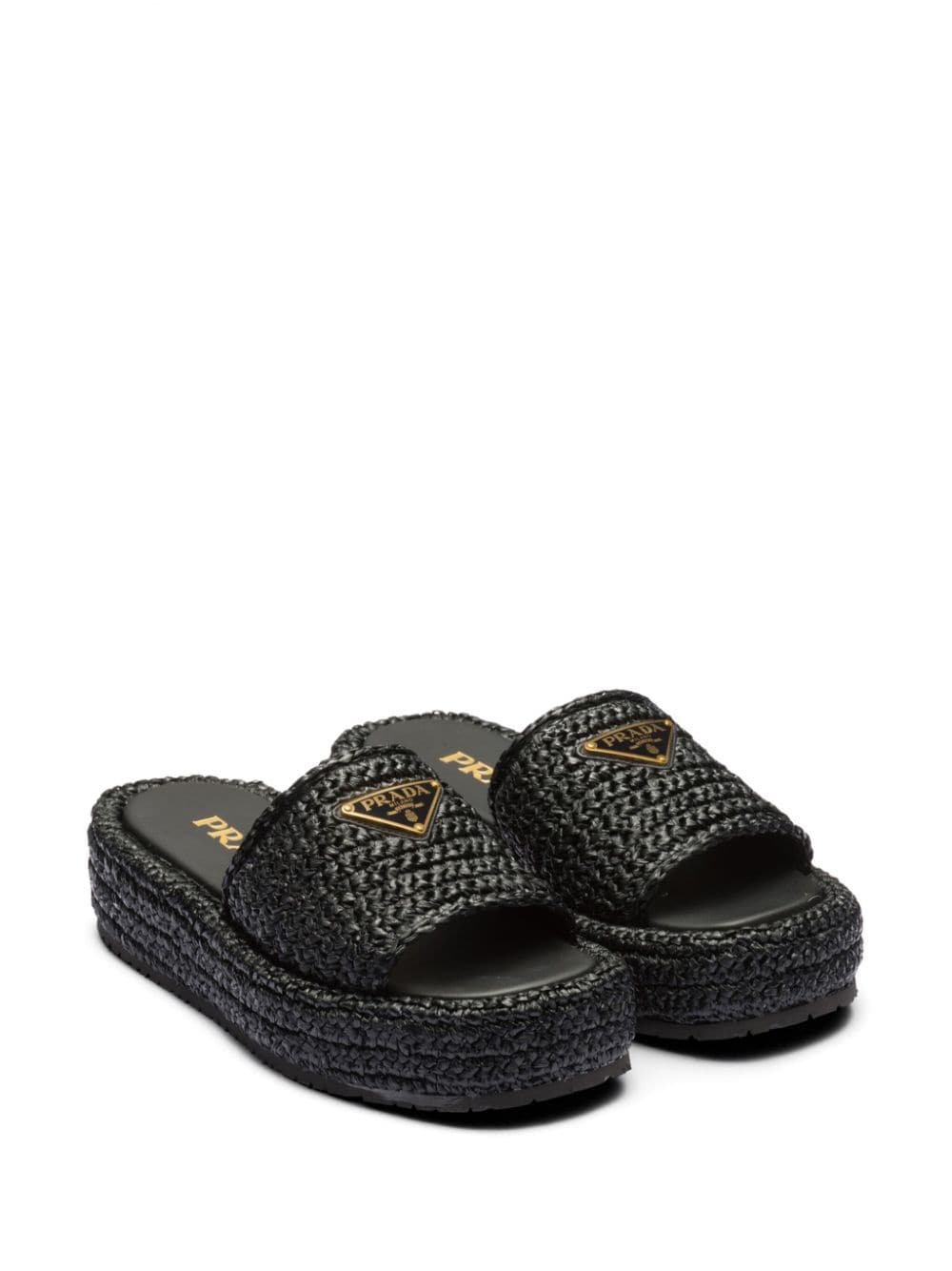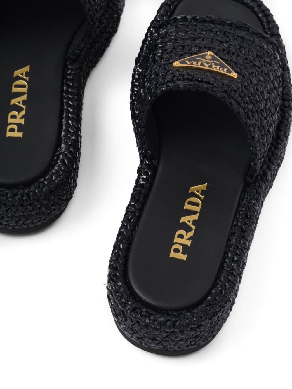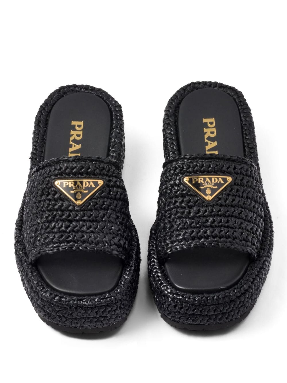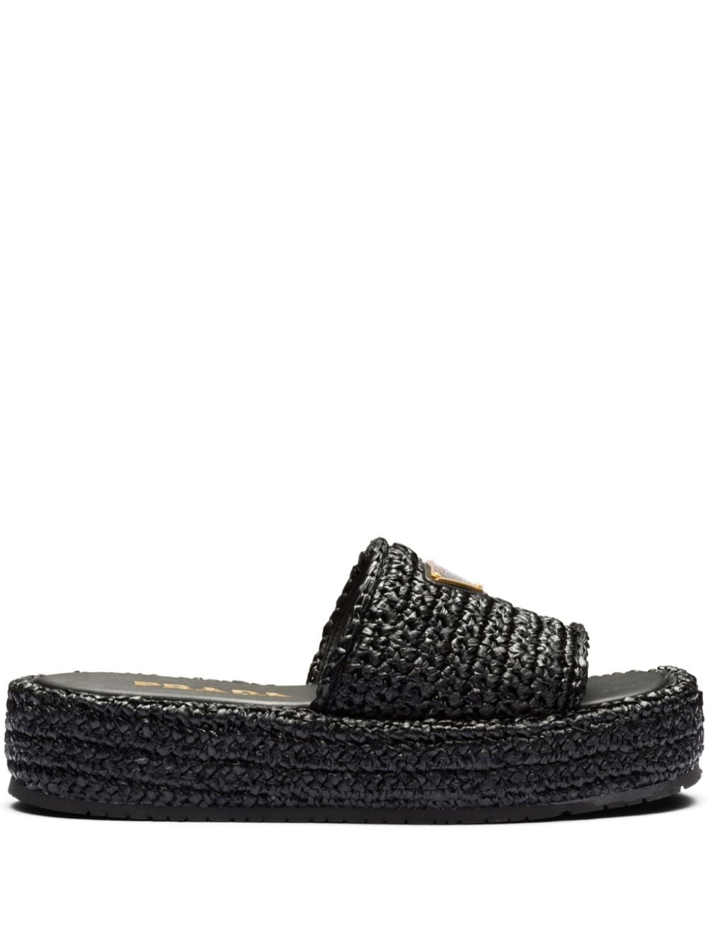 Prada's flatform slides are crafted from woven raffia that's punctuated with the signature enamel triangle logo on the back — a motif first seen in 1913 on trunks designed by Mario Prada.