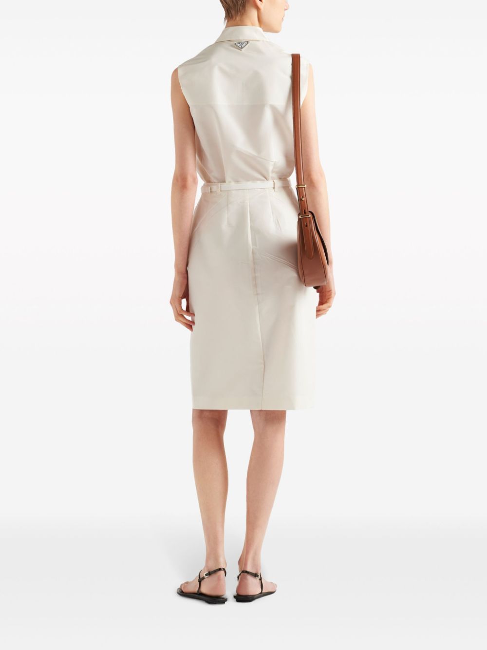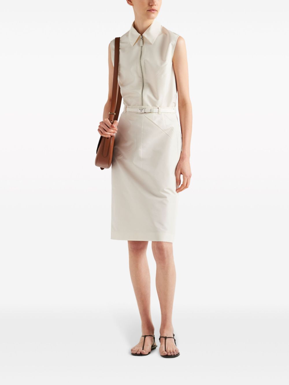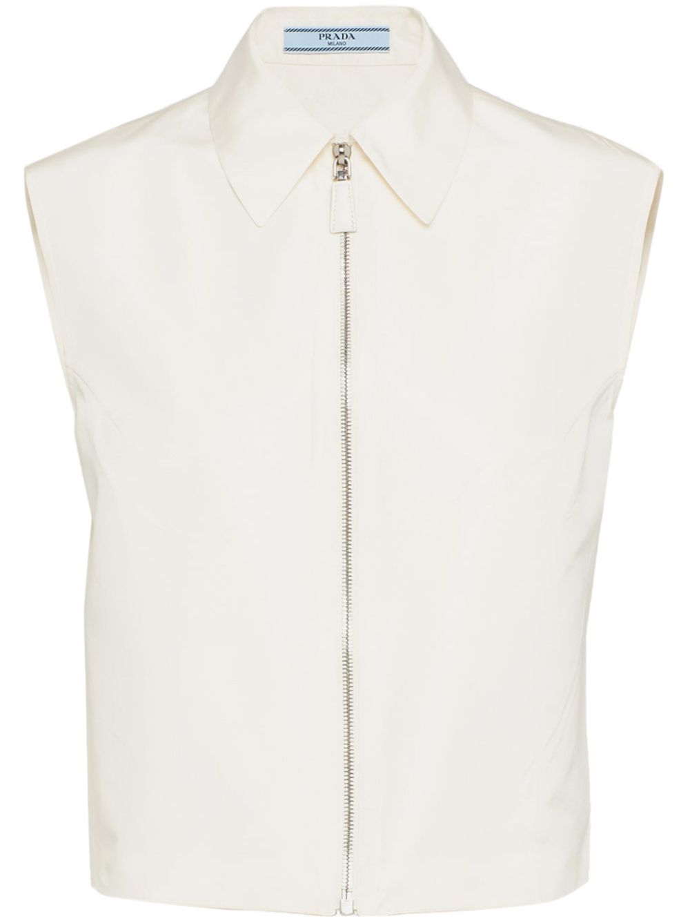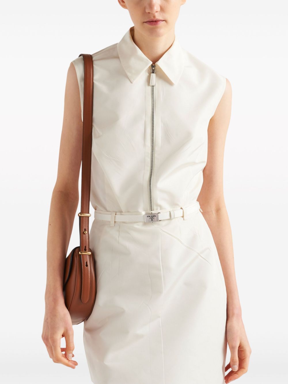 Clean and minimalist, this white Prada shirt is characterised by its sleeveless zip-up design and signature enamelled triangle logo appliqué – an iconic emblem that dates to 1913. It’s cut from lustrous faille to hold the straight silhouette.