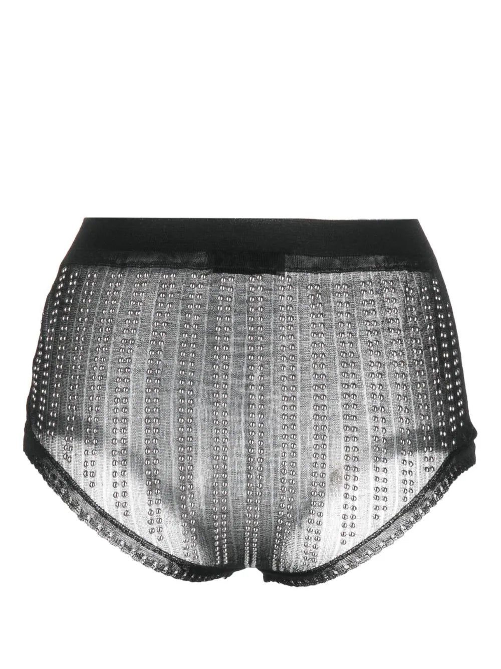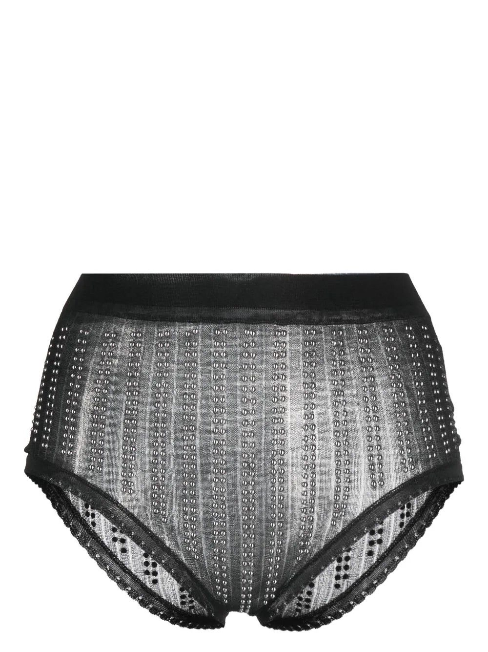Grunge influences, sensual silhouettes and strong shapes make up the foundations of Paco Rabanne's SS23 collection, as evidenced by these black high waist briefs. They're elevated by metallic bead embellishments and picot lace trims, emphasising the punk inspirations.