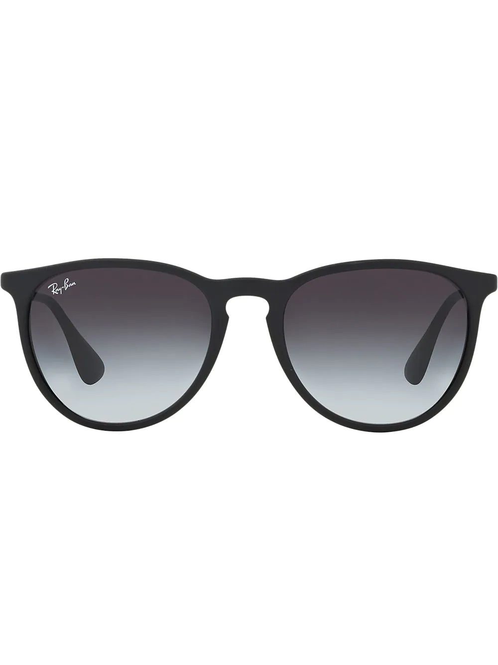 Black Erika round-frame sunglasses from Ray-Ban featuring 100% UV protection, a logo at the temple, straight arms with angled tips, round frames, gradient lenses, a logo decal on the lens and grey gradient lenses. This item comes with a protective case.