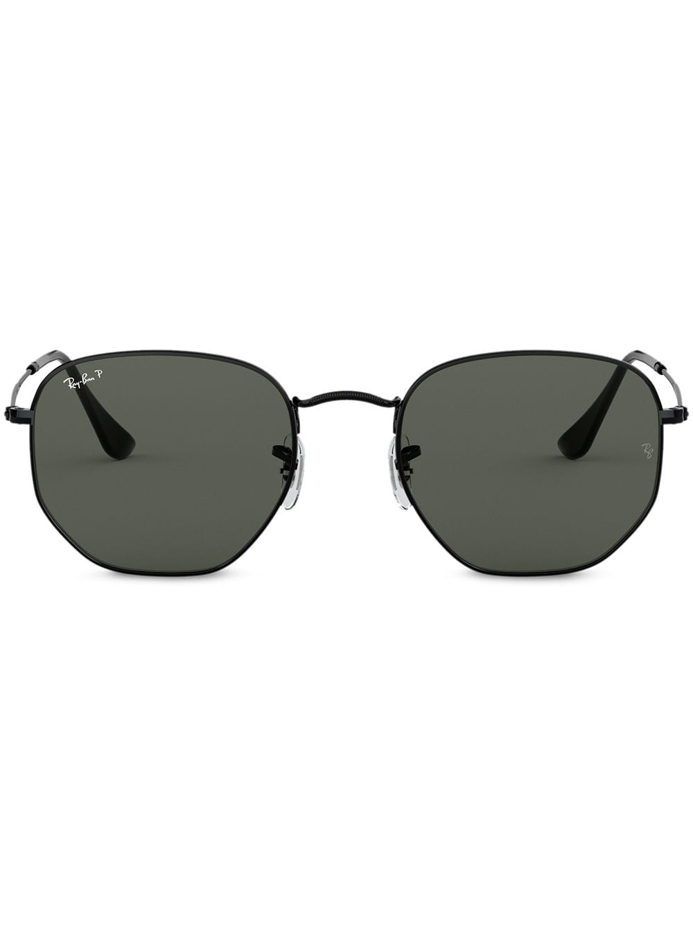 Black metal hexagonal shaped sunglasses from RB featuring dark tinted lenses and straight arms with curved tips. This item comes with a protective case.