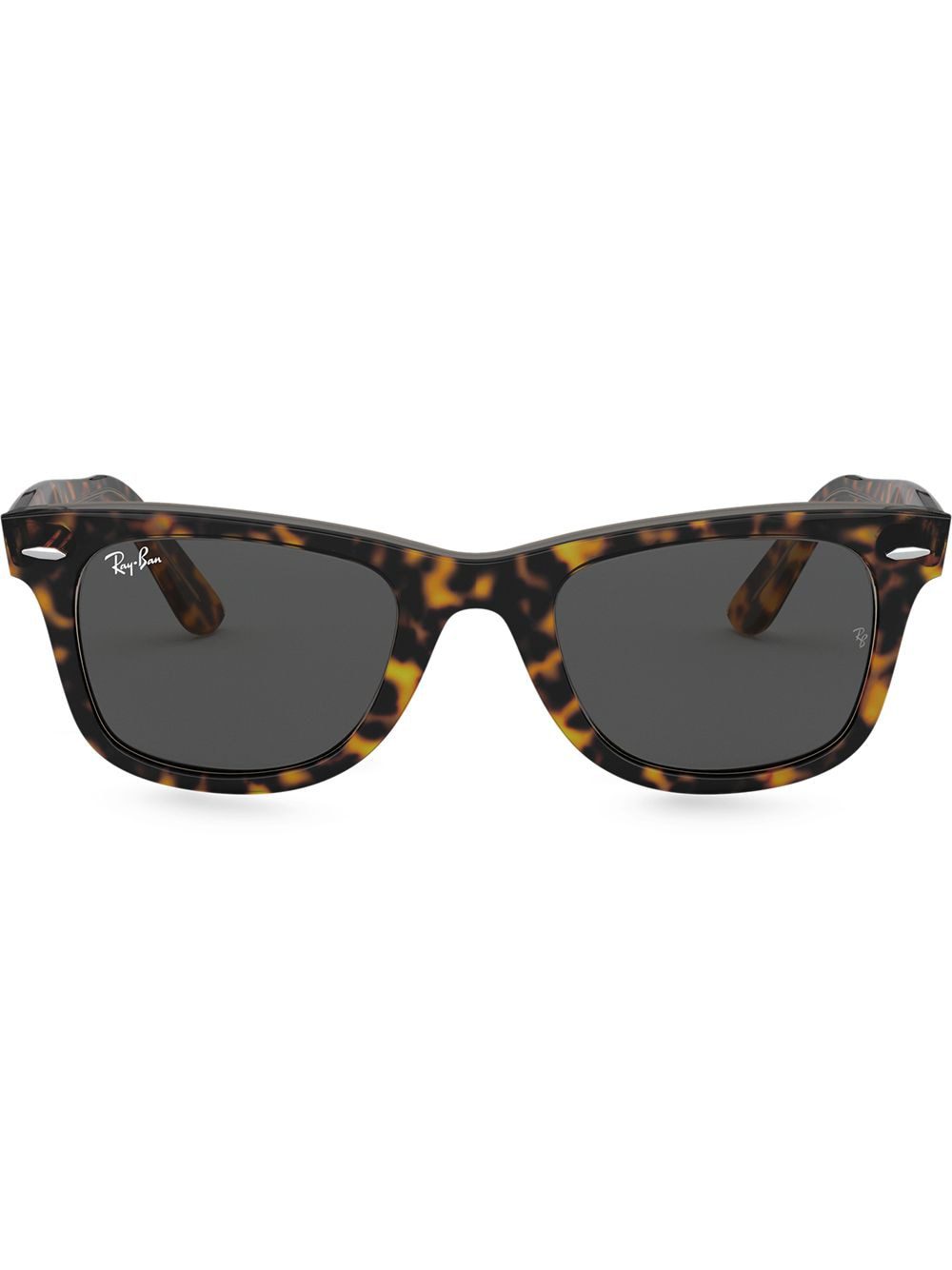 Transparent tortoiseshell acetate RB2140 Wayfarer Ease sunglasses from RB featuring a tortoiseshell effect, square frames, a logo decal on the lens, straight arms with angled tips, tinted lenses, a logo at the temple and polarised lenses. This item comes with a protective case.