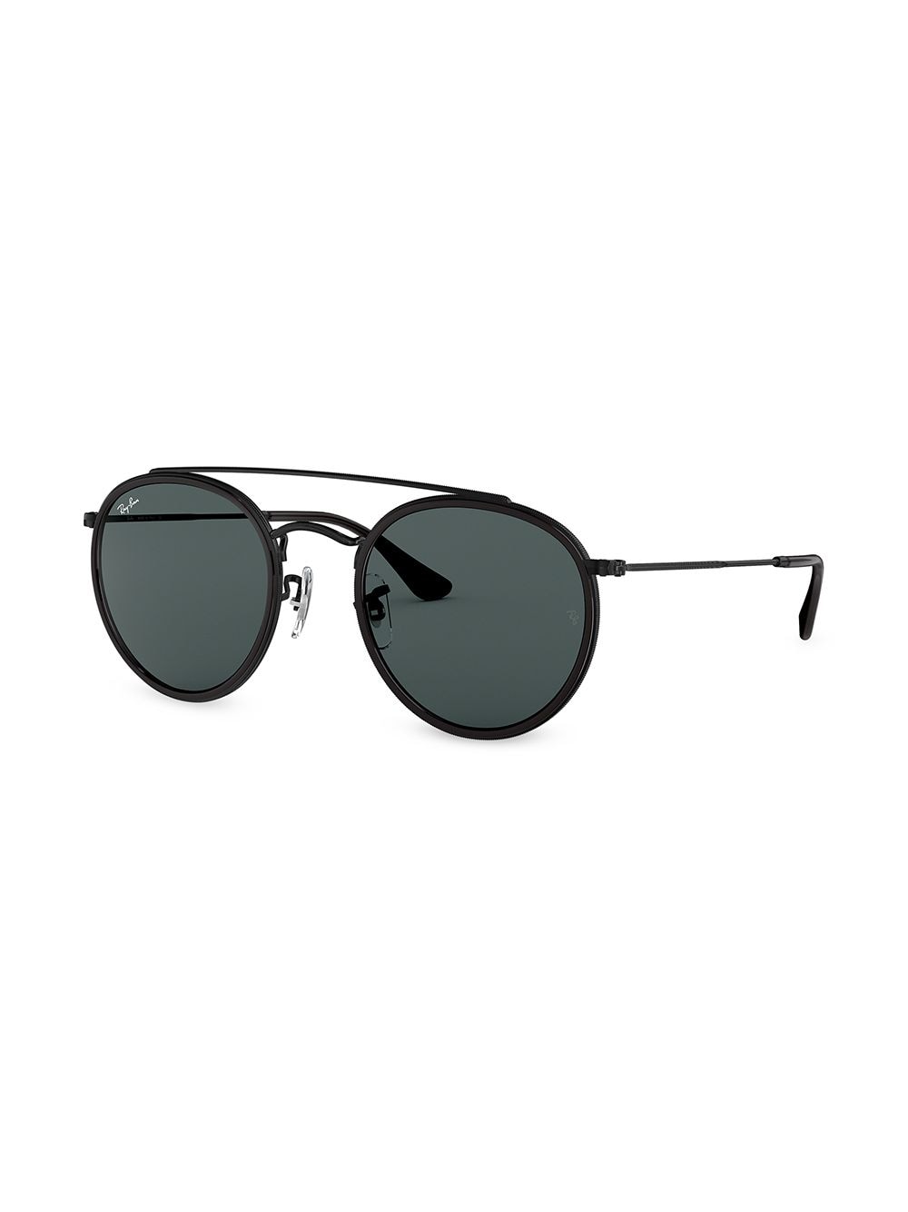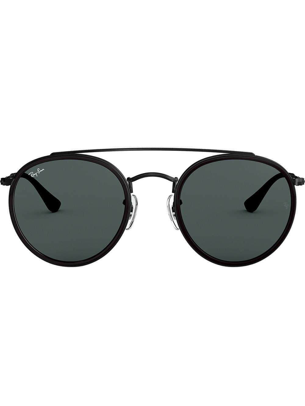 Black metal RB3647 round double-bridge sunglasses from RB featuring round frames and dark tinted lenses. This item comes with a protective case.