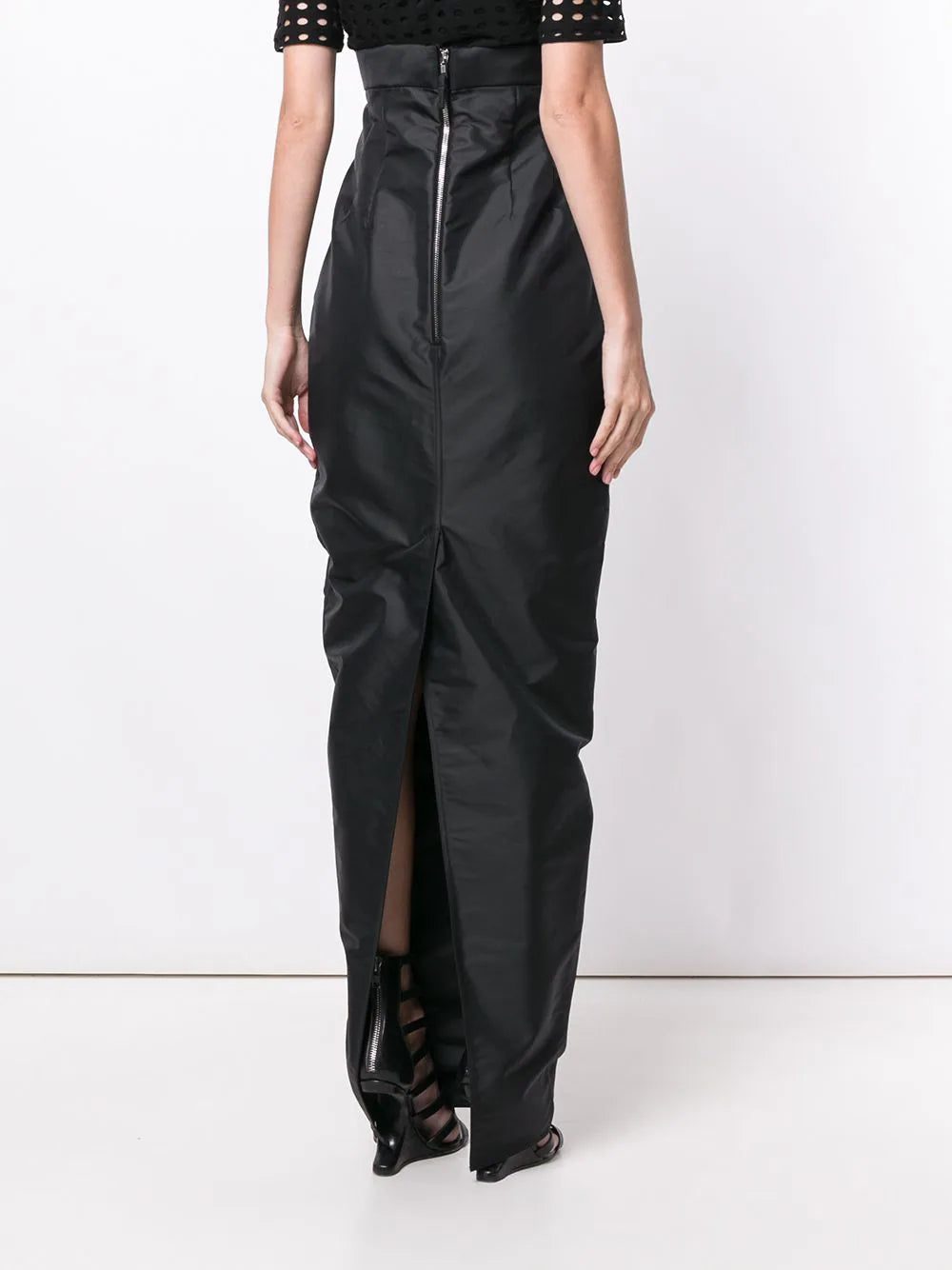 Rick Owens is renowned for his avant-garde aesthetic that pushes the boundaries of traditional shapes. This black cotton blend Pillar skirt from Rick Owens features a high rise, a rear zip fastening and a back slit at hem.