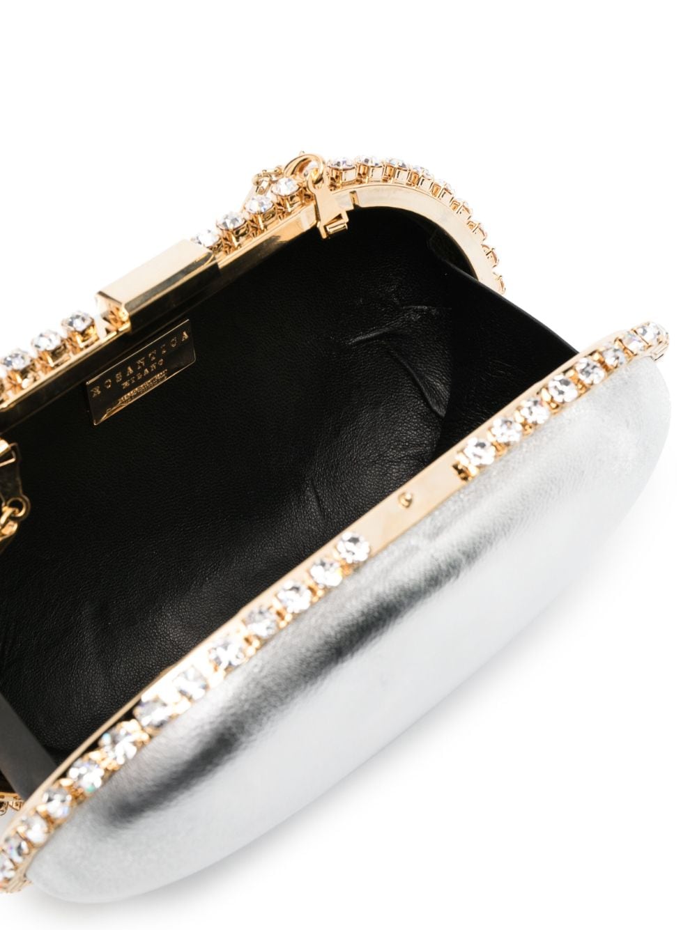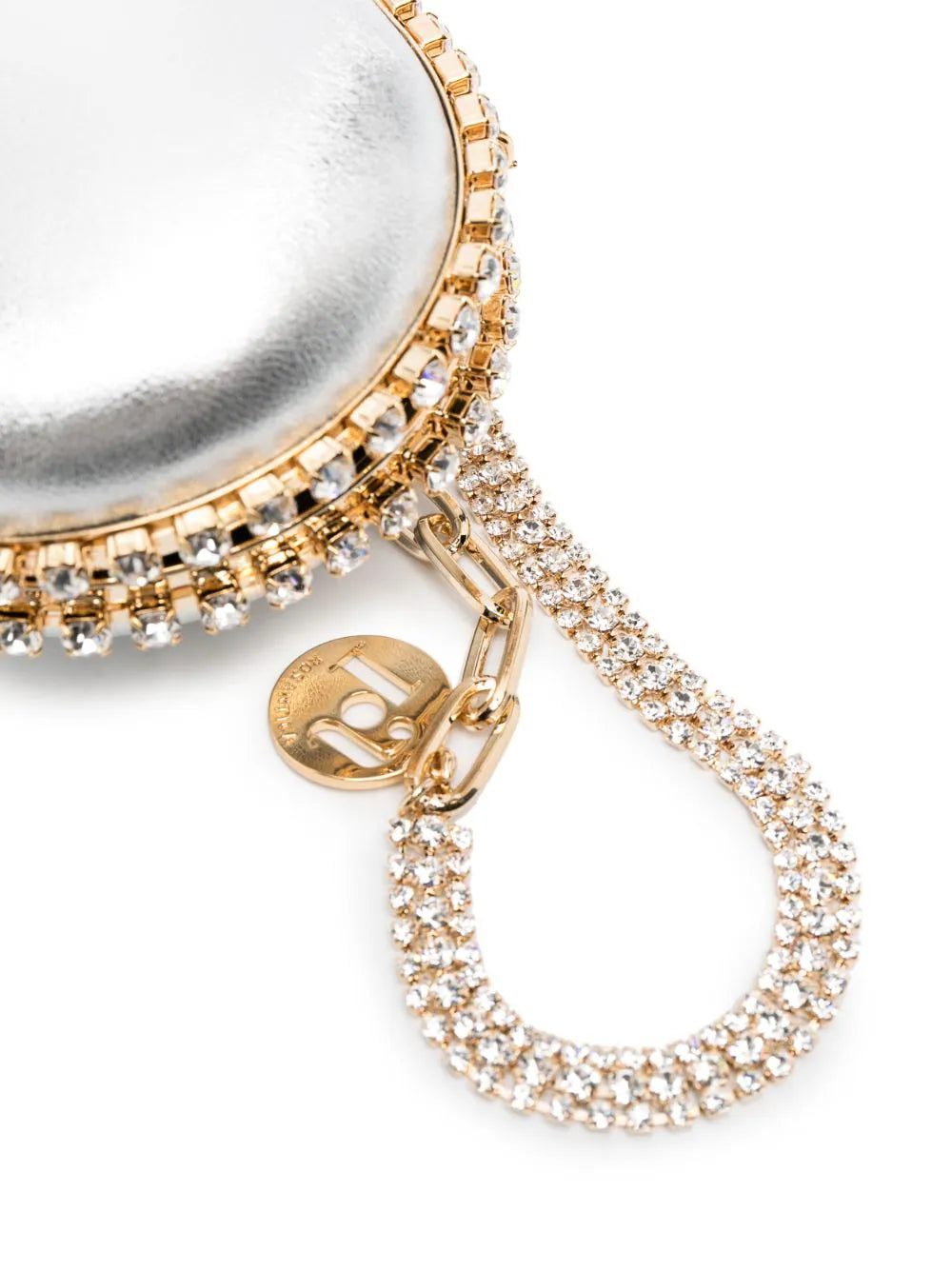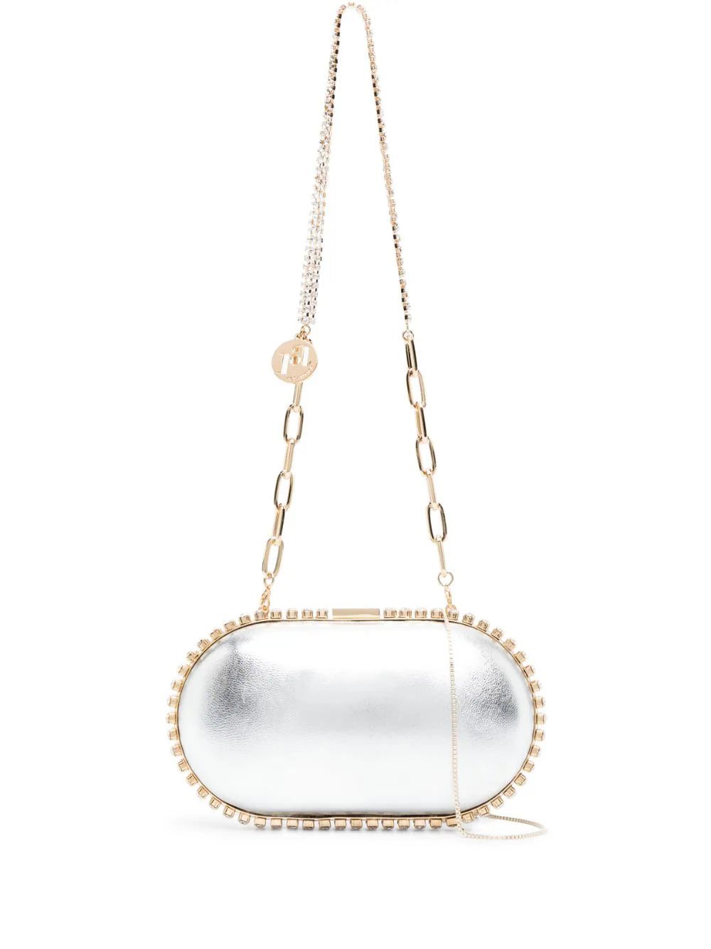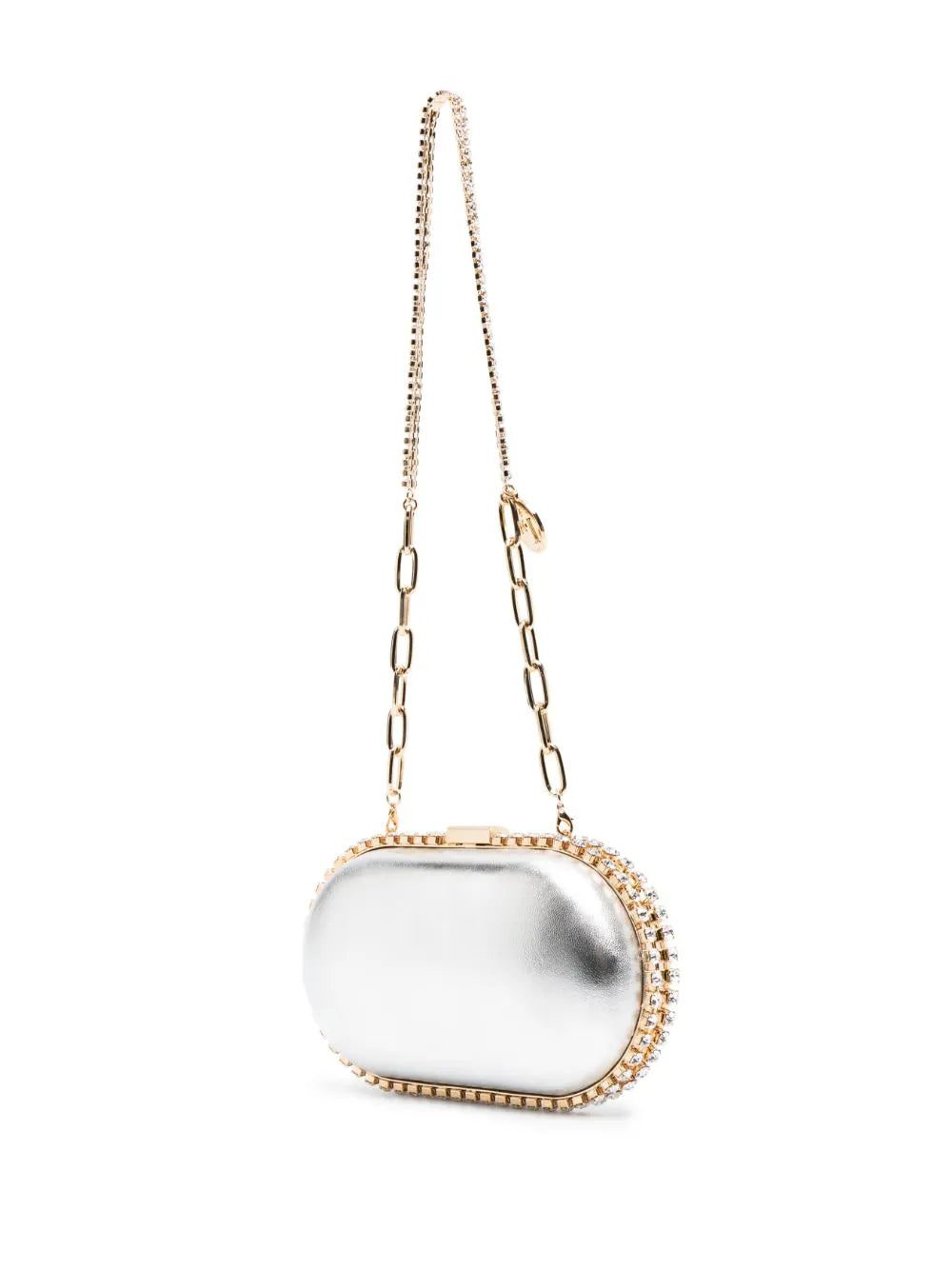 Rosantica’s Clio bag is as versatile as it is glamorous. Crafted in metallic silver leather to a structured oval silhouette, it’s framed with rows of glistening crystal-embellished chains to match the detachable shoulder and crossbody straps.