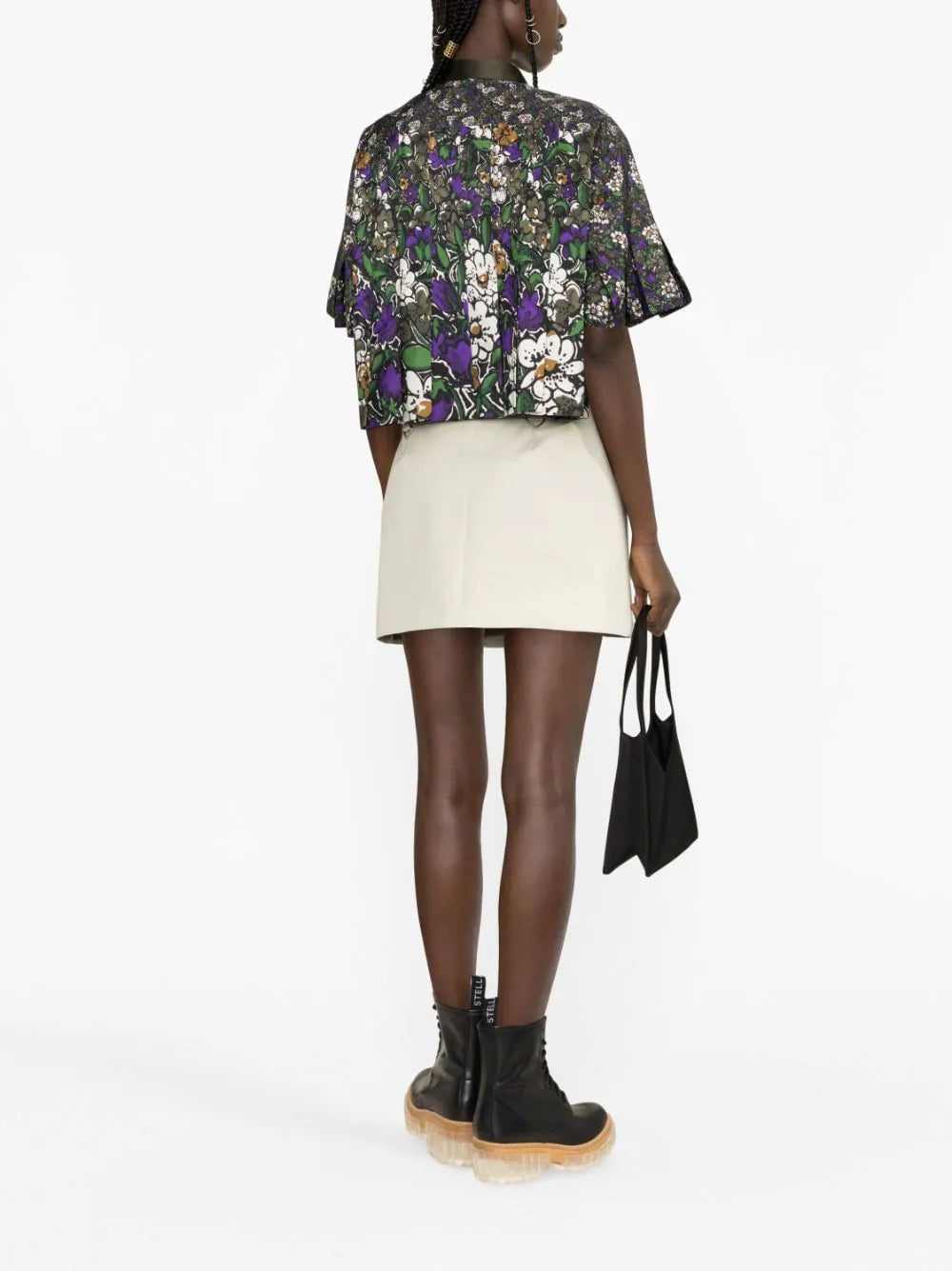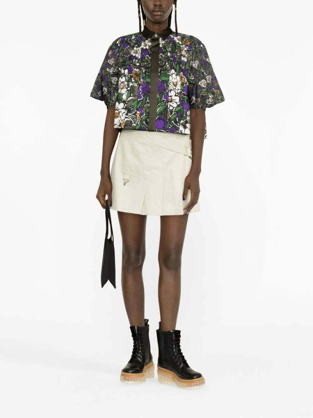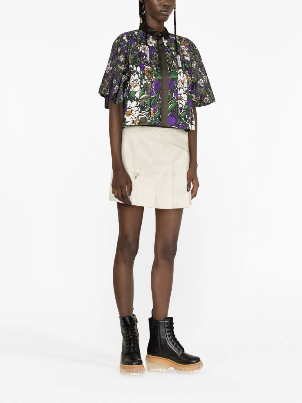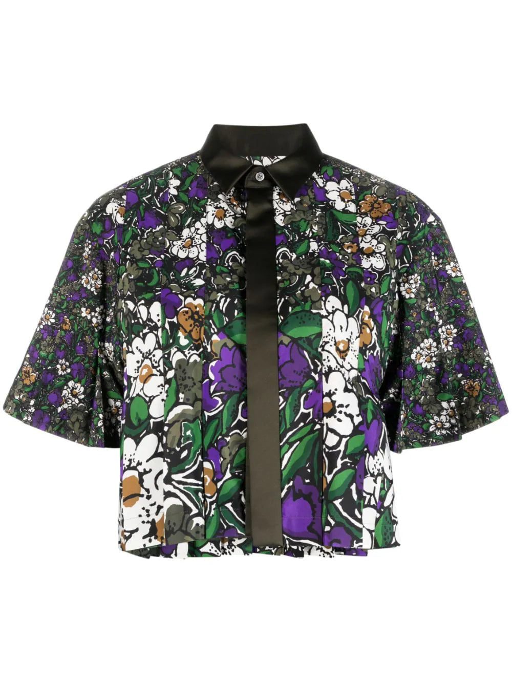Cut to a contemporary cropped length, this shirt from sacai is emblazoned with a deep-hued floral print all-over, infusing it with a romantic aesthetic.