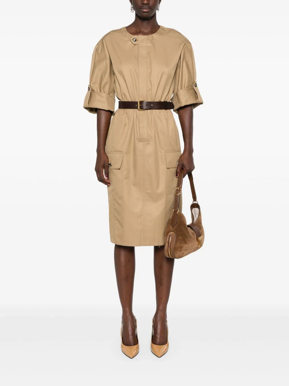 Saint Laurent adds its Parisian aesthetic to this beige dress. The cotton-crafted piece has a shirt silhouette accentuated with a leather belt around the waist.