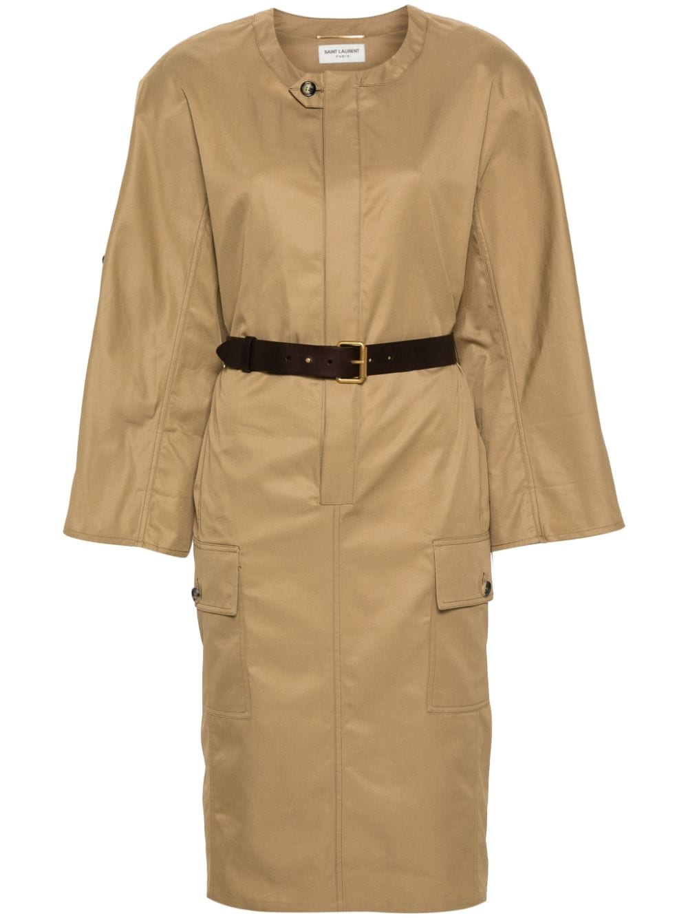 Saint Laurent adds its Parisian aesthetic to this beige dress. The cotton-crafted piece has a shirt silhouette accentuated with a leather belt around the waist.