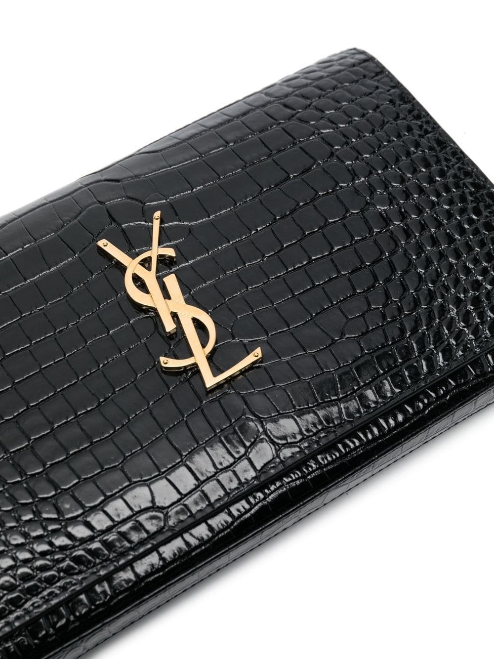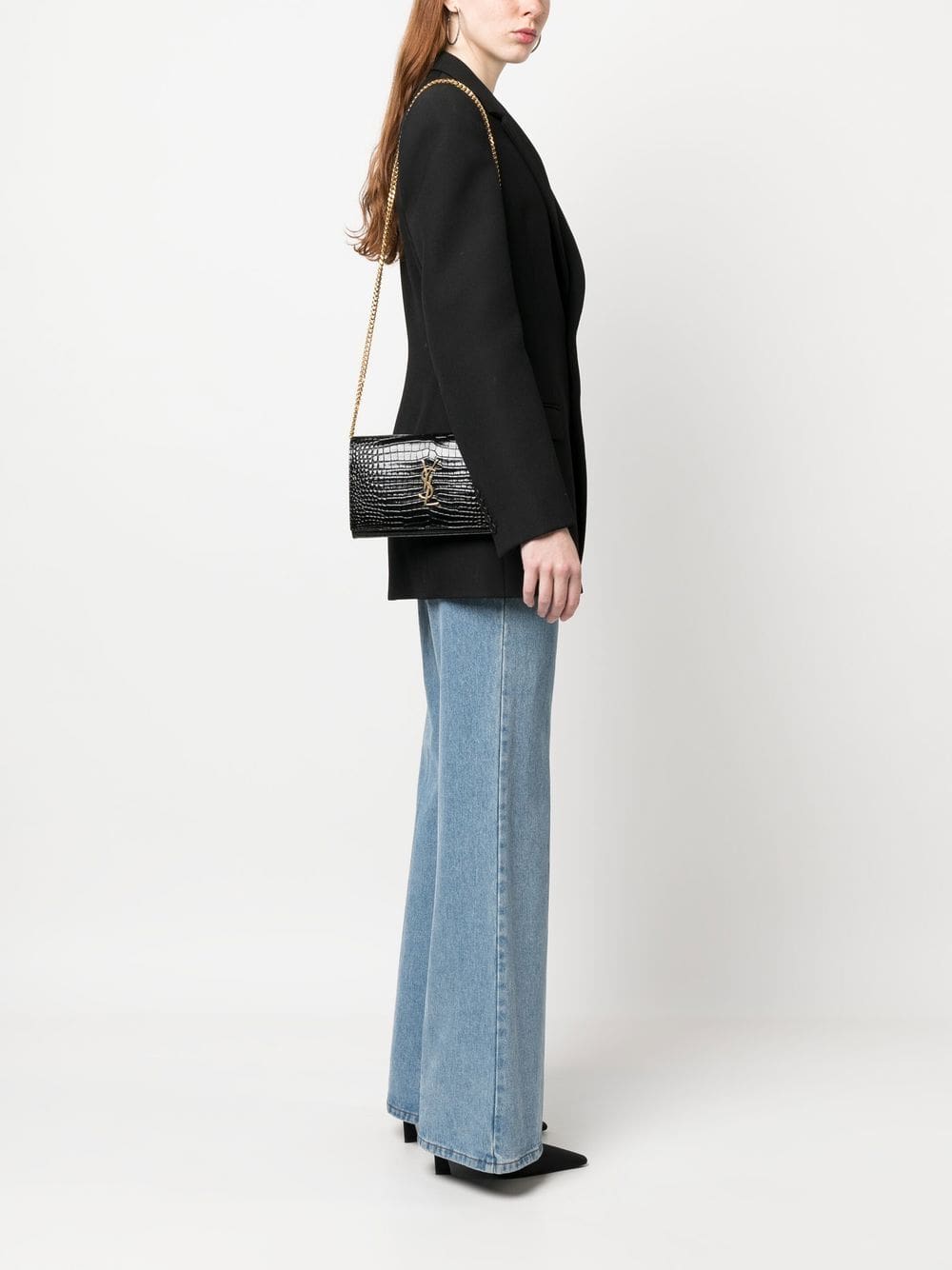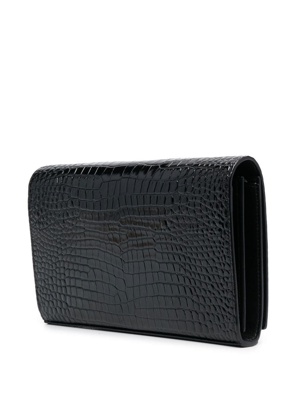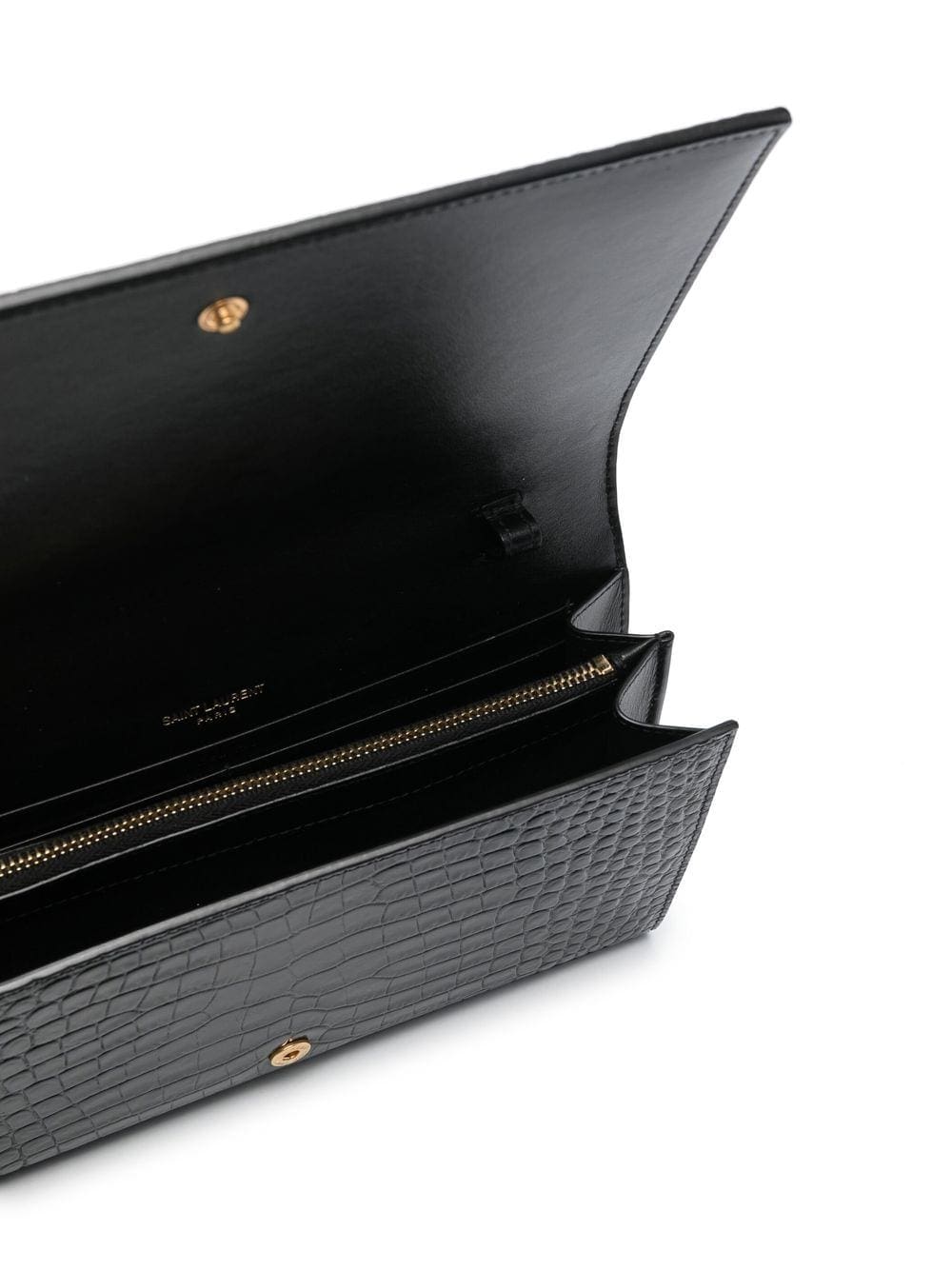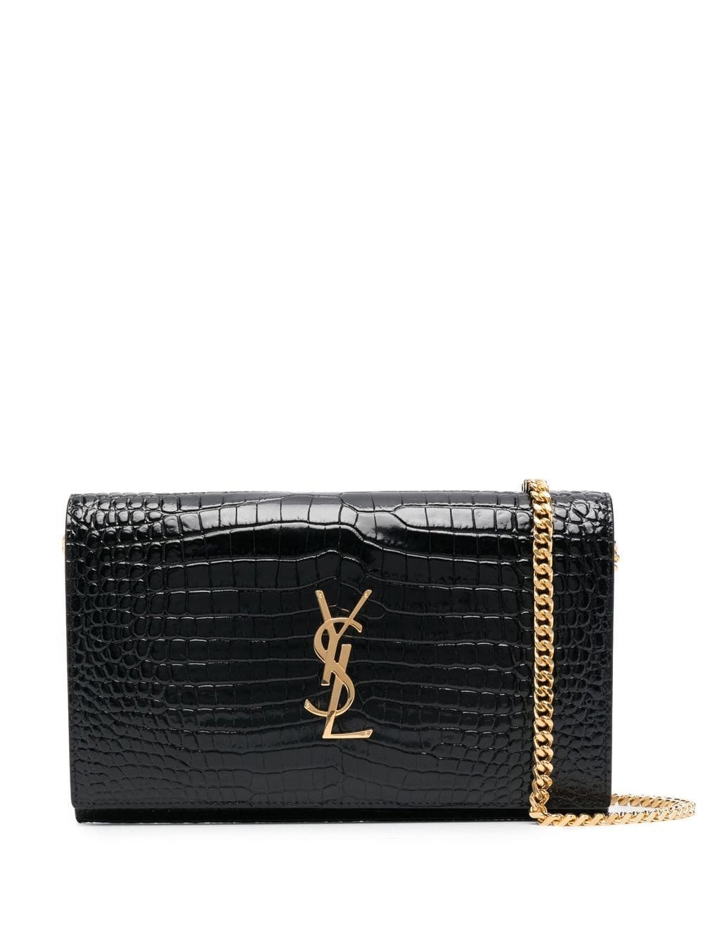 black calf leather embossed crocodile effect gold-tone logo lettering clasp fastening chain-link shoulder strap main compartment inner pack-away pocket