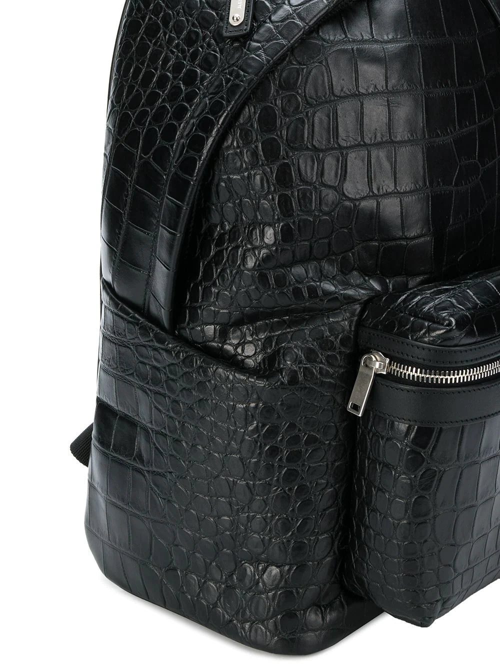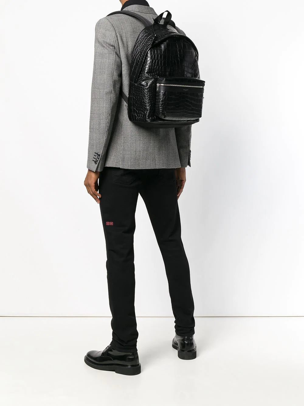 Don't carry the weight of the world on your shoulders, just this backpack. Made from black calf leather, this City backpack from Saint Laurent is imprinted with a crocodile effect. You'll go wild for this one. Featuring a top handle, adjustable shoulder straps, a double top zip closure, an internal zipped pocket, internal slip pockets and a front zip compartment.
