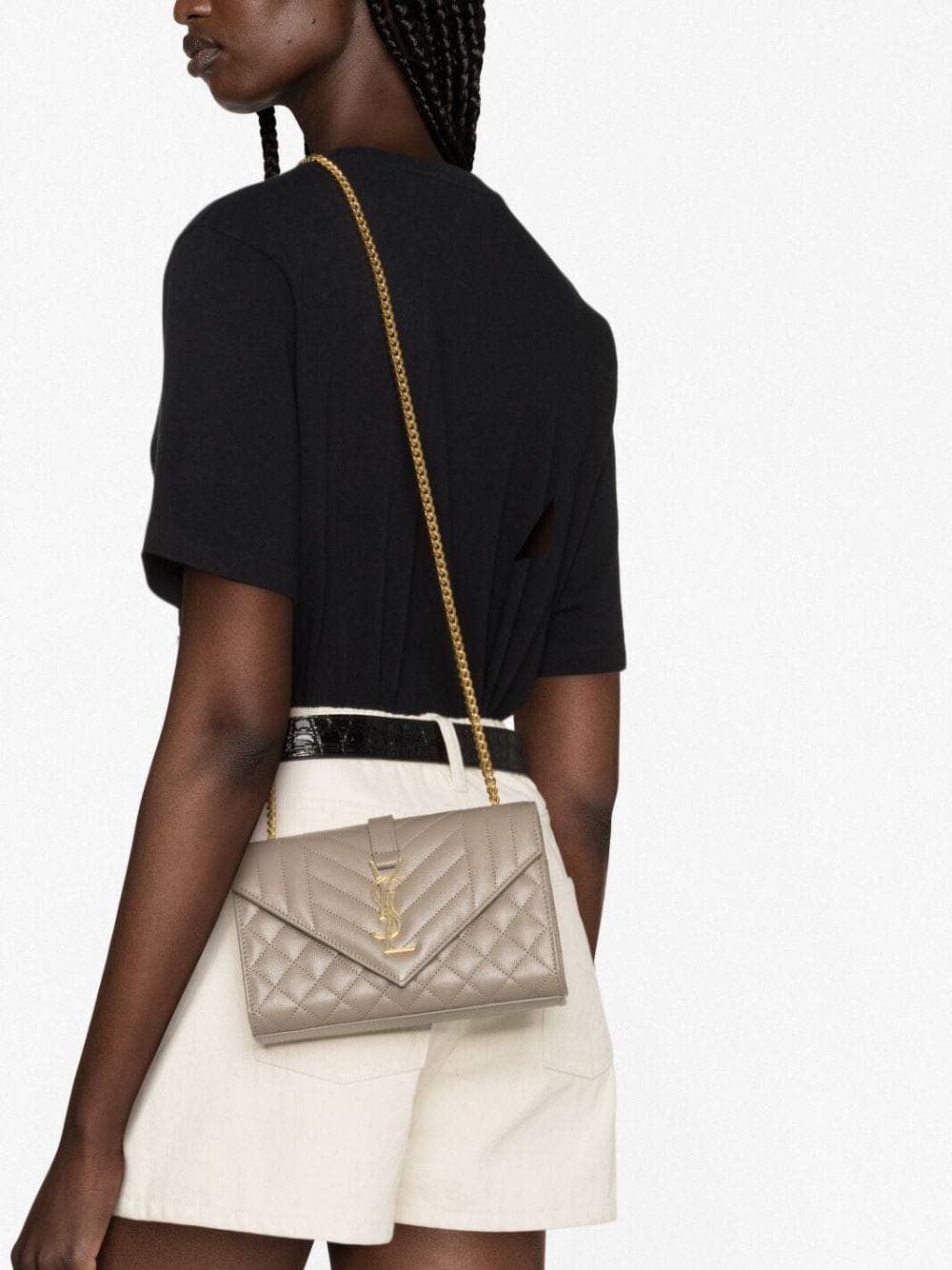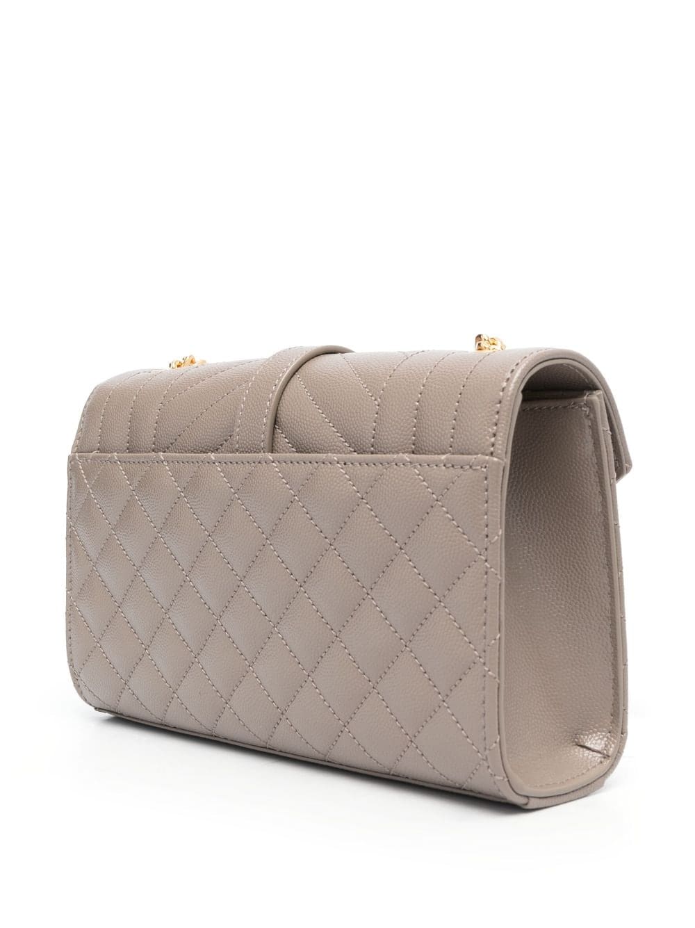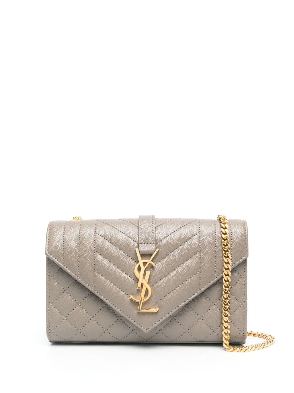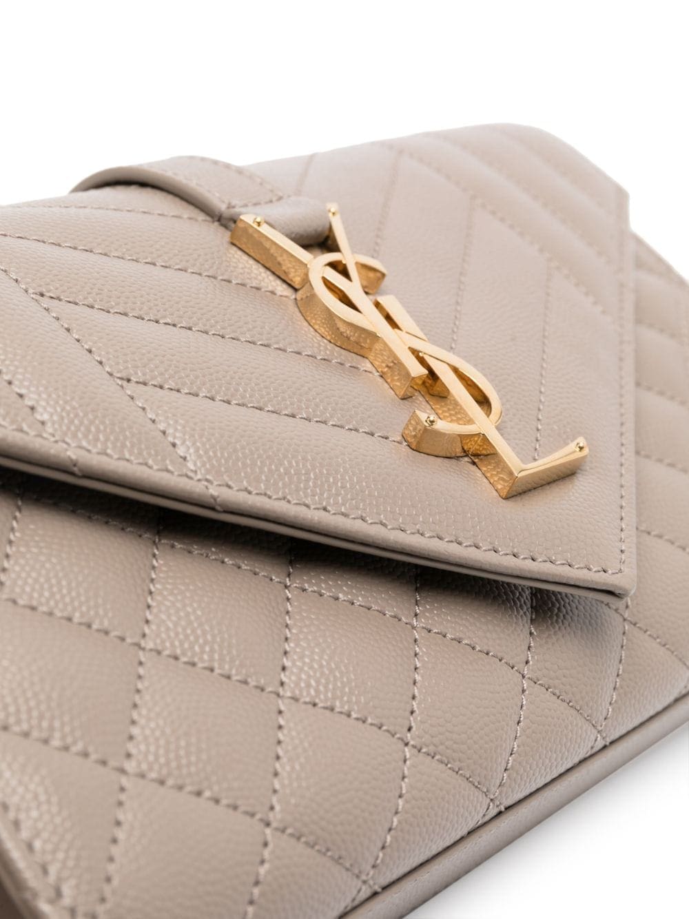 An iconic Saint Laurent style, the Envelope bag is so-named due to the shape of its front flap. This iteration is crafted from taupe leather with a mix of vertical, diamond and chevron quilting, and detailed with the unmistakable Cassandre plaque at the front.