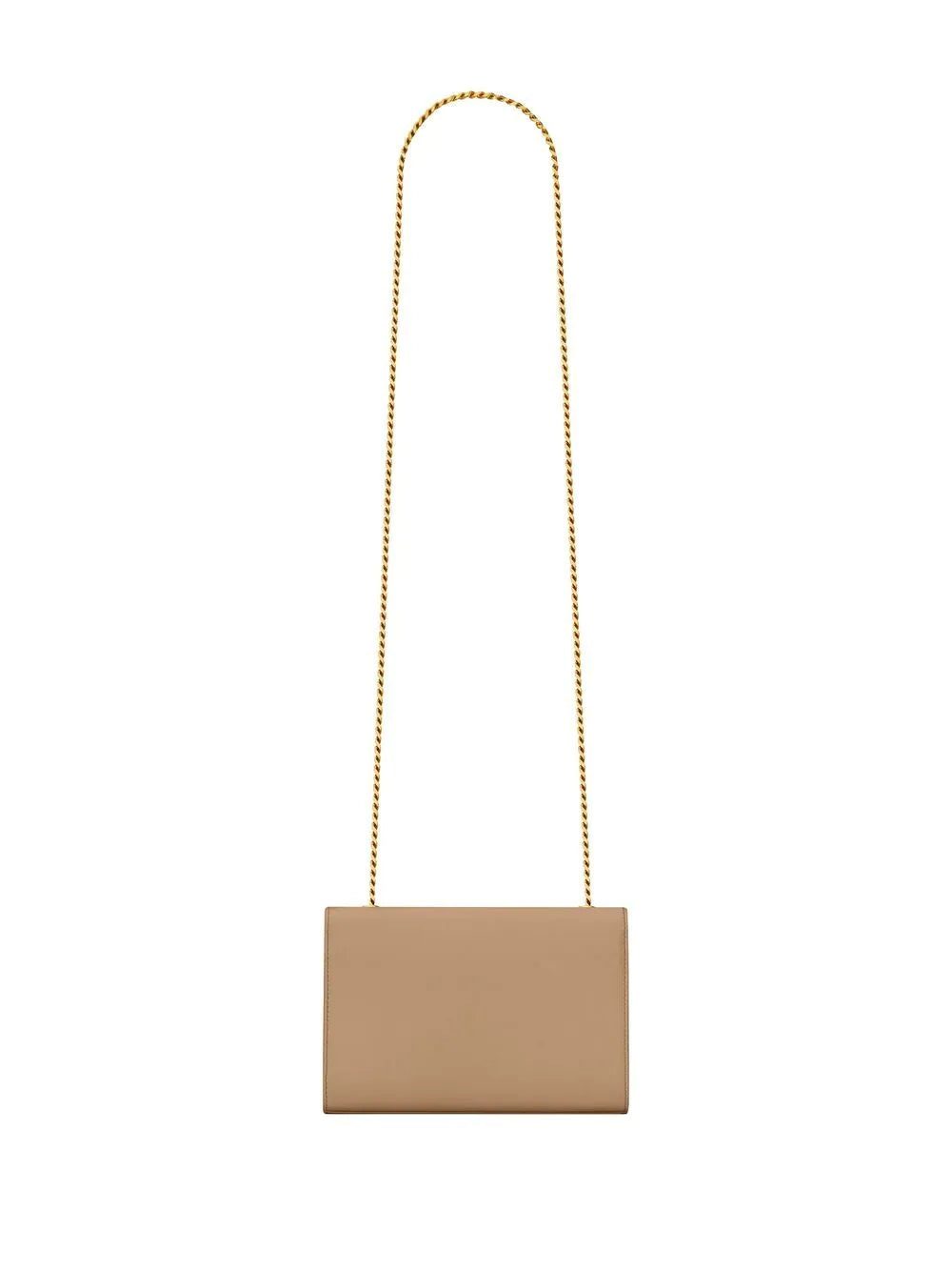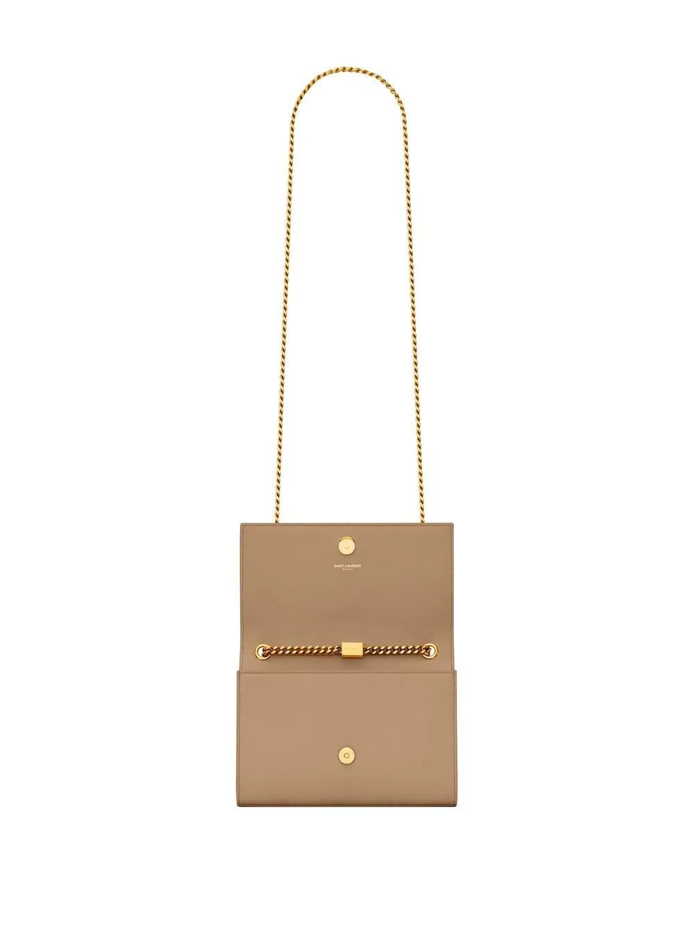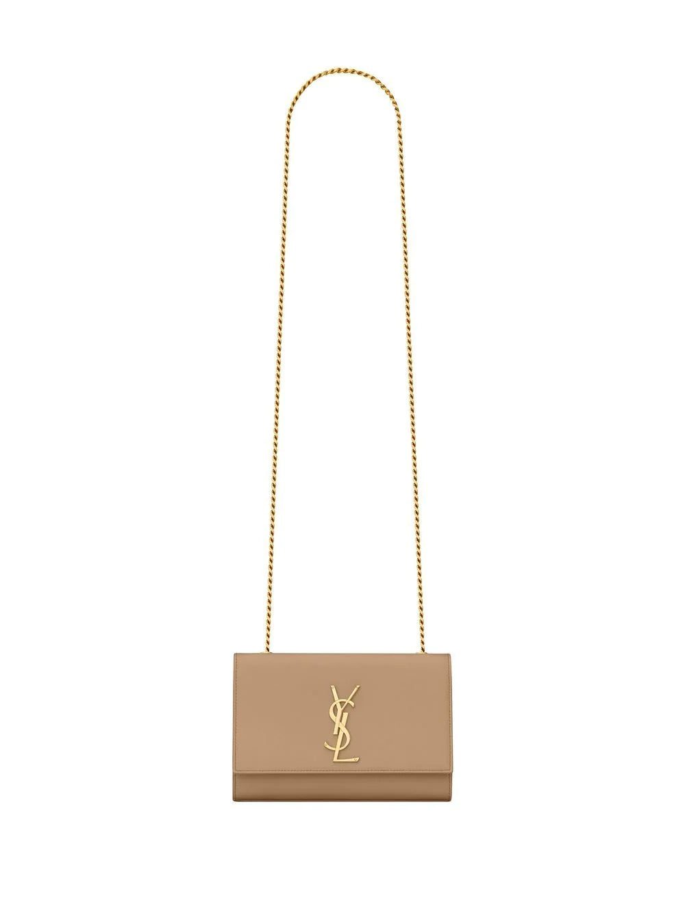 Kate leather shoulder bag from SAINT LAURENT featuring taupe brown, calf leather, gold-tone logo lettering, foldover top with press-stud fastening, chain-link shoulder strap and main compartment.