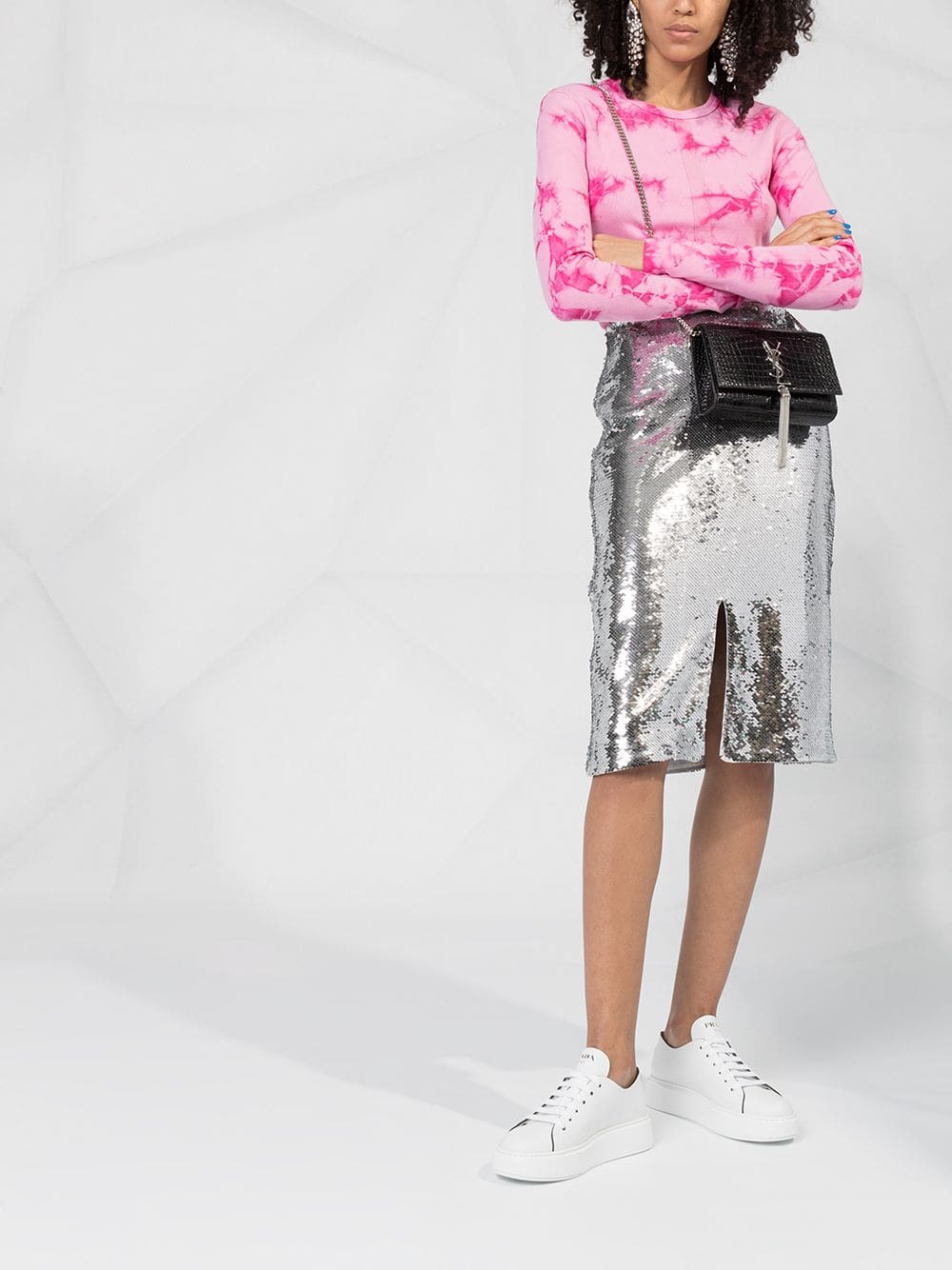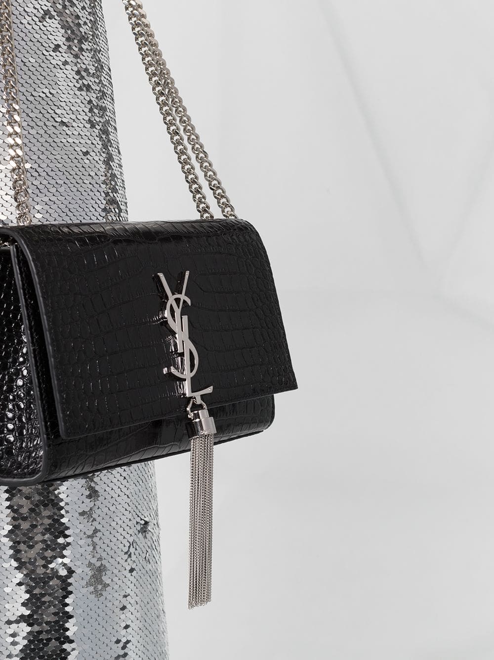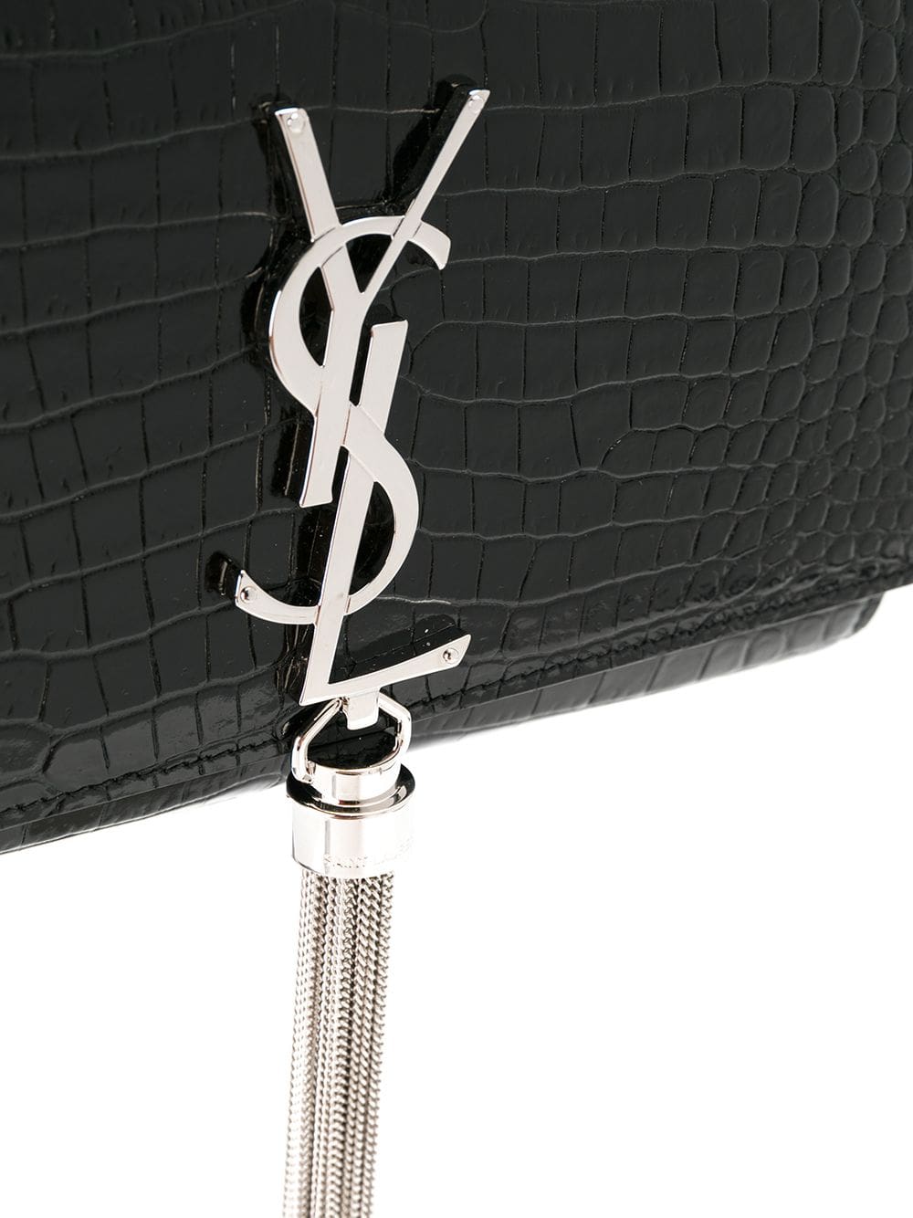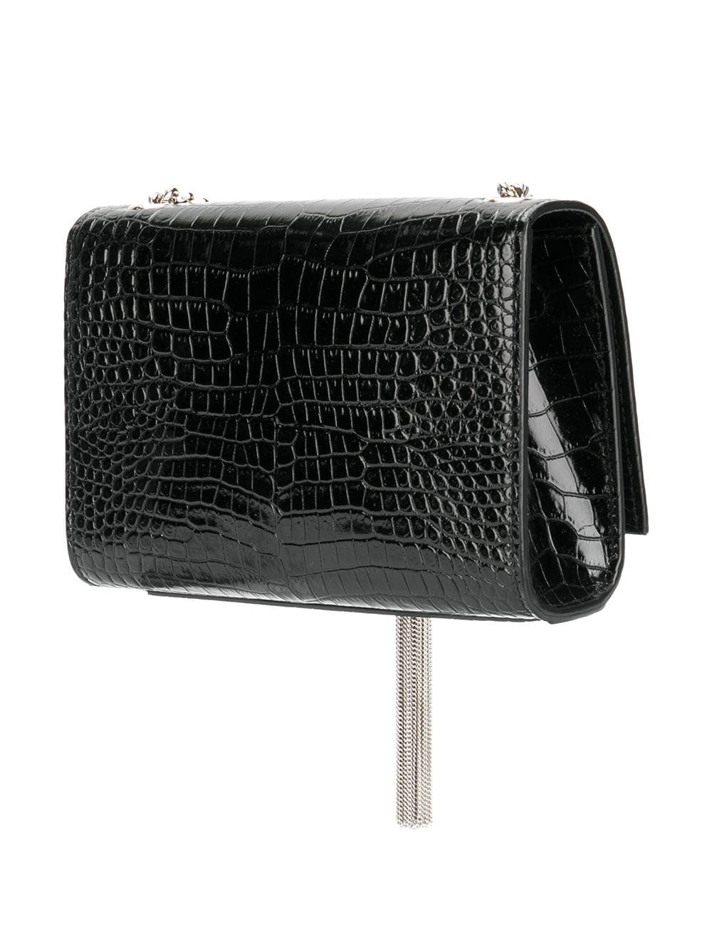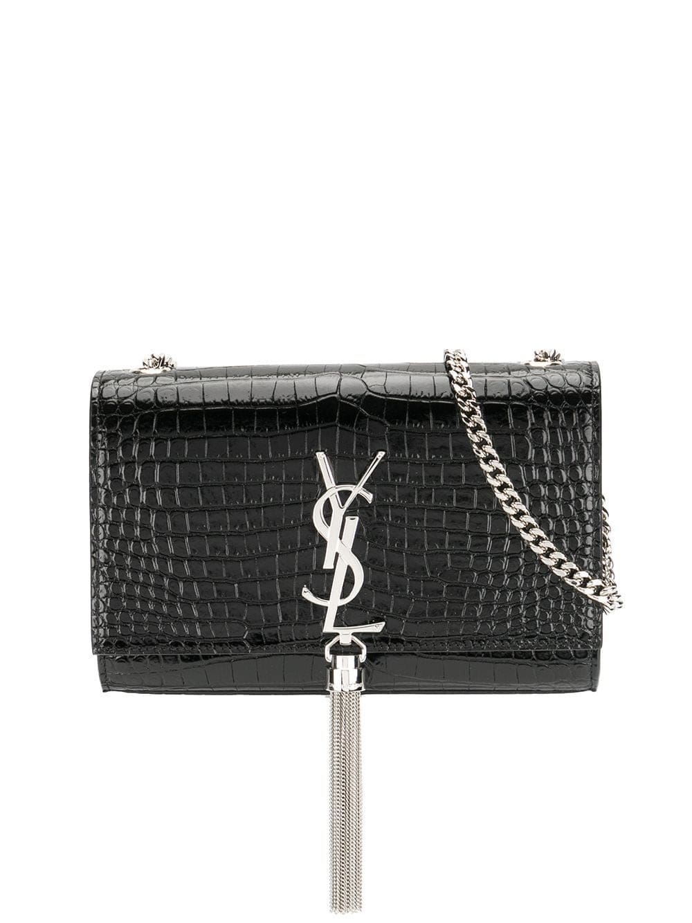 If you're carrying a Saint Laurent over your shoulder, you'll want your friends to notice. Constructed from calf leather, this crocodile embossed Kate tassel chain bag from Saint Laurent is adorned with a monogram logo plaque that leaves no room for doubts. Is all about that je ne sais quoi. Featuring a rectangular body, a foldover top with magnetic closure, an embossed crocodile effect, a silver-tone logo plaque, a hanging tassel, a silver-tone chain shoulder strap, a main internal compartment and internal slip pockets.