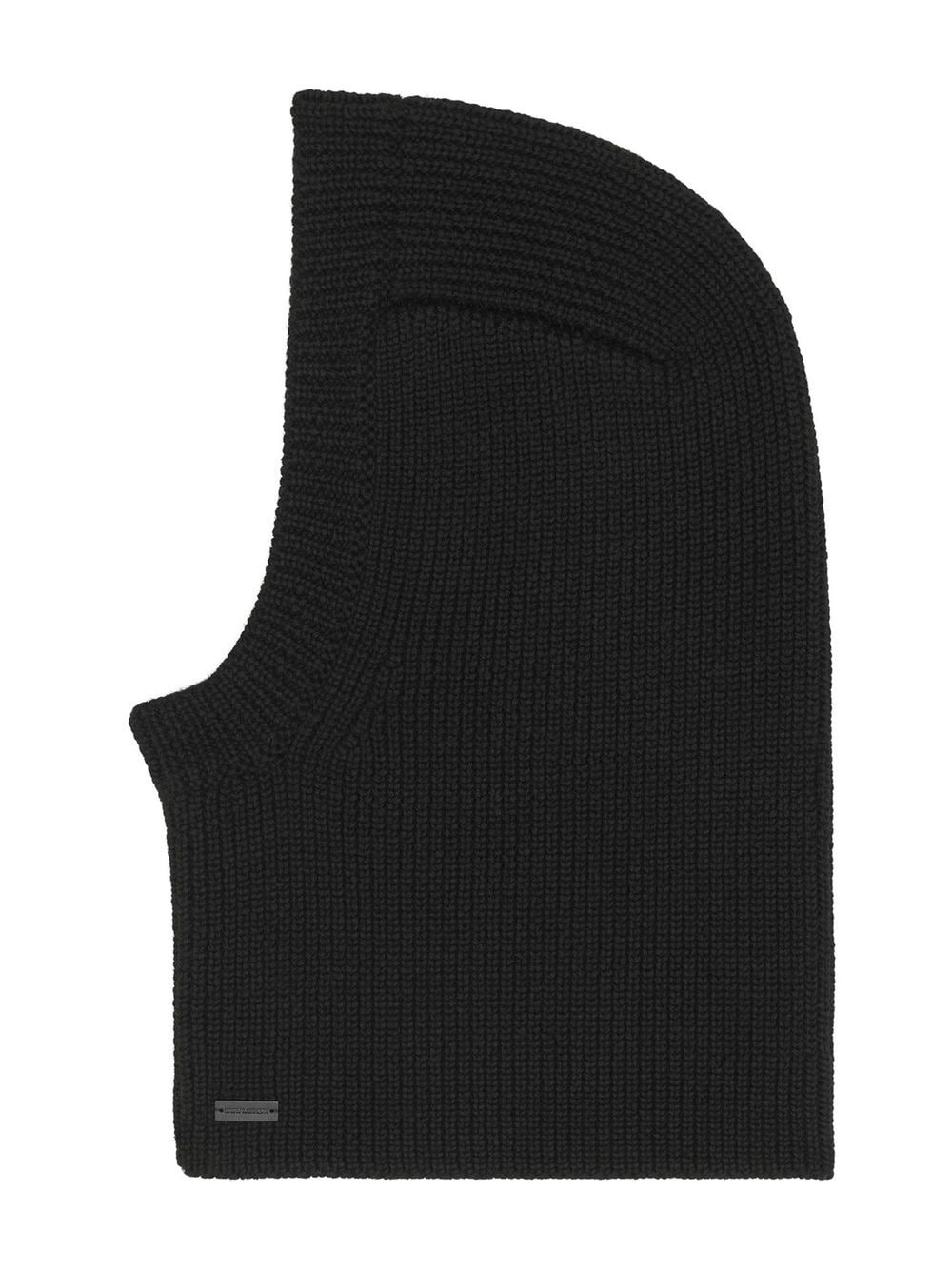large ribbed balaclava in wool from SAINT LAURENT featuring black, wool, ribbed knit, silver-tone logo plaque and slip-on style.