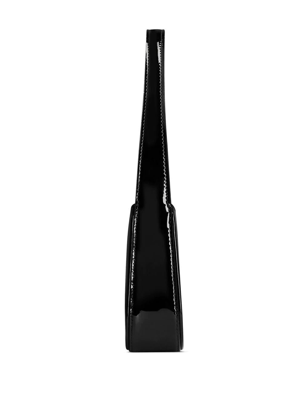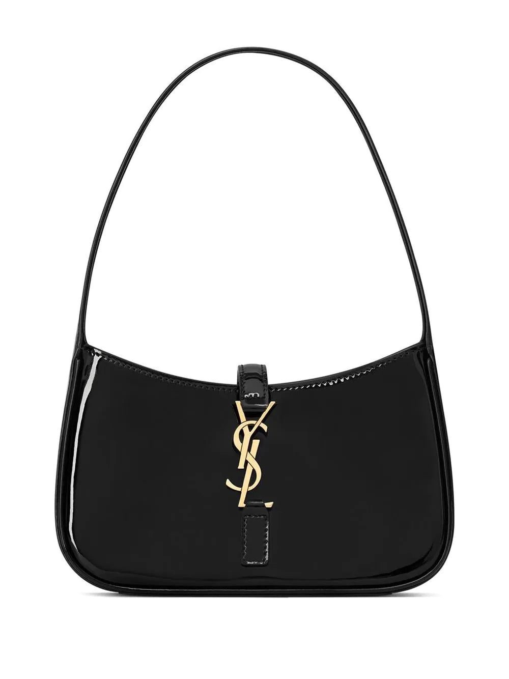 Le 5 à 7 mini shoulder bag from SAINT LAURENT featuring black, leather, patent finish, signature YSL logo plaque, single rounded top handle and main compartment.