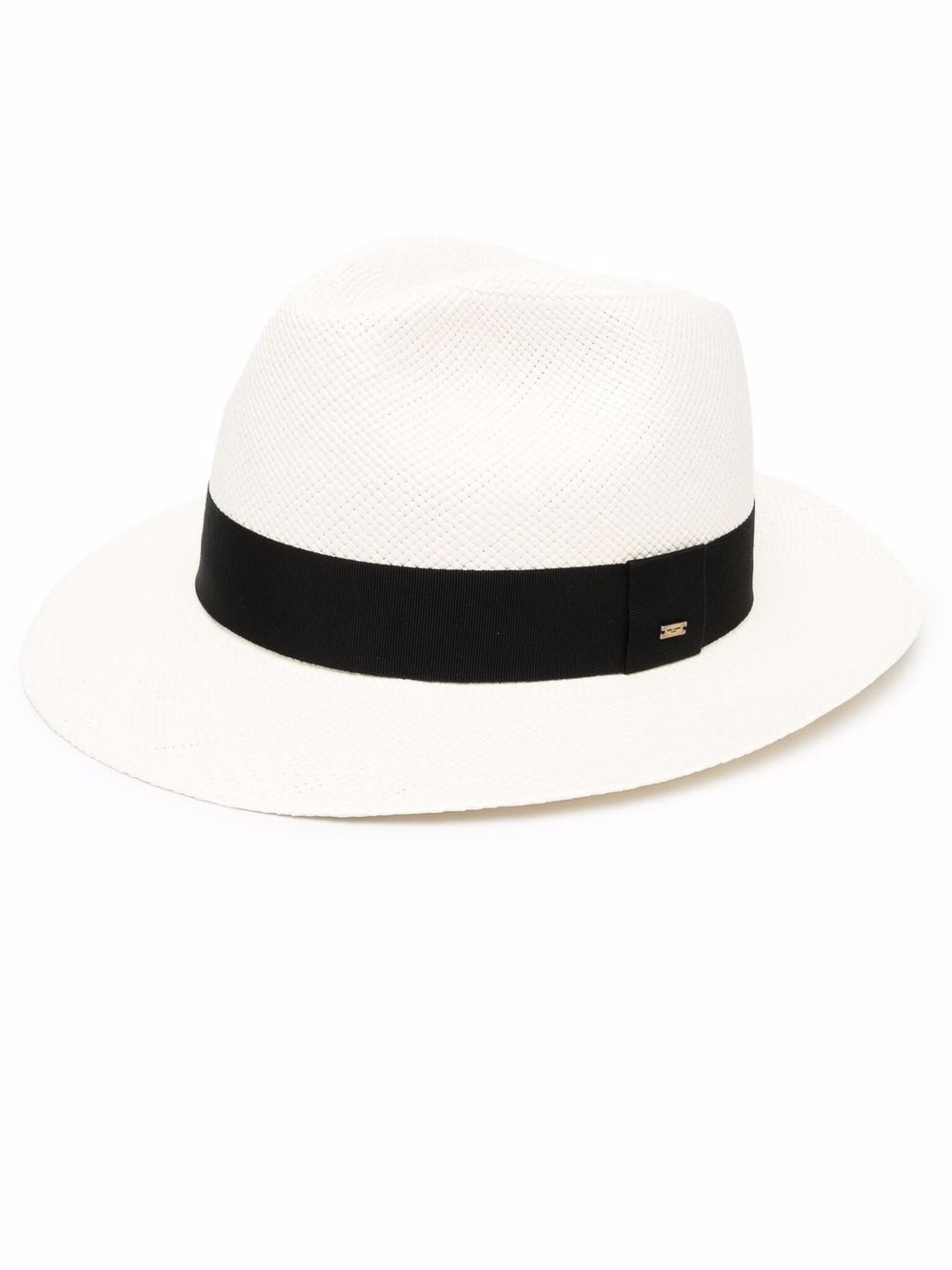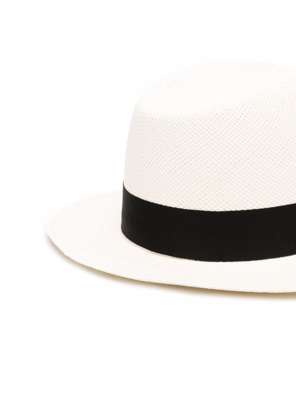 white/black interwoven design logo patch to the side ribbon detail at the crown dropped wide brim