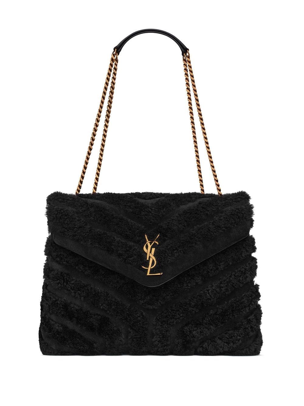 black sheepskin gold-tone logo plaque quilted finish shearling monogram gold-tone hardware front flap closure concealed magnetic fastening leather and chain-link top handle main compartment