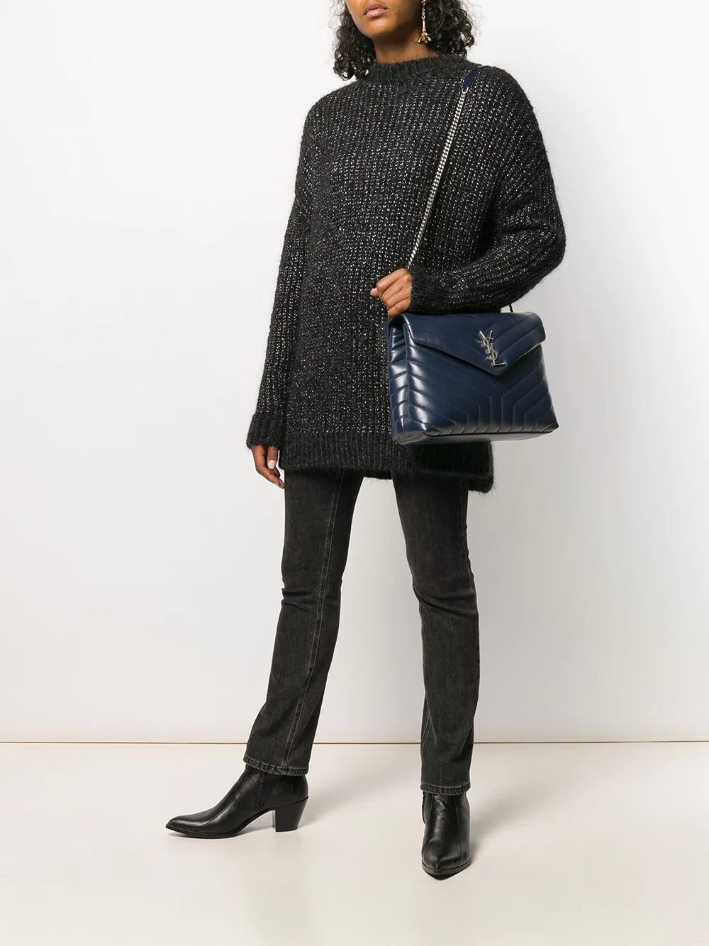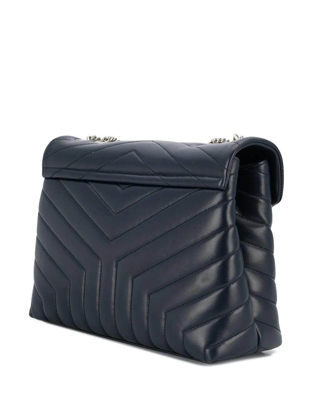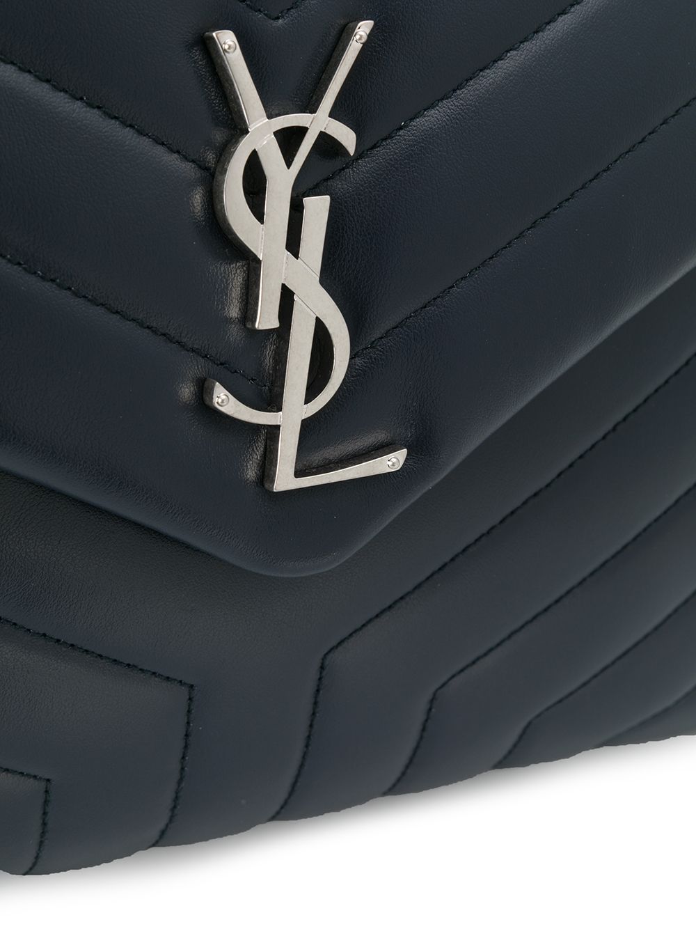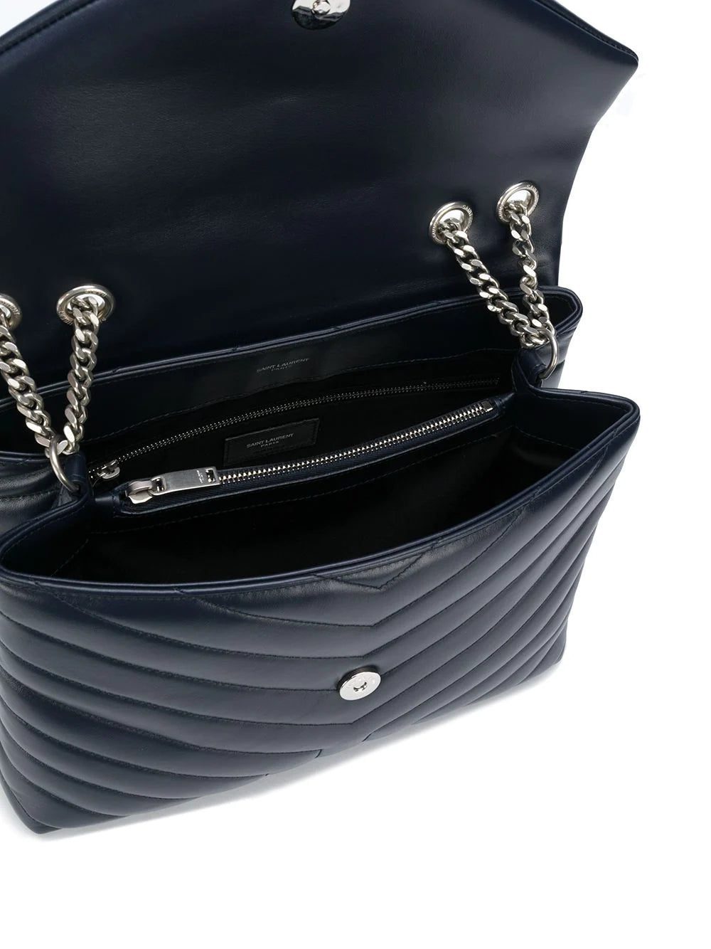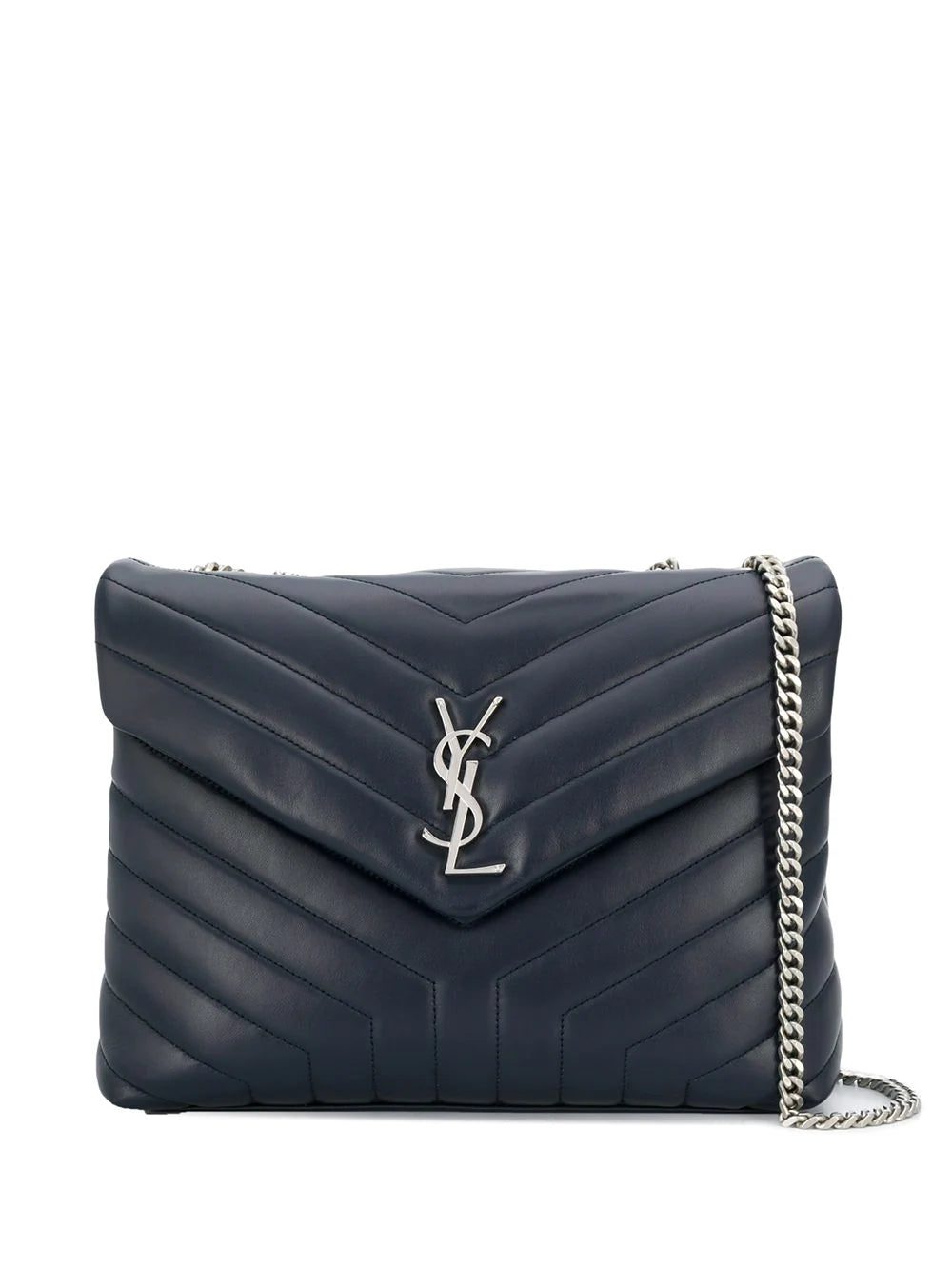 You wouldn't leave your house without keys or your phone, so why would you think twice about heading out without a useful bag by your side? Start your day off right with this navy calf leather Loulou medium quilted shoulder bag from Saint Laurent that has plenty of space to carry all the essentials you need. Don't worry about a thing, you've got it in the bag. Featuring chain and leather straps, eyelets, a foldover top with magnetic closure, a front logo plaque, silver-tone hardware, a quilted effect, multiple interior compartments, a zip fastened interior compartment, an internal zipped pocket and an internal logo patch.