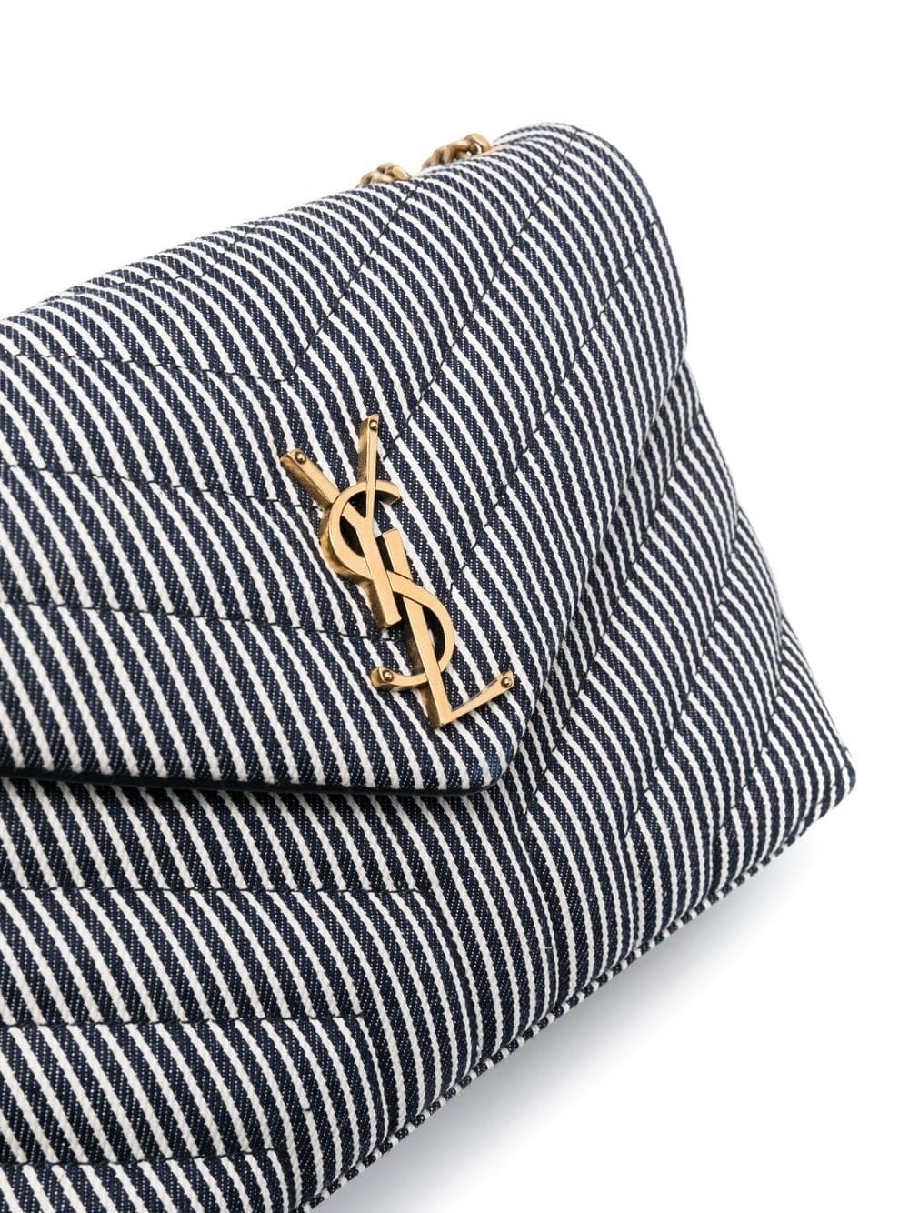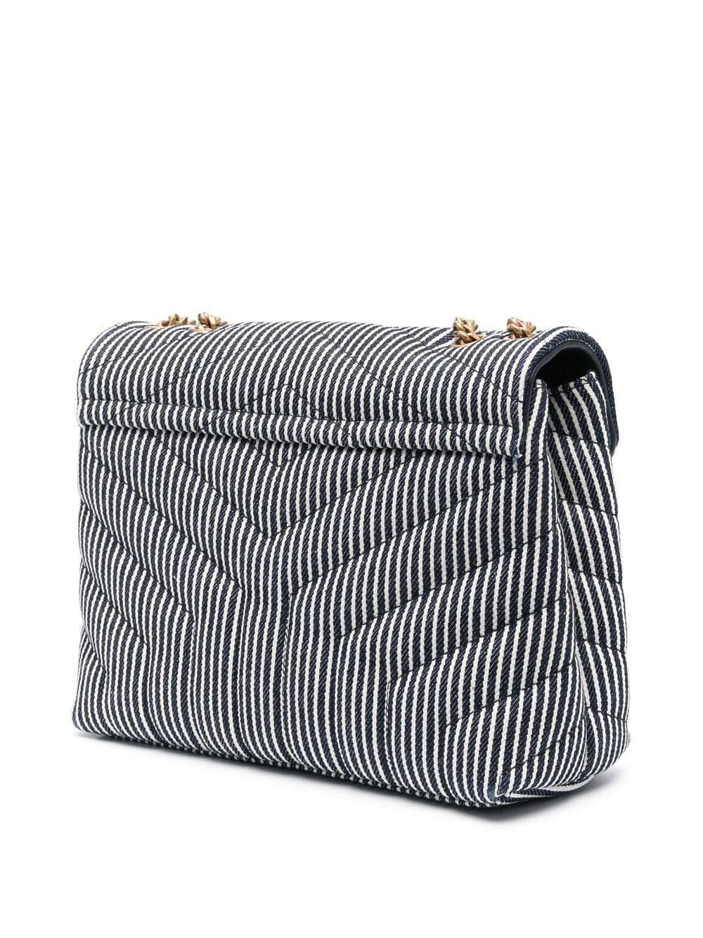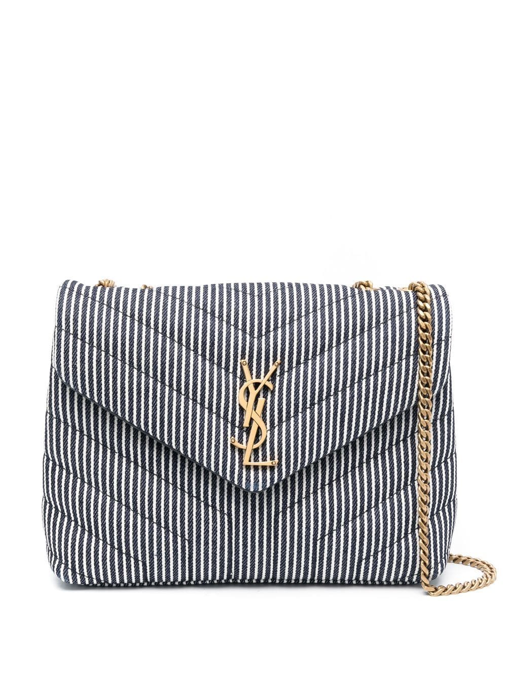 Saint Laurent's LouLou shoulder bag showcases the label's leather craftsmanship through the use of chevron quilting. For SS23, the French House combines the signature construction technique with a vertical stripe print.