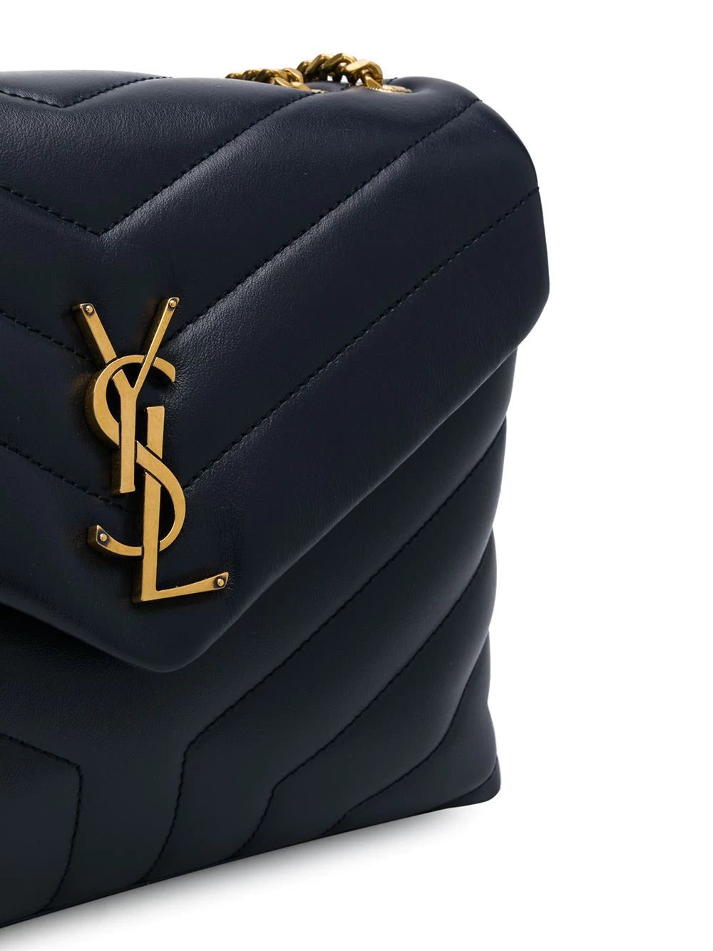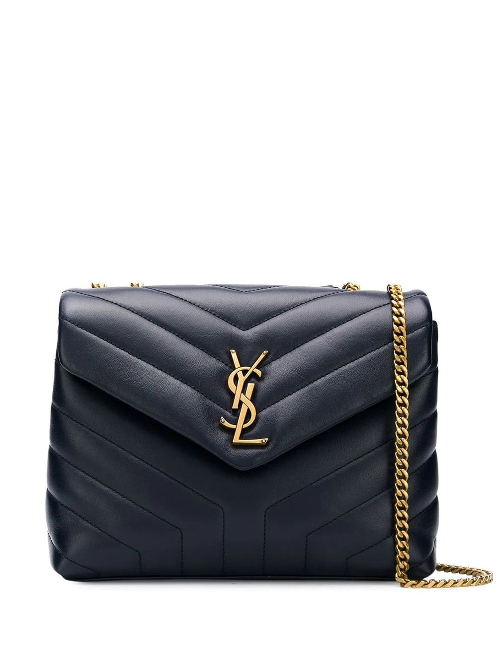Update your autumn wardrobe with this midnight blue leather Monogram quilted shoulder bag from Saint Laurent featuring a chain shoulder strap, gold-tone hardware, interior compartments divided by a partition, an interior zipped compartment and a foldover top with snap closure.