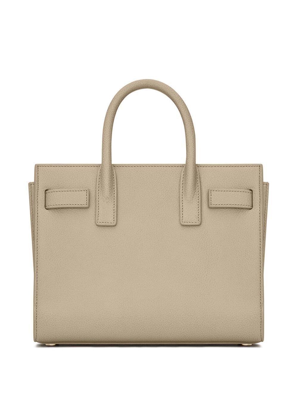 Saint Laurent updates its iconic Sac De Jur tote in scaled-down proportions. This nano iteration is made from beige leather and minimally punctuated with gleaming gold-tone hardware.
