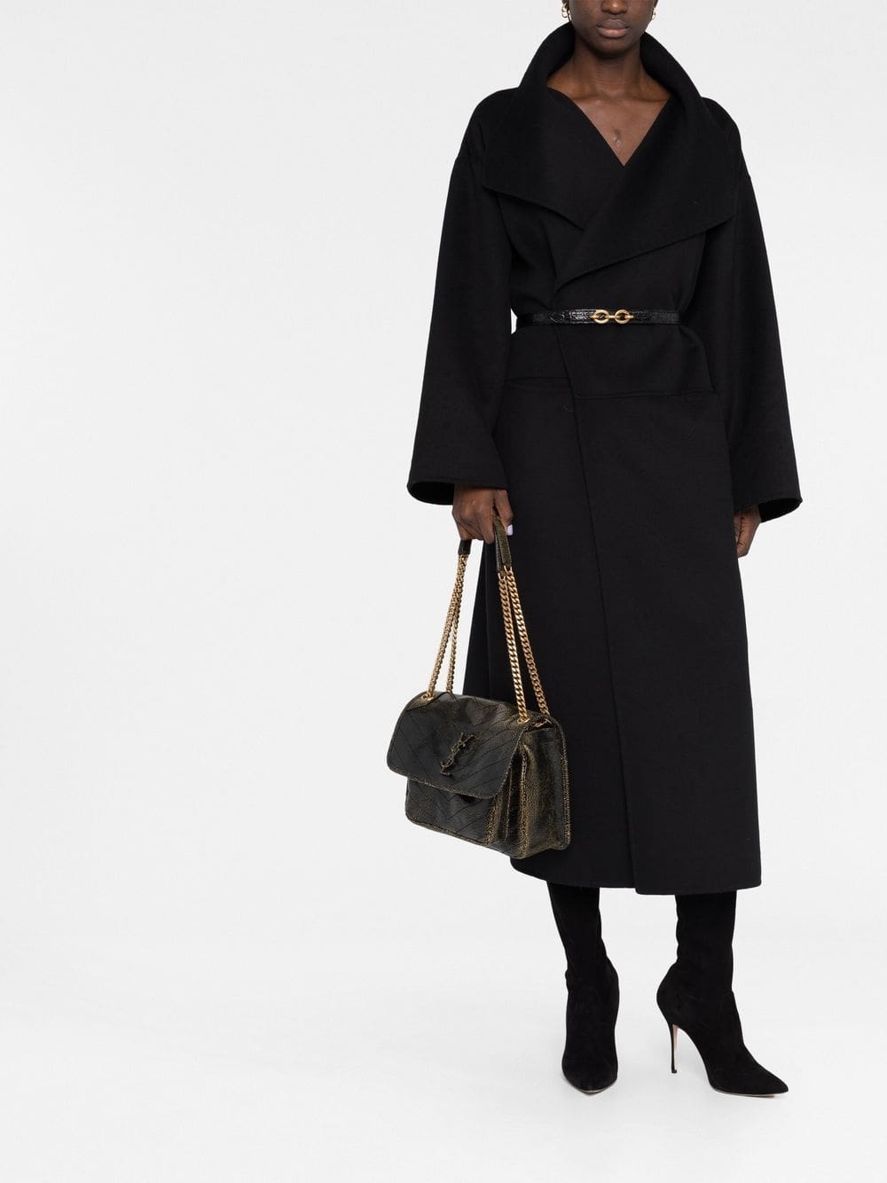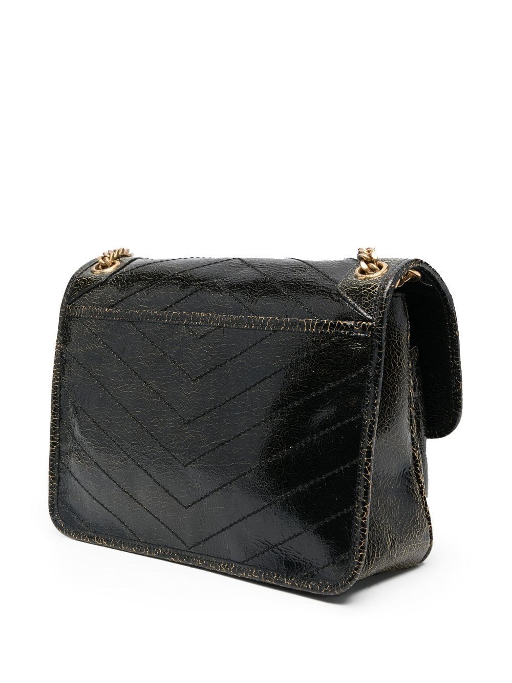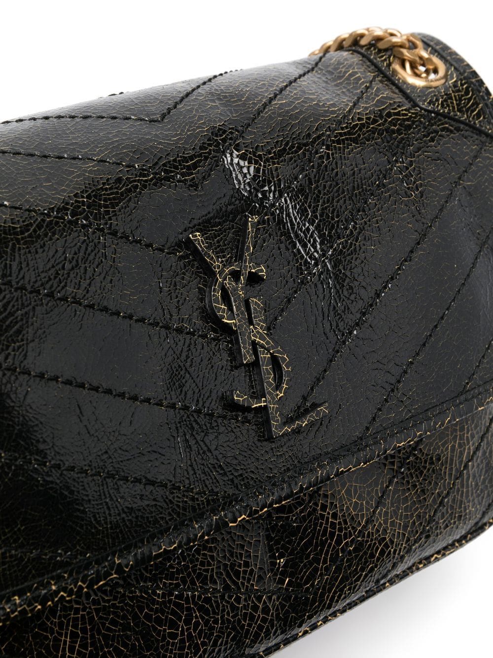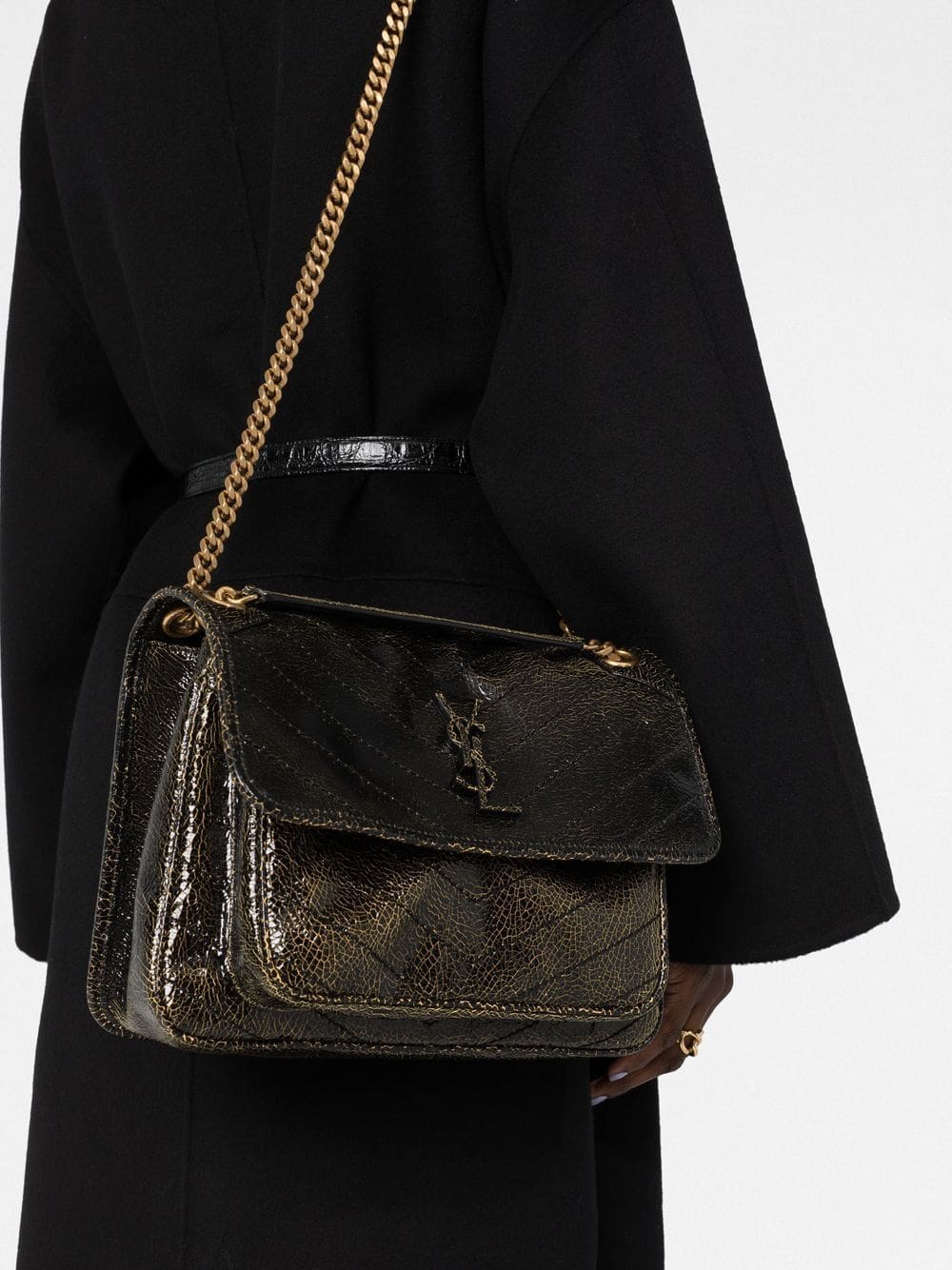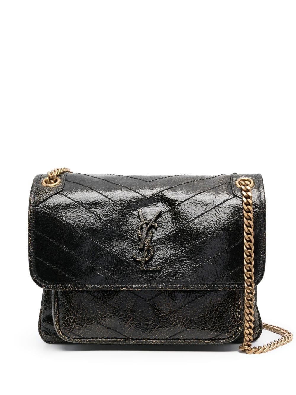 Saint Laurent's Niki bag comes back season after season, in different colours and finishes. This time, the signature style was updated with a black leather construction in a patent finish, enhanced with a YSL plaque on the front in a crinkled effect.
