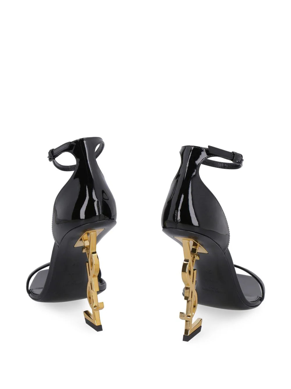 Black leather Opyum 110mm YSL heel sandals from Saint Laurent featuring an open toe, a branded insole, an ankle strap with a side buckle fastening and a sculpted YSL high heel.