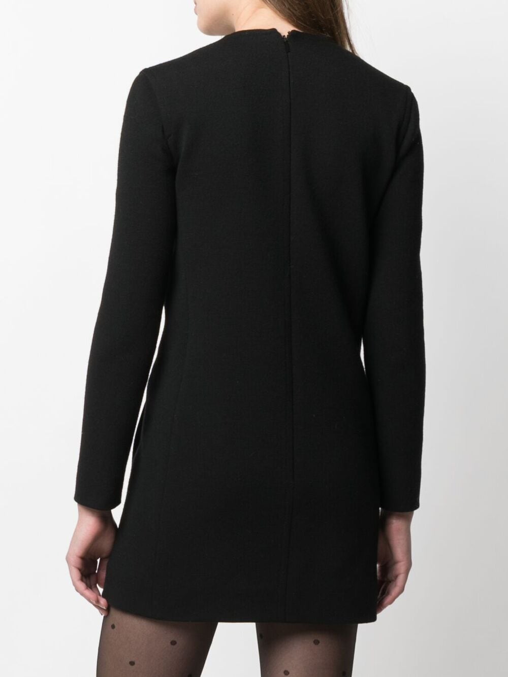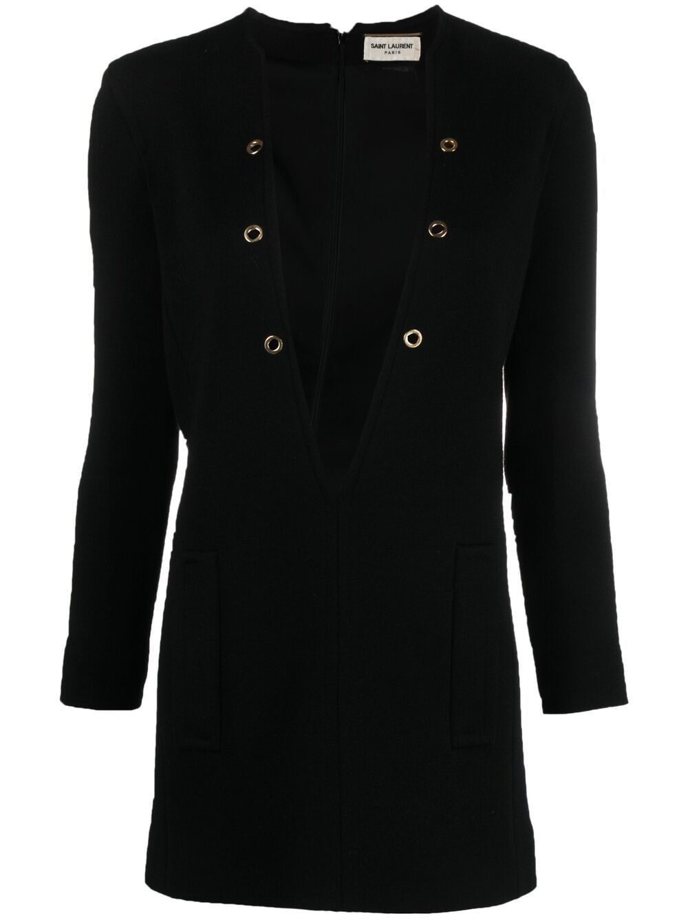 This Saint Laurent dress cuts a contemporary silhouette with long sleeves and a plunging V-neck. The modern feel of this piece is enhanced by the addition of a pocket at either side.
