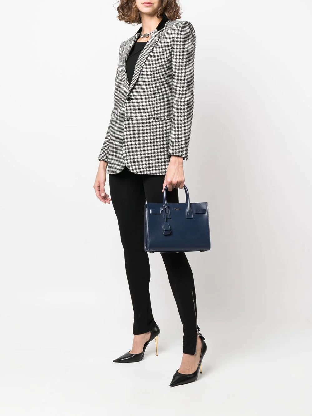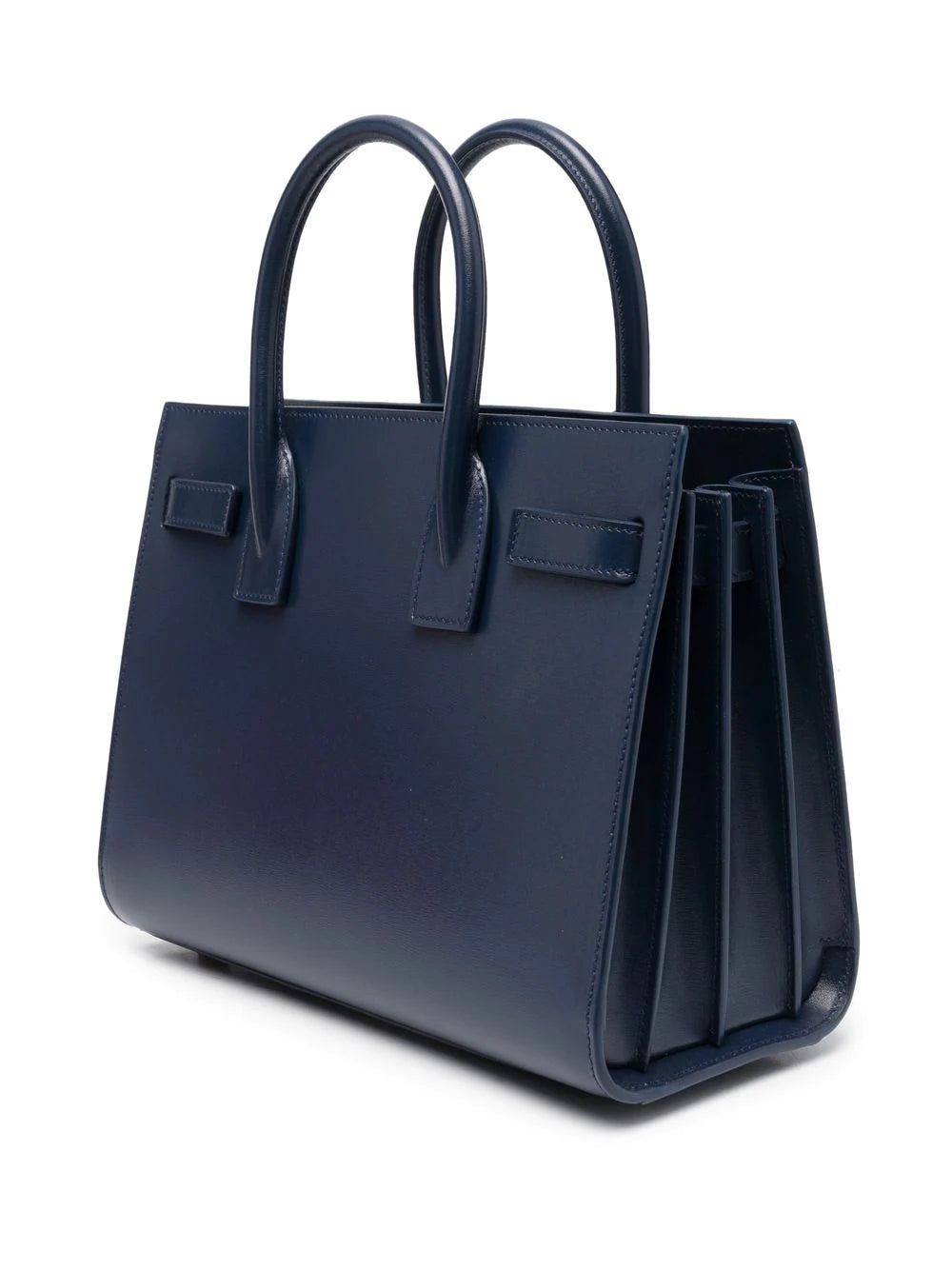 Saint Laurent's signature Sac de Jour is constructed with a timeless structured silhouette that allows for versatile everyday wear. Appearing here in its Baby iteration with a navy blue hue, it maintains signature details such as the padlock pouch and compression-side design.