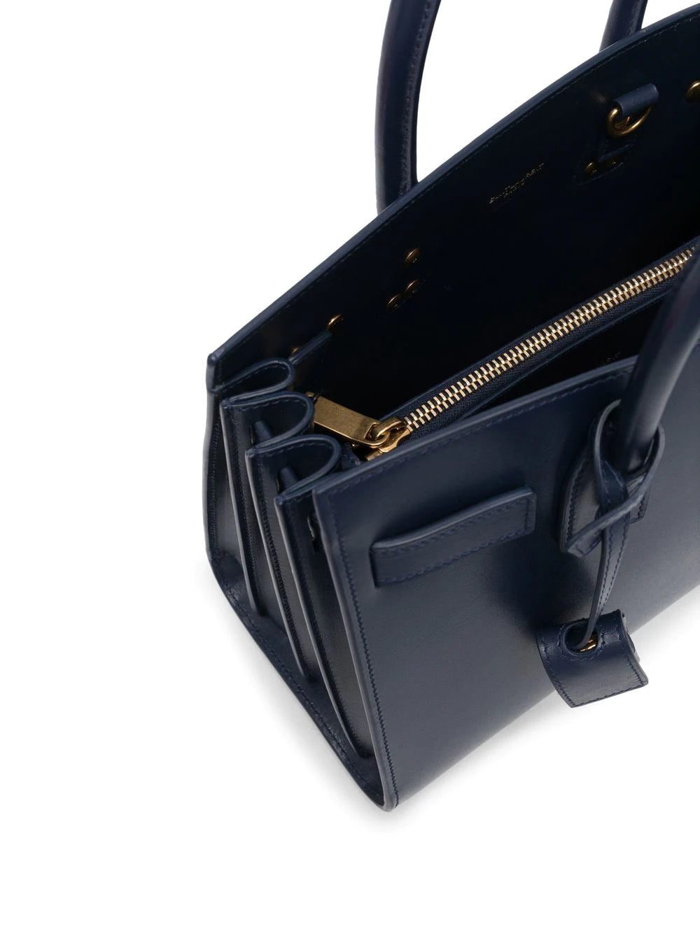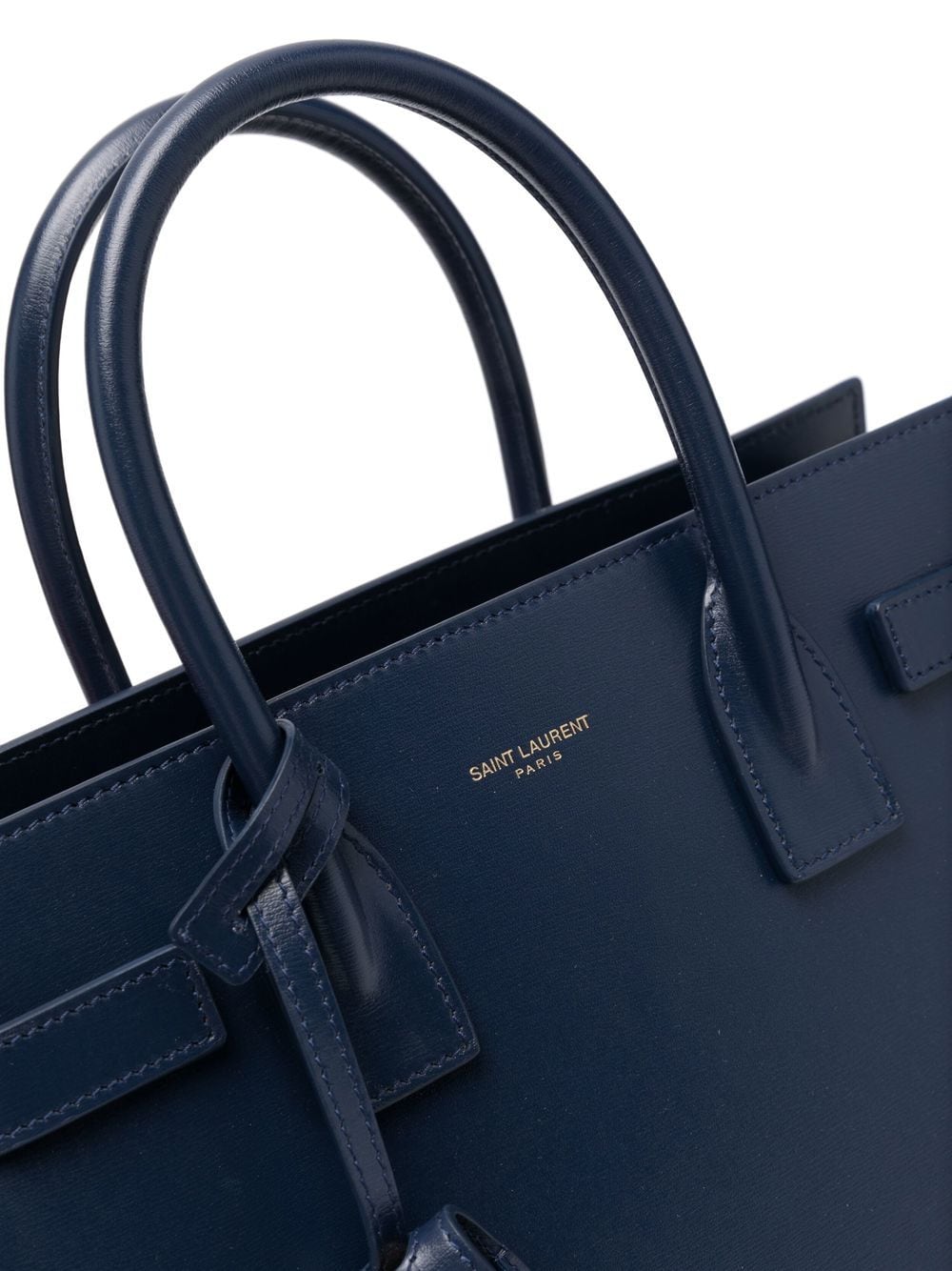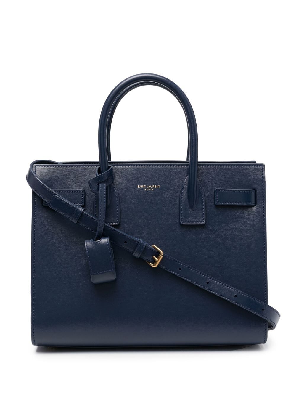 Saint Laurent's signature Sac de Jour is constructed with a timeless structured silhouette that allows for versatile everyday wear. Appearing here in its Baby iteration with a navy blue hue, it maintains signature details such as the padlock pouch and compression-side design.