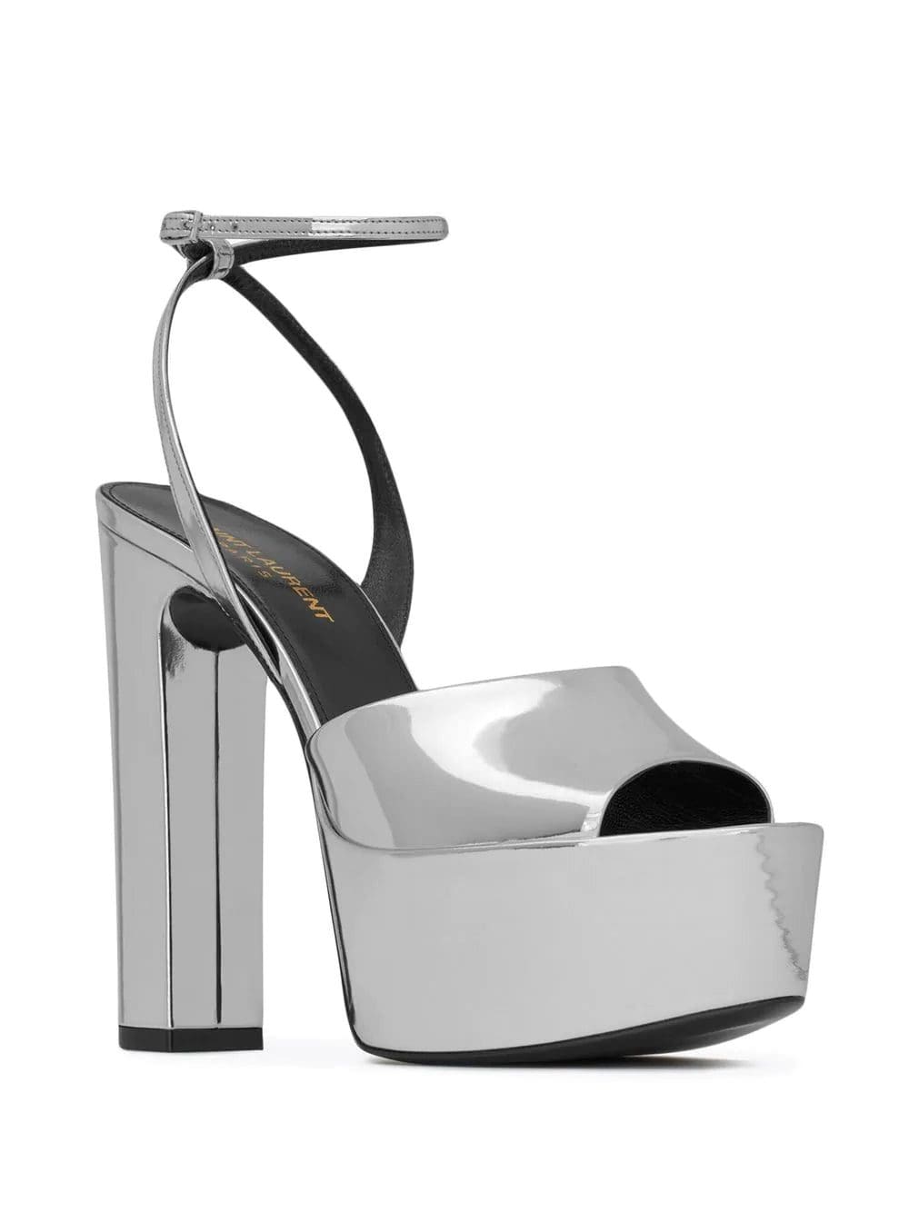 Sexy 95mm patent leather pumps from SAINT LAURENT featuring silver, patent leather, open toe, branded insole, buckle-fastening ankle strap, platform sole and 95mm heel.