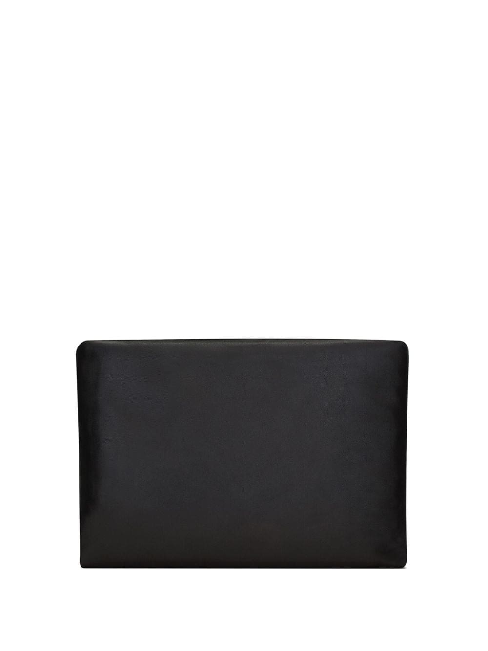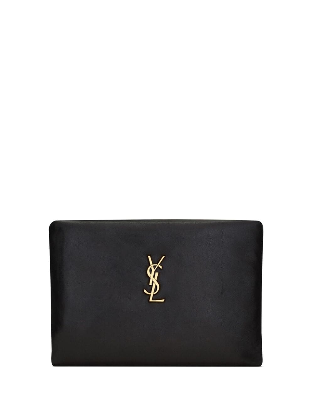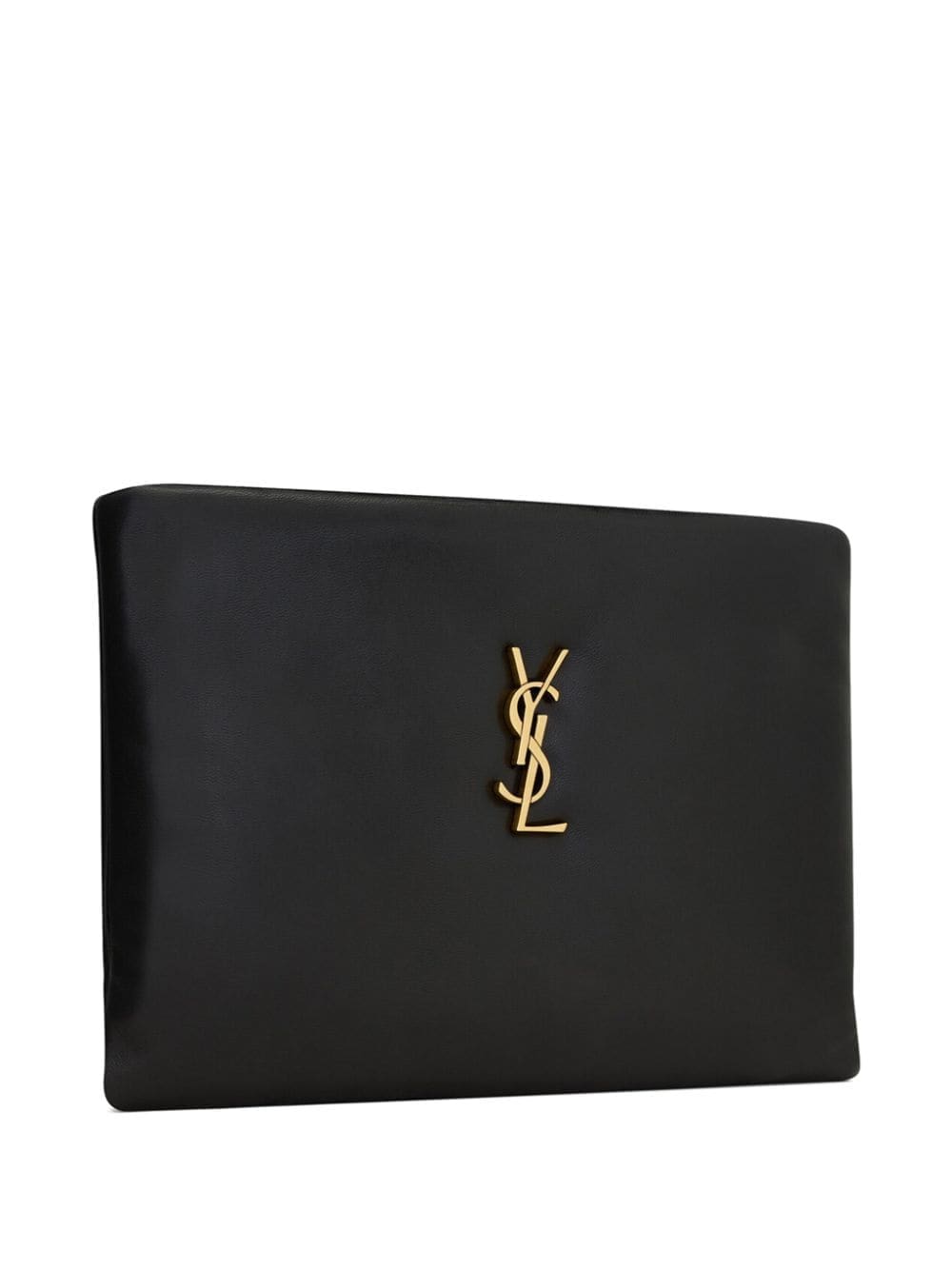 Saint Laurent presents the Calypso clutch with a smooth lambskin leather design. It's embellished with a gold-tone YSL plaque designed by famed typographer Cassandre.