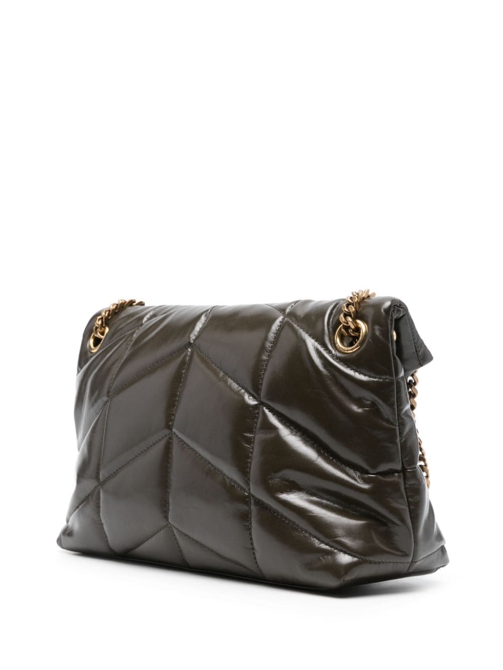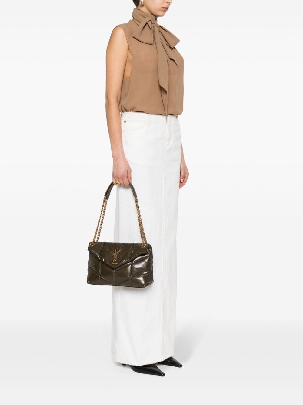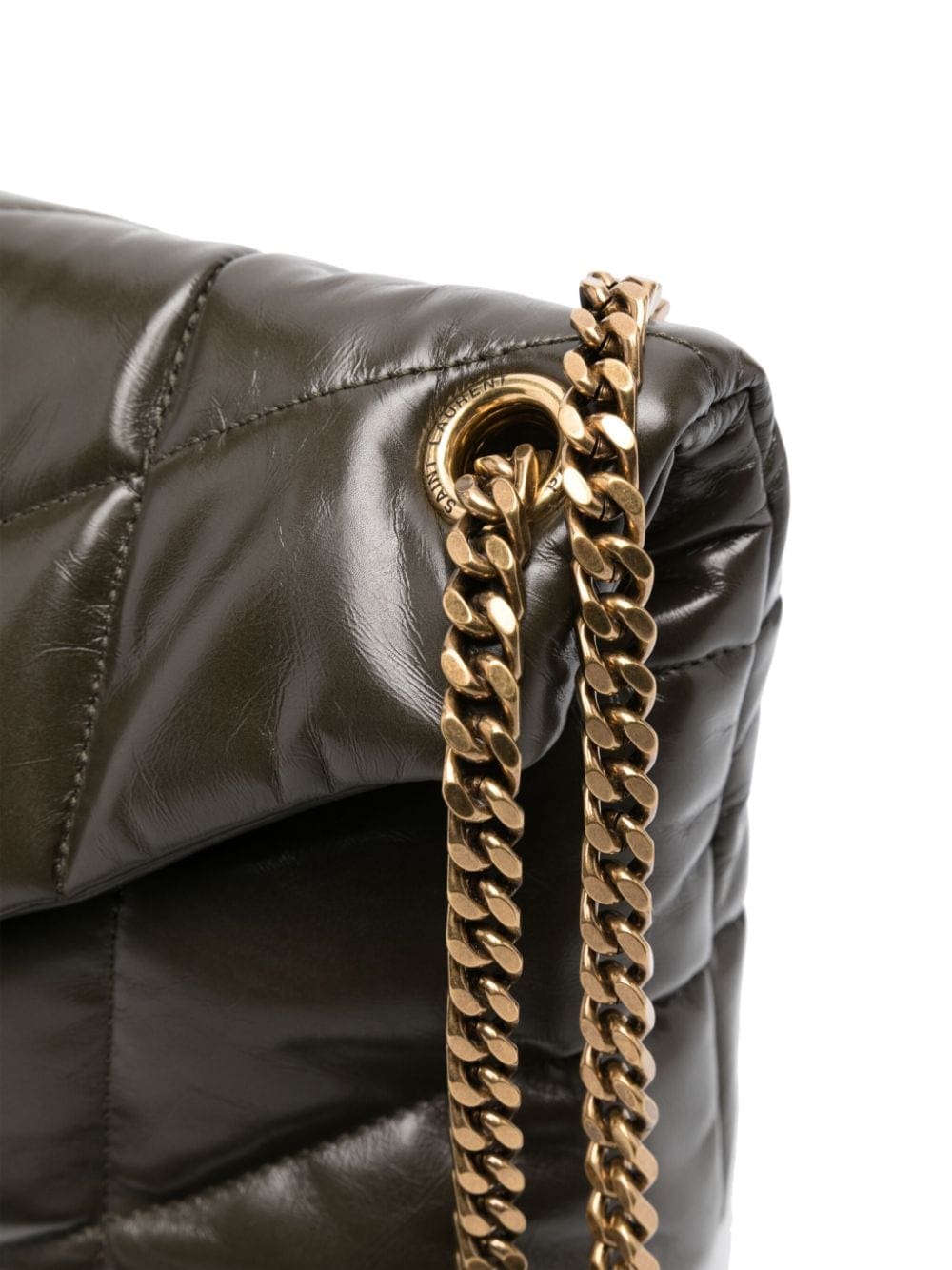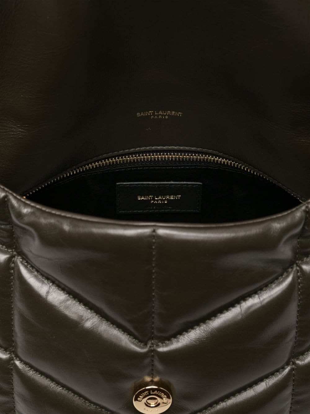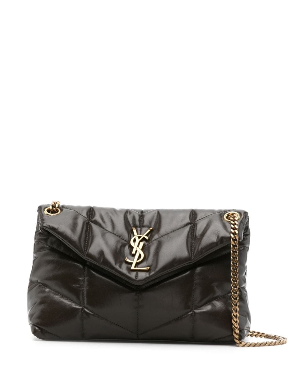 Saint Laurent’s small Puffer bag is aptly titled after its padded envelope silhouette. It’s crafted from shiny brown leather with a crinkled finish then stitched with signature chevron quilting and embellished with a gold-tone Cassandre logo plaque at the front flap. The sliding chain-link shoulder strap allows for a custom drop.
