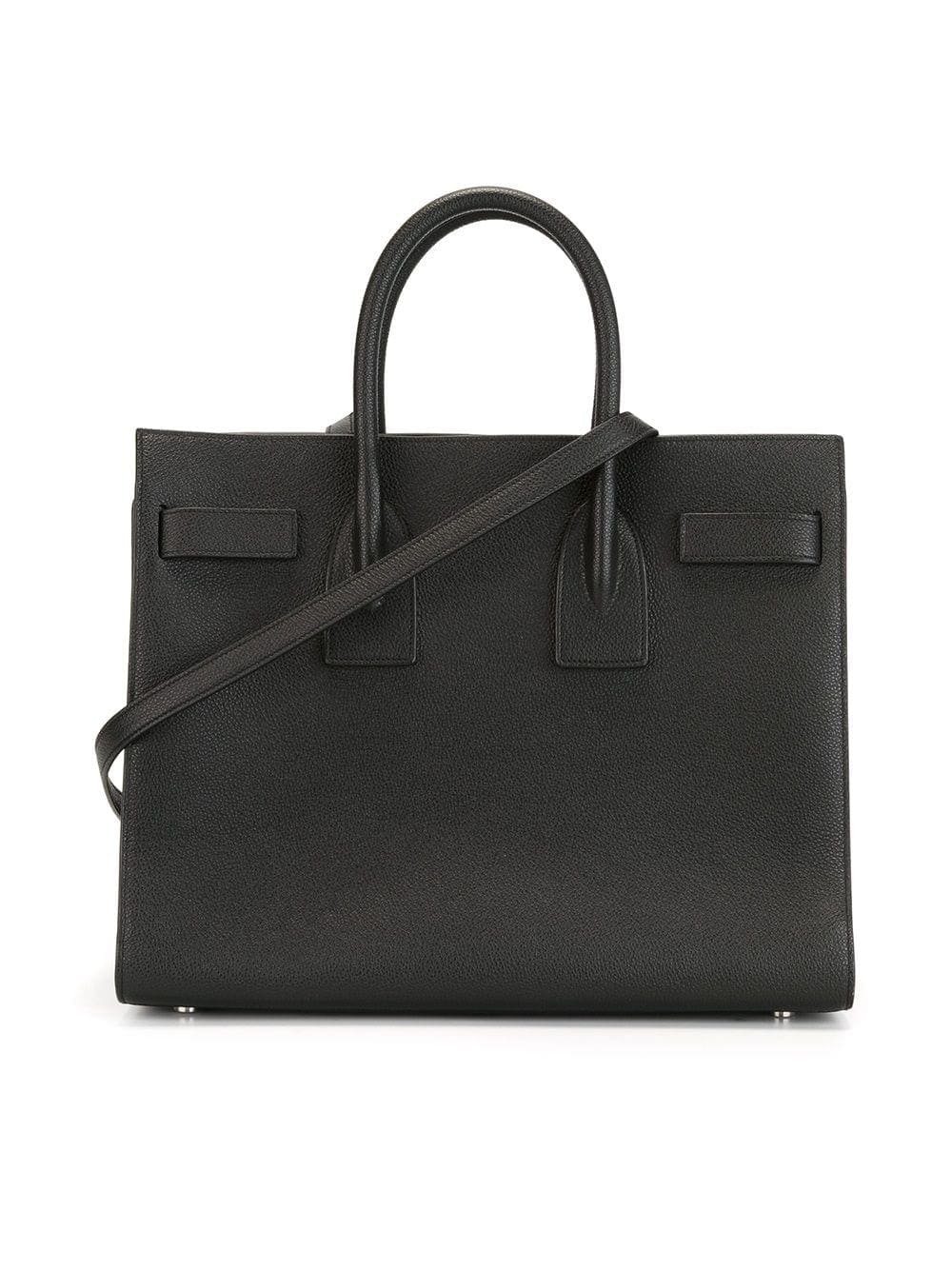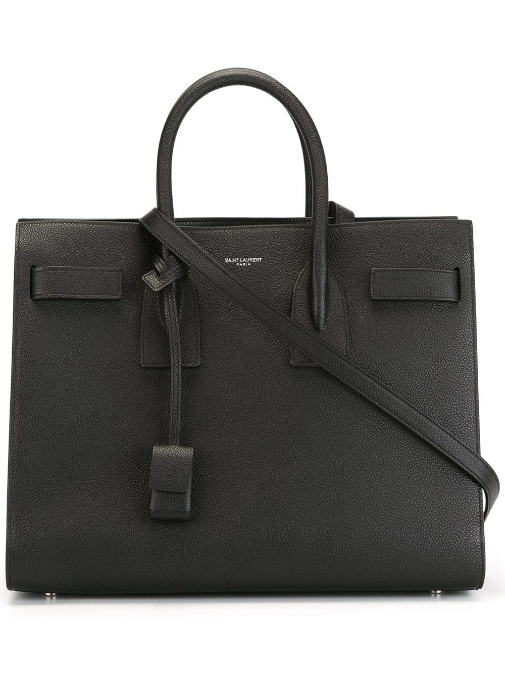 Well, regarding this Sac de Jour tote bag, there's not much we can add. Its name means "day bag" and we believe that pretty much sums everything about it. We'll be wearing this Saint Laurent baby day in, day in. Featuring silver-tone hardware, a front embossed logo stamp, a hanging key fob, purse feet, a square body, round top handles, a detachable and adjustable shoulder strap, accordion details at sides and an interior zipped compartment.