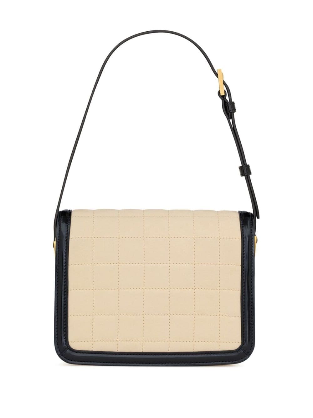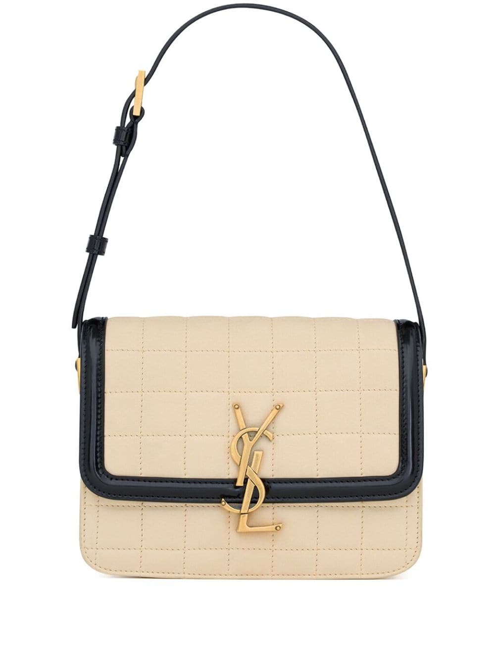 Named after a small town in Italy's Lombardy region, Saint Laurent's Solferino bag is characterised by its vintage-inspired quilted design. Part of the SS23 collection, this neutral iteration is trimmed with black leather and suspends from an adjustable shoulder strap. The Cassandre logo fastening appears front and centre, rendered in gold-tone metal.