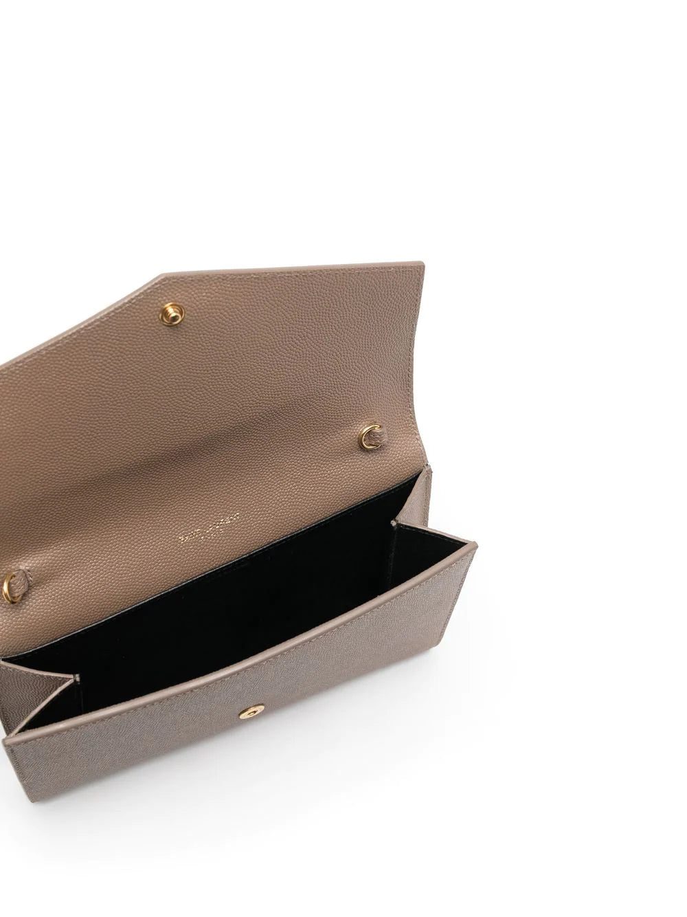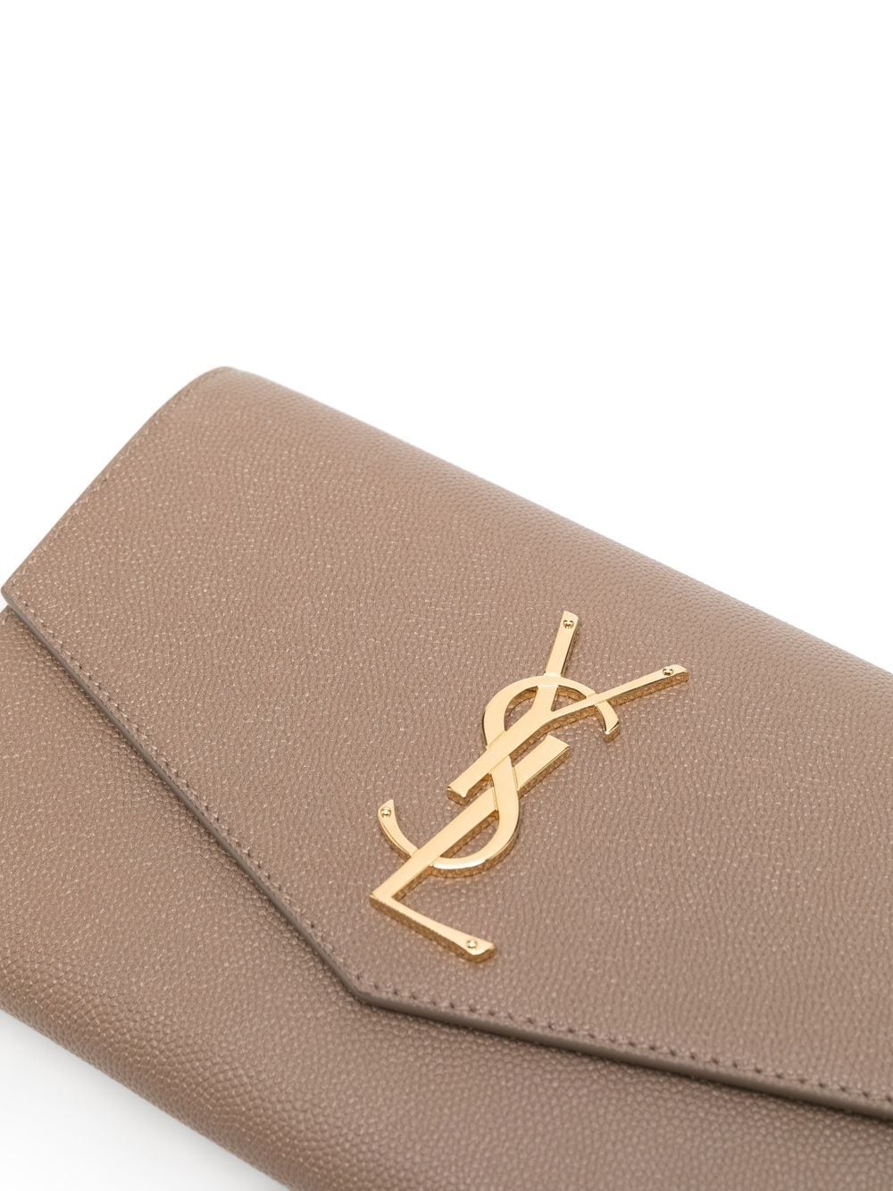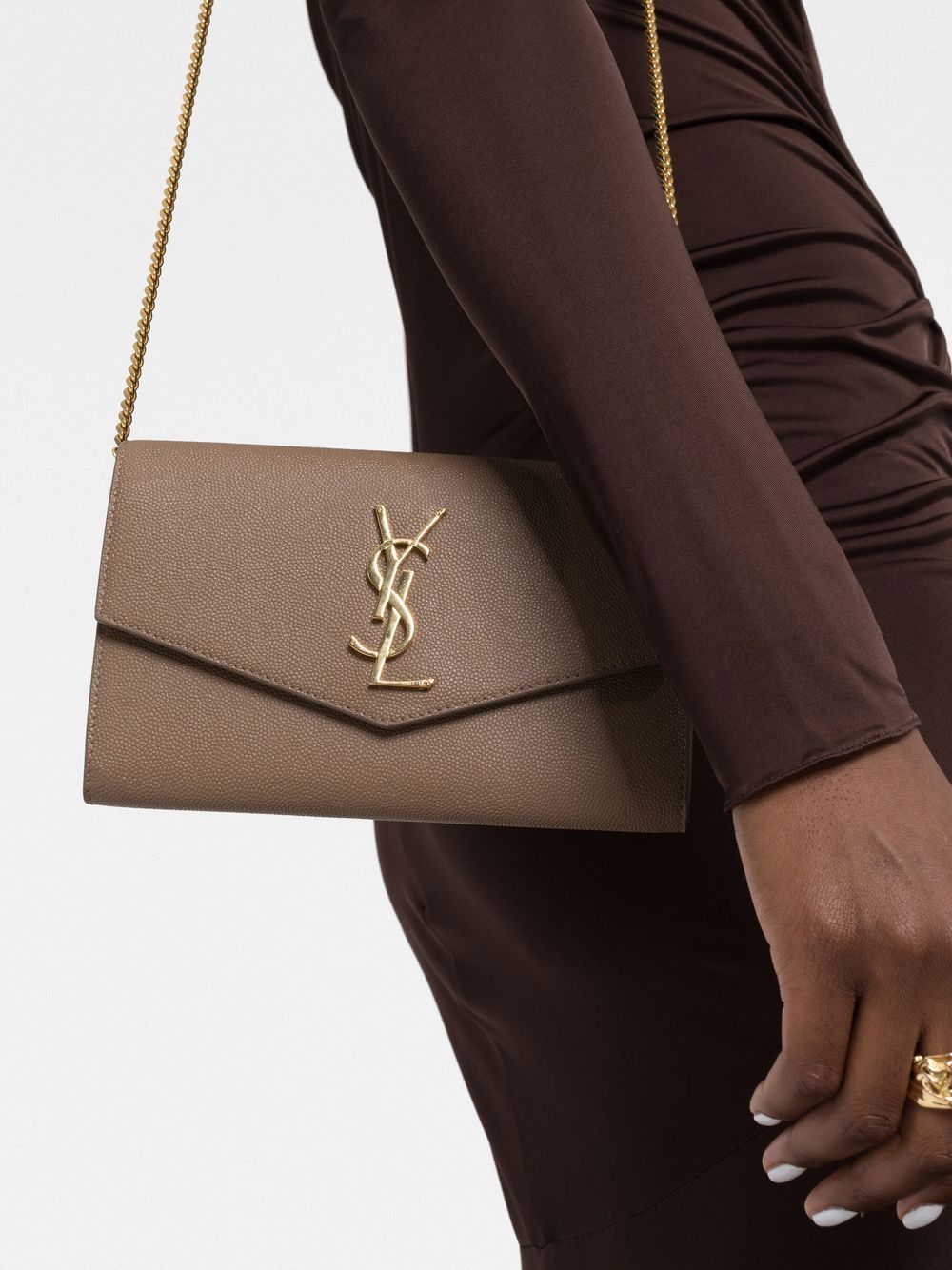 Uptown leather mini bag from SAINT LAURENT featuring beige, leather, gold-tone logo lettering, foldover top, snap-fit fastening, chain-link shoulder strap, main compartment and internal zip pocket.