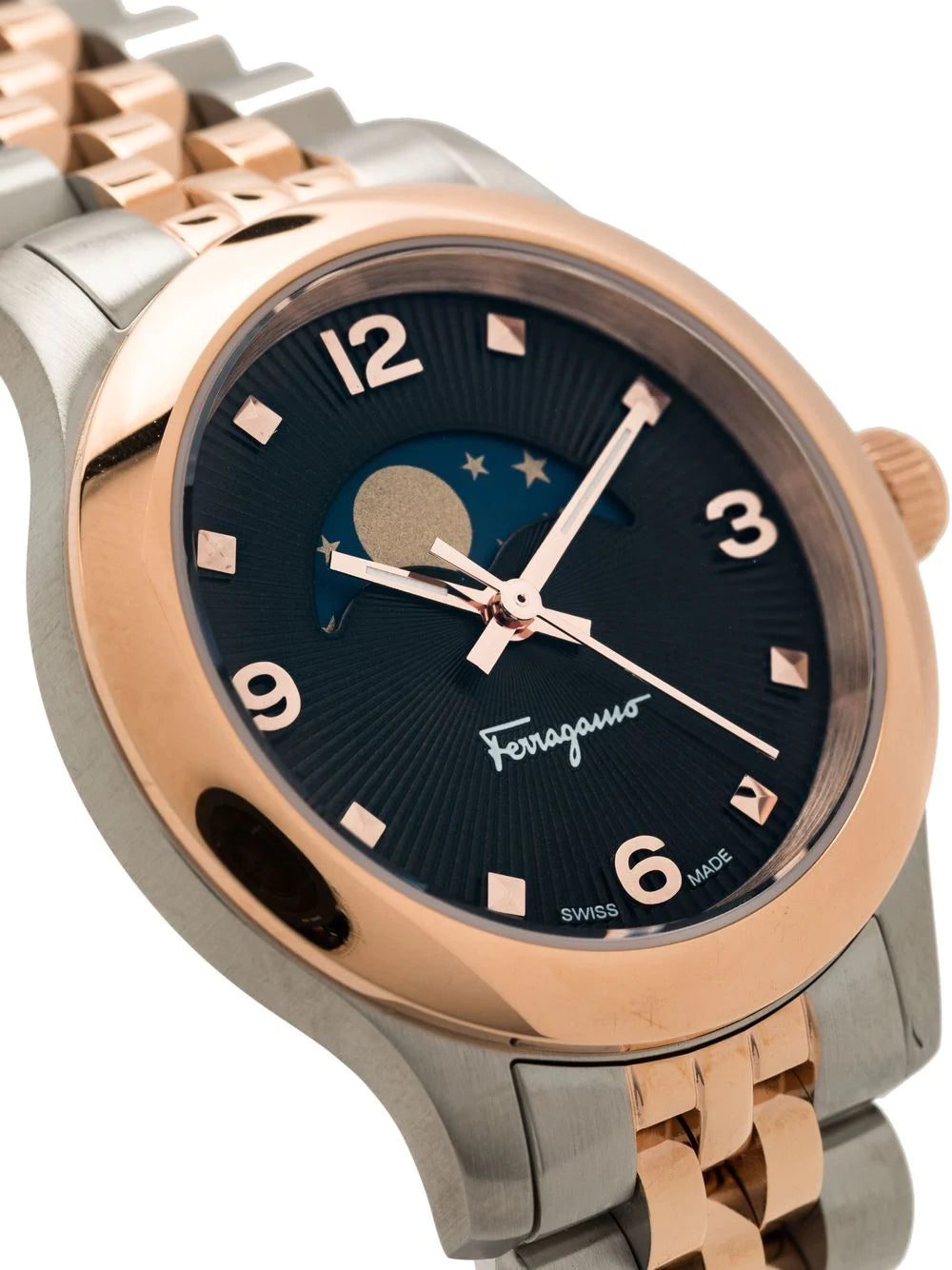 The Duo Moonphase 28mm combines impeccable Swiss watchmaking with Salvatore Ferragamo's penchant for innovative designs. This model is powered by a quartz movement to offer precision timekeeping with a sleek moonphase indication on the dial.