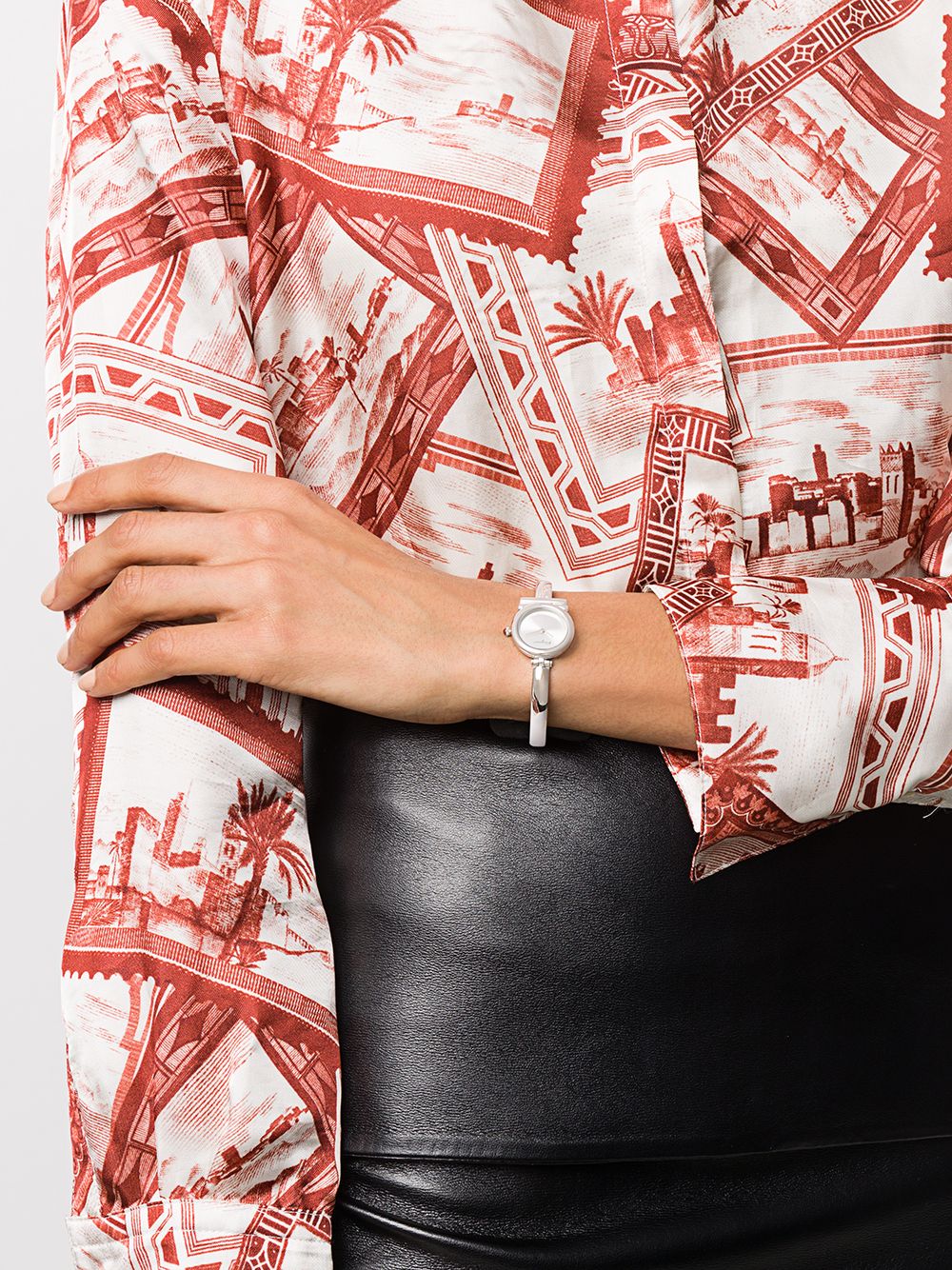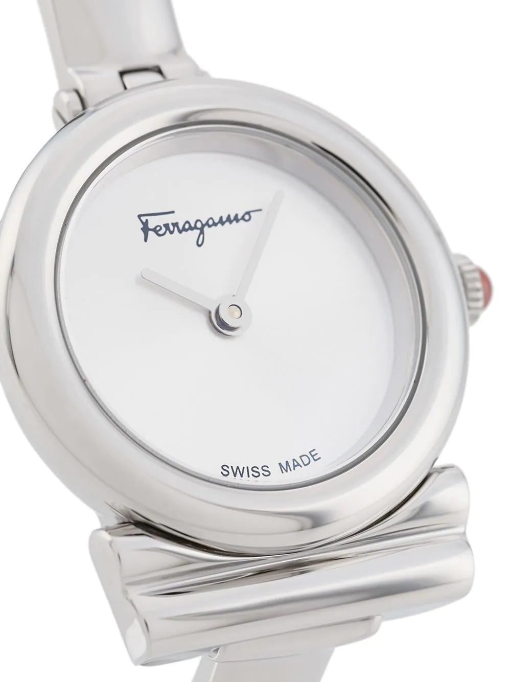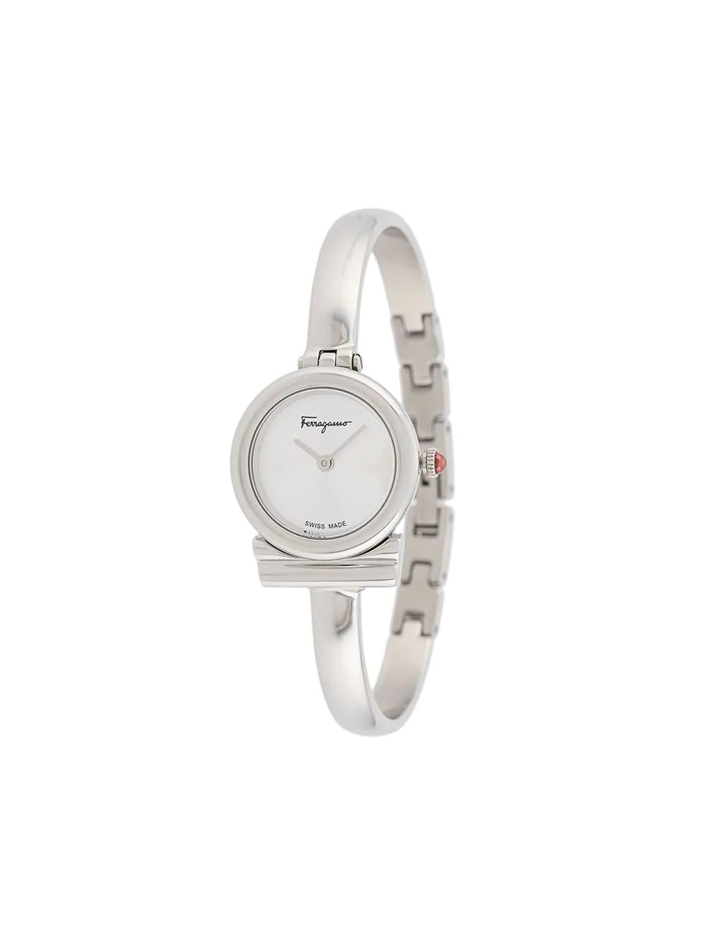 Silver-tone metal Gancini 22mm bangle watch from Salvatore Ferragamo Watches featuring a stainless steel case, a round face and a slip-on style.