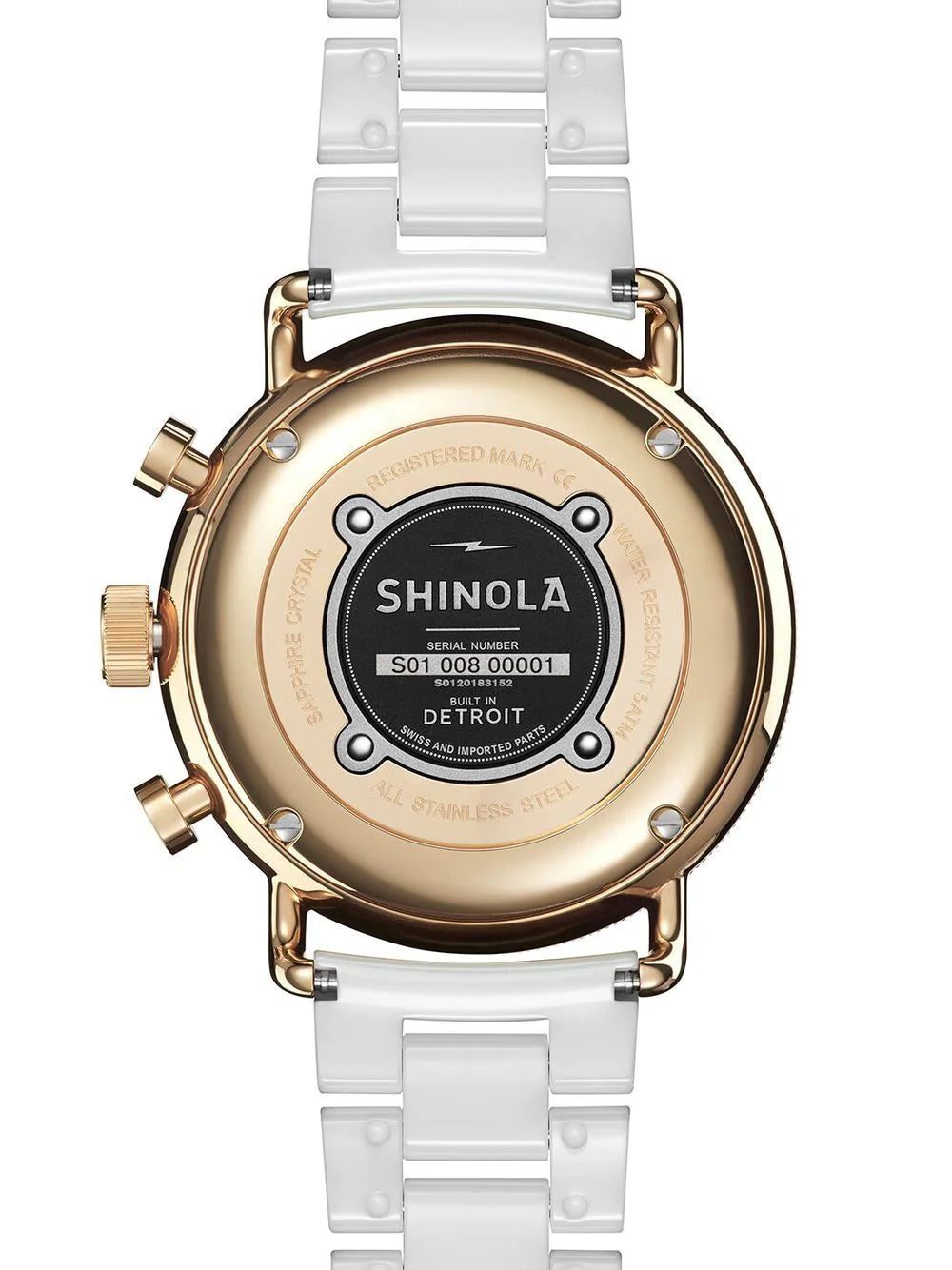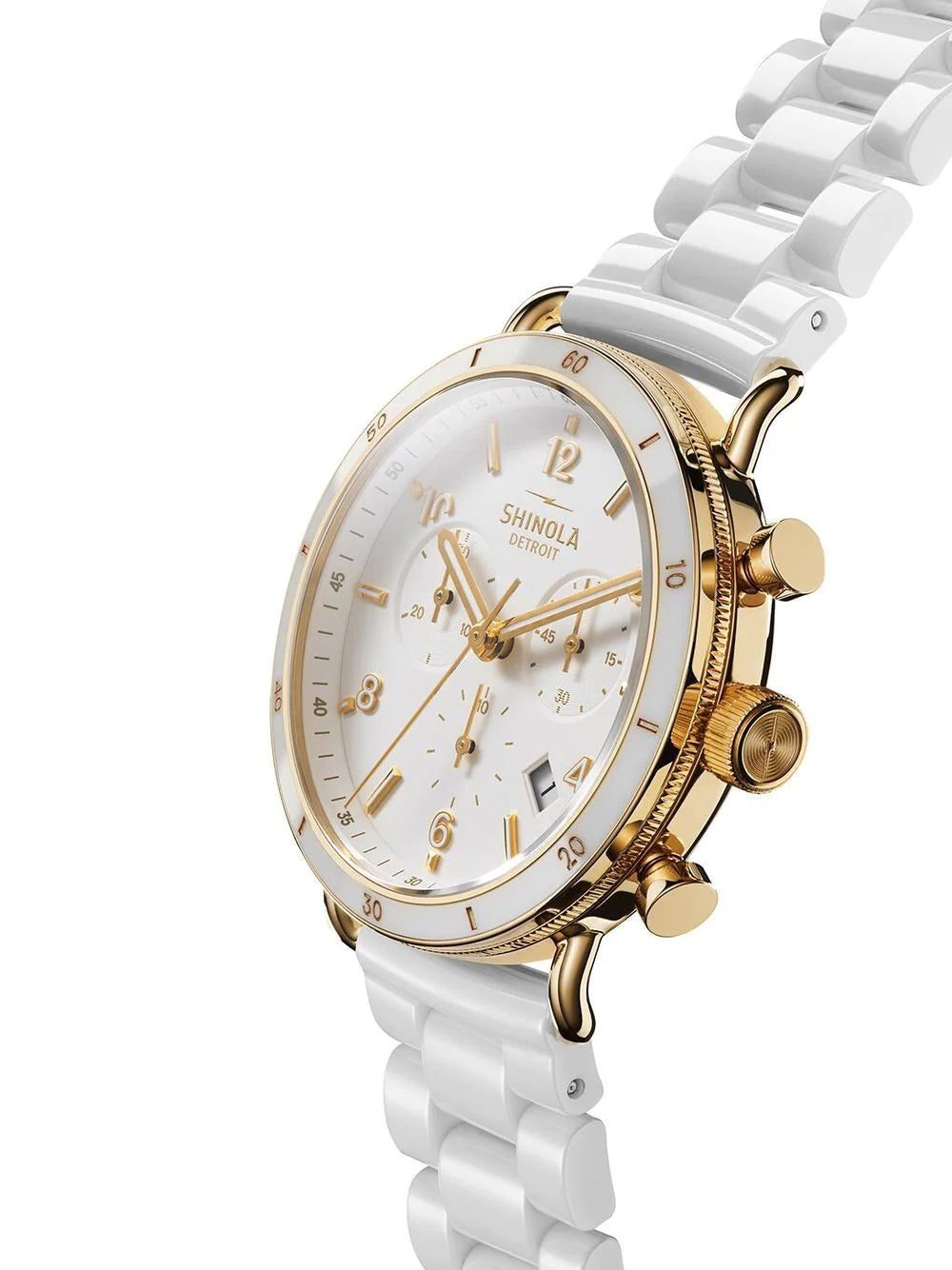 First launched in 2011 and based in Michigan, Shinola is focused on creating timepieces built to last. Arriving with a modern white-hued ceramic construction, The Canfield Sport 40mm reveals its sporty feel with a rotating bezel and chronograph counters.