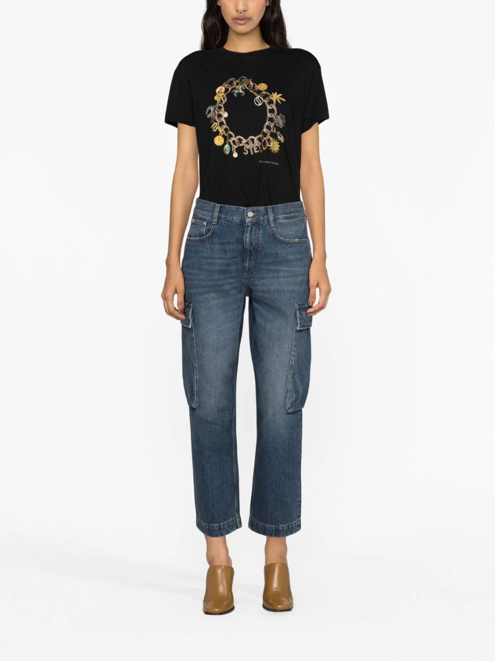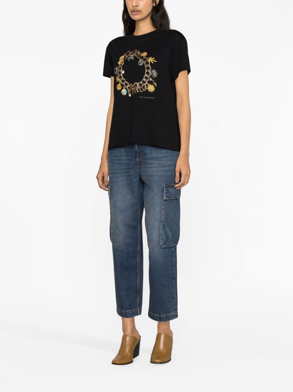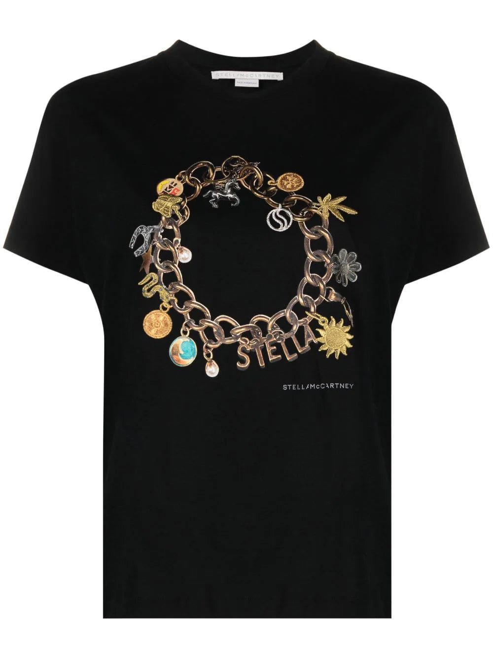 Made from sustainable cotton in Portugal, this black T-shirt from Stella McCartney is emblazoned with an illustration-style print of a charm necklace whilst embroidered accents add texture and dimension to its relaxed fit.