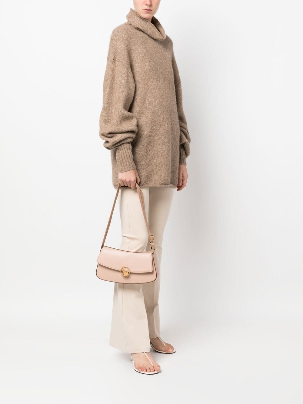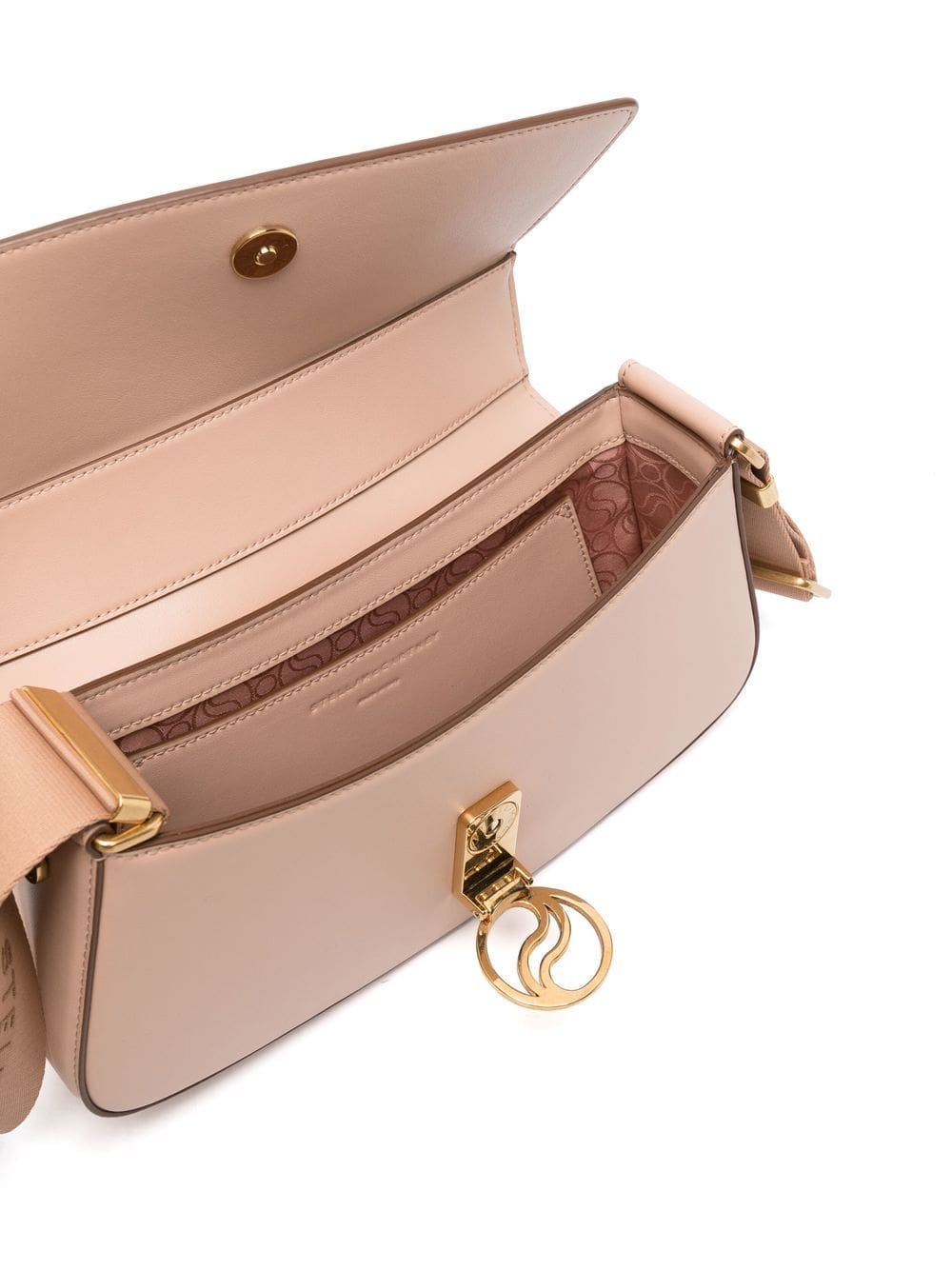 blush pink faux leather gold-tone hardware engraved logo front flap closure single shoulder strap main compartment Conscious: We've partnered with Good On You – an ethical agency that rates how sustainably brands perform. This product comes from a brand that performs well in relation to their impact on animals.