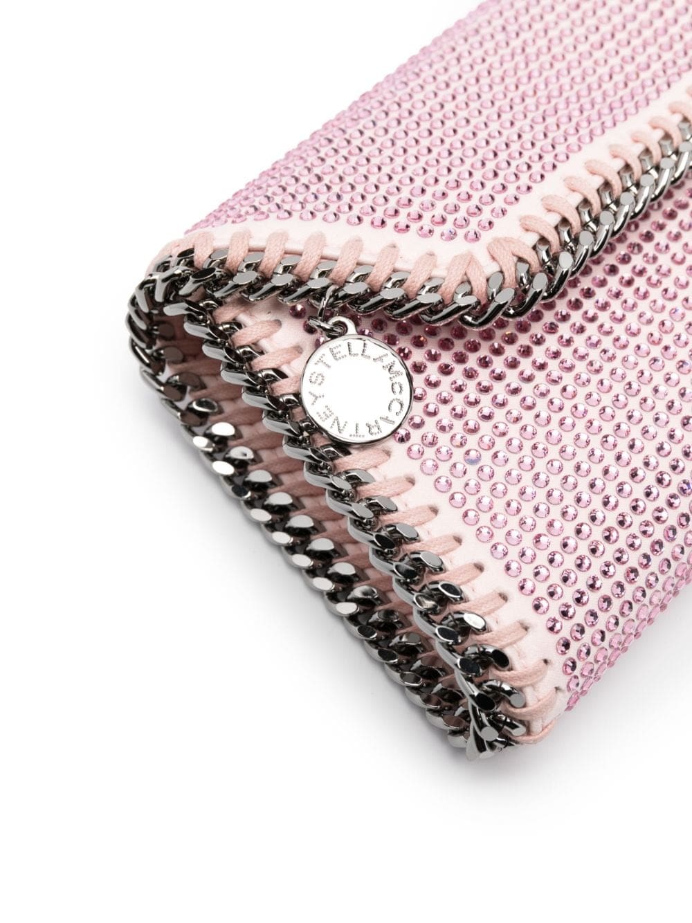 powder pink/silver-tone faux leather signature diamond-cut chain-link trim whipstitch detailing crystal embellishment logo charm silver-tone hardware front flap closure magnetic fastening internal slip pocket We've partnered with Good On You — an independent agency that rates how brands perform in relation to their impact on the planet, people and animals, with a multi-criteria rating simplified to a five points scale. In order to be awarded our conscious label, larger brands need to score a minimum of four out of five ('Good'), while smaller brands must score at least three out of five ('It's A Start'). This item comes from a brand rated three out of five ('It's A Start') by Good on You. Please note, this is a brand-level rating and does not guarantee that this product is made with conscious materials. Learn more about what makes a product Conscious on our Conscious Criteria page