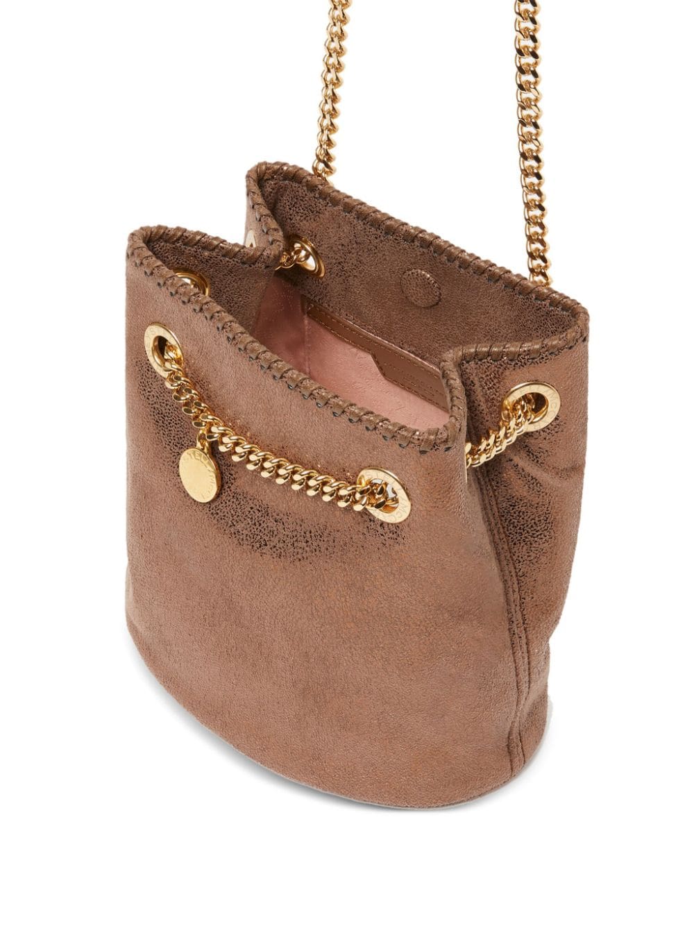Stella McCartney's iconic Falabella bag sees itself reinterpreted as a bucket design with this camel-brown iteration. Crafted from dotted Shaggy Deer faux leather with a metallic finish, it boasts a cylindrical silhouette fitted with a spacious main compartment and a diamond-cut chain-link shoulder strap, echoing the iconic whipstitch chain trim of the original.