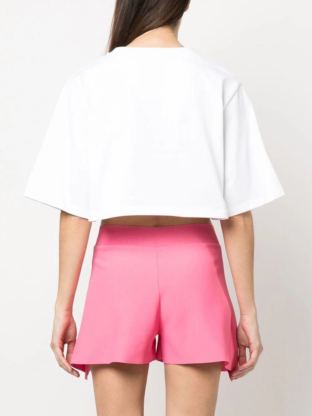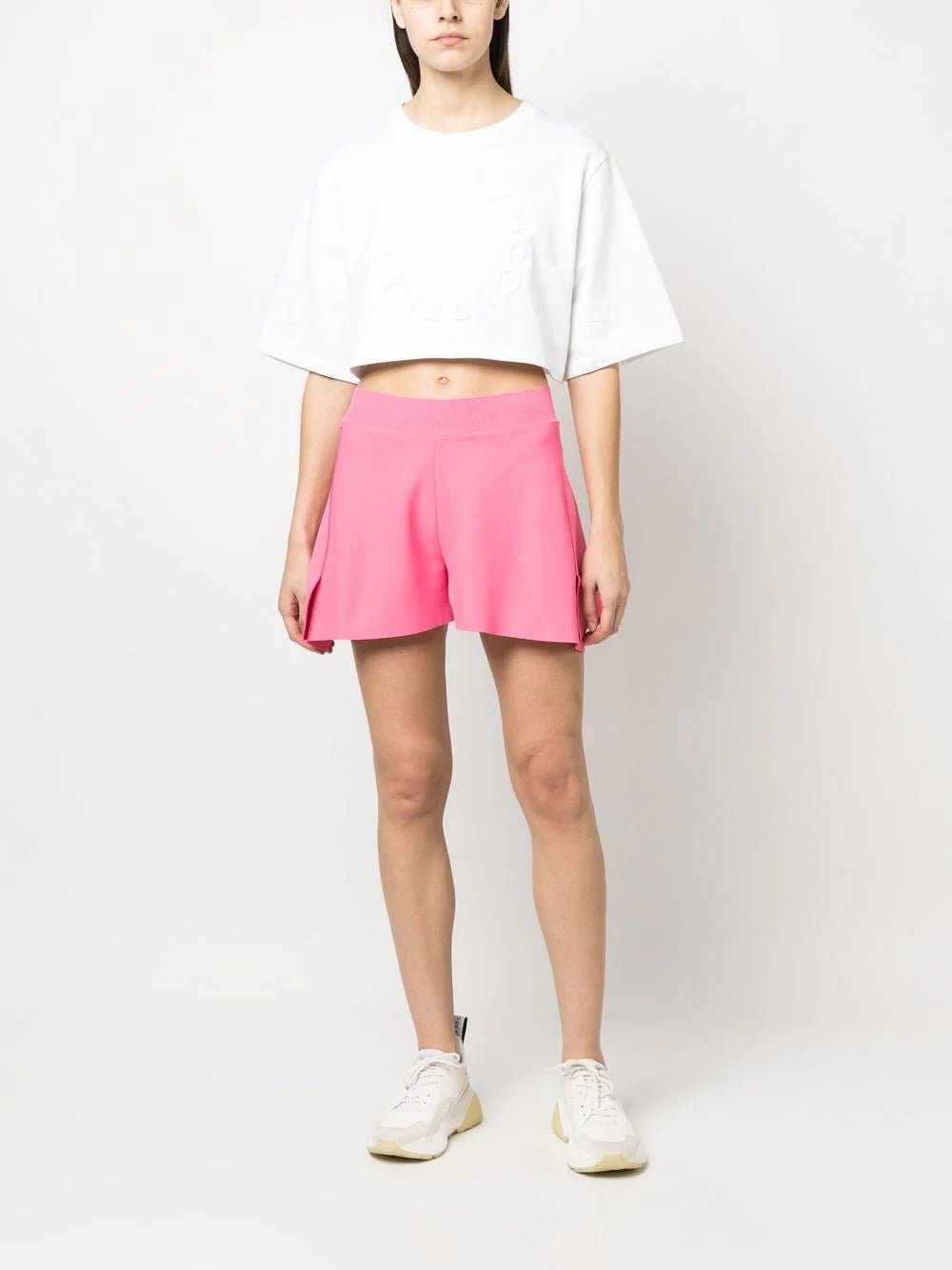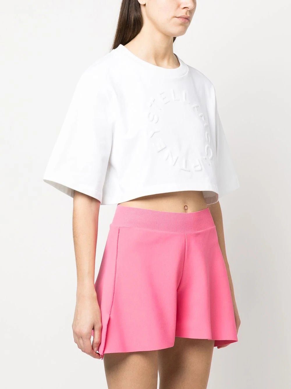 flocked-logo cropped T-shirt from STELLA MCCARTNEY featuring white, cotton, jersey knit, flocked logo, crew neck, short sleeves, straight hem and cropped. Conscious: We've partnered with Good On You – an ethical agency that rates how sustainably brands perform. This product comes from a brand that performs well in relation to their impact on animals..